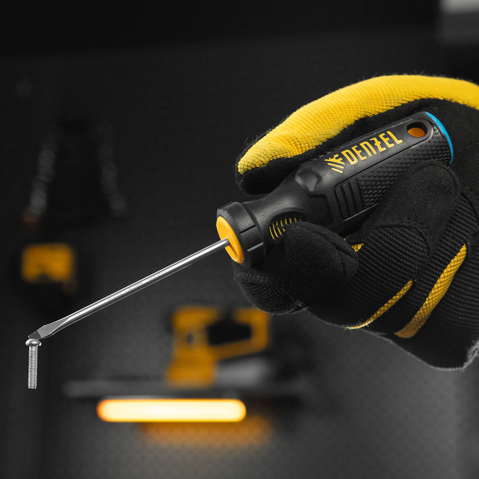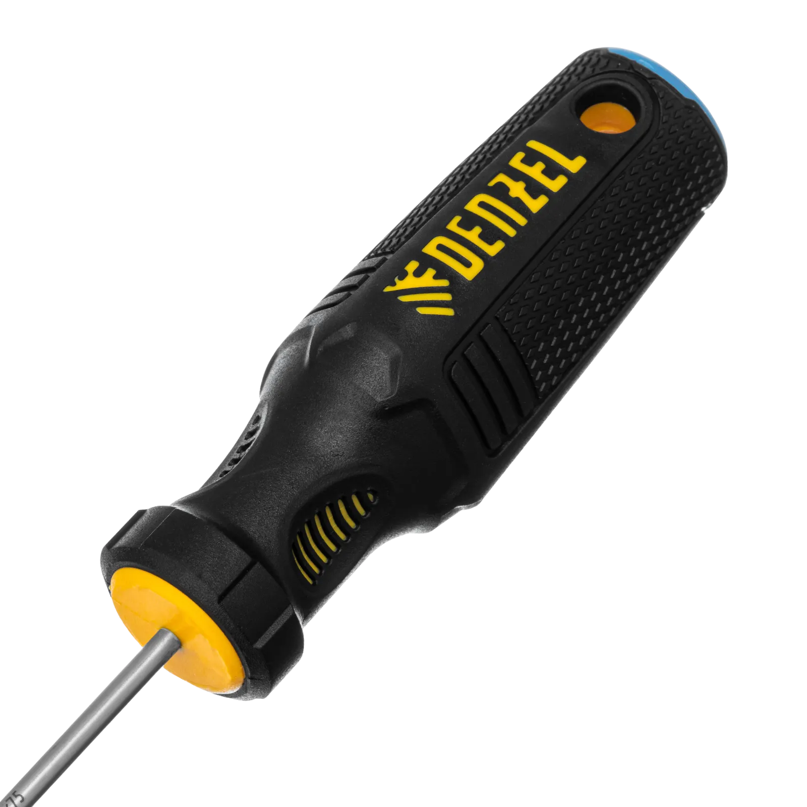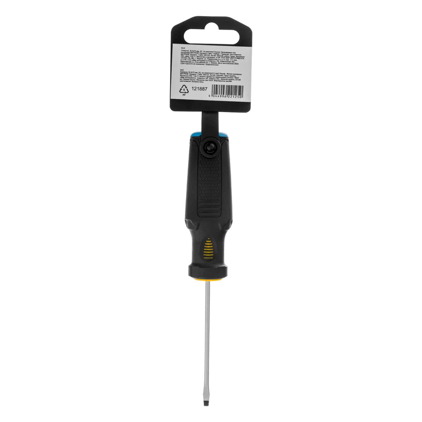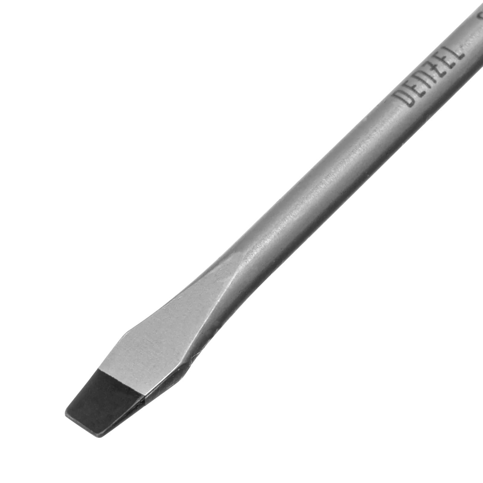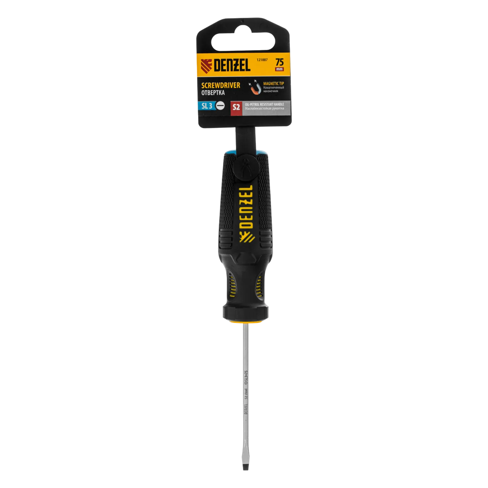 Отвертка Denzel 121887 с трехкомпонентной рукояткой, со стержнем из стали S2, длиной 75 мм, предназначена для монтажа и демонтажа винтов и саморезов с прямым шлицем SL3. Высокоточный намагниченный шлиц крепко фиксируется в головке крепежа. Отвертка выдерживает интенсивное применение, предназначена для выполнения профессиональных ремонтных и монтажных работ.