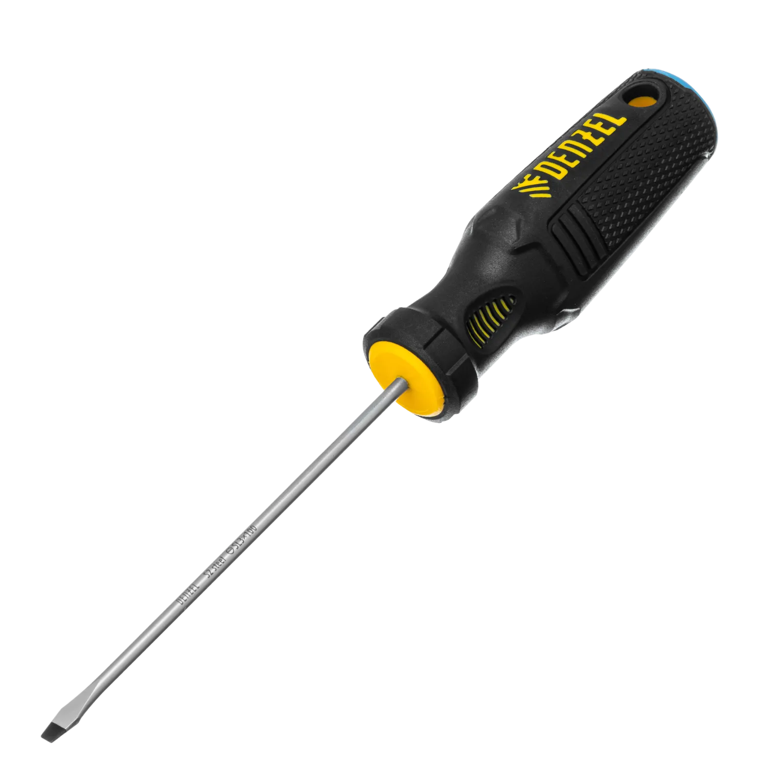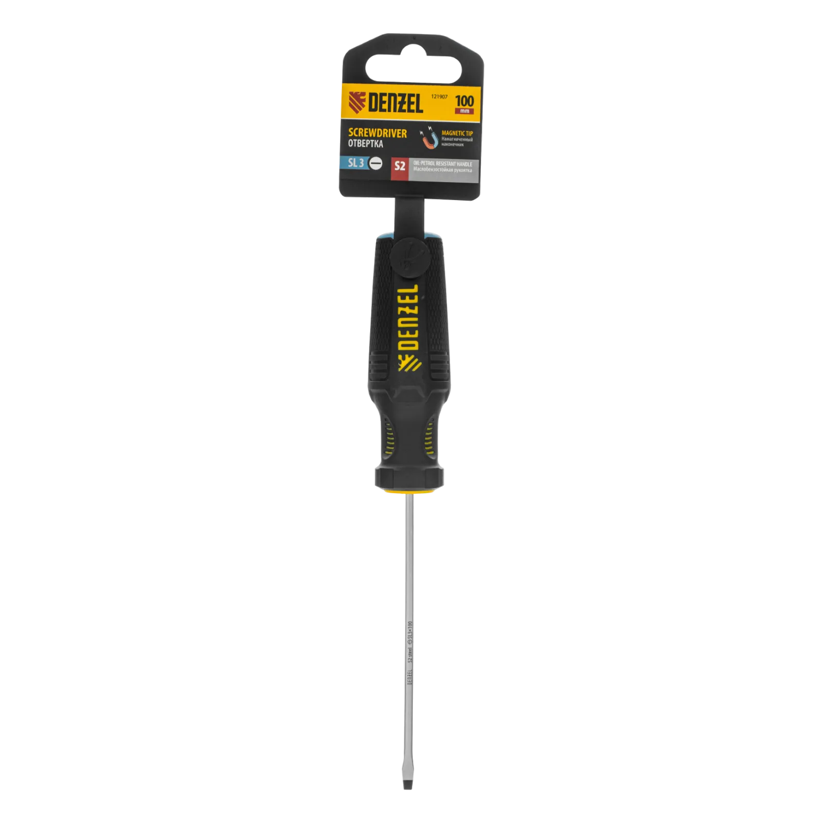 Отвертка Denzel 121907 с трехкомпонентной рукояткой, со стержнем из стали S2, длиной 100 мм, предназначена для монтажа и демонтажа винтов и саморезов с прямым шлицем SL3. Высокоточный намагниченный шлиц крепко фиксируется в головке крепежа. Отвертка выдерживает интенсивное применение, предназначена для выполнения профессиональных ремонтных и монтажных работ.