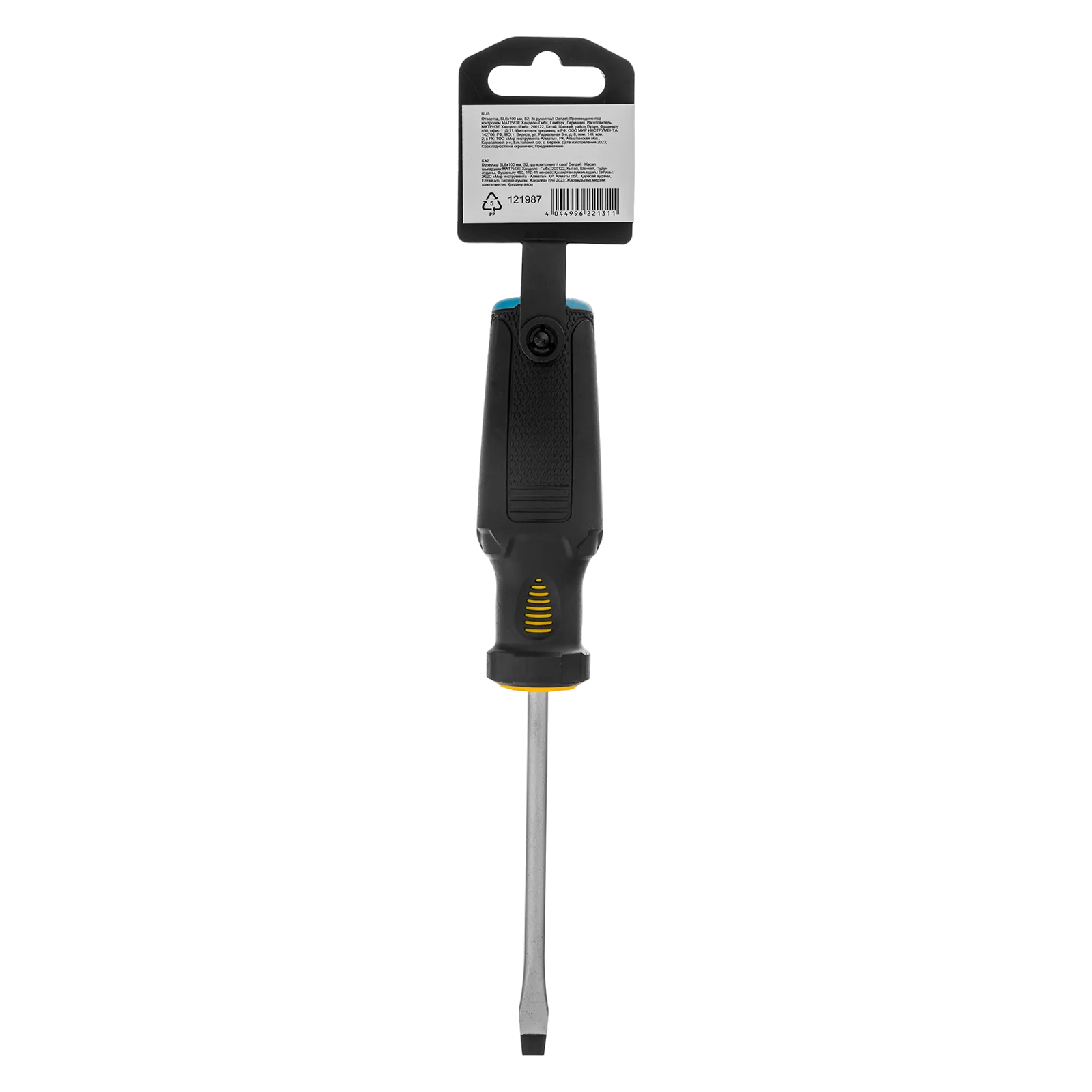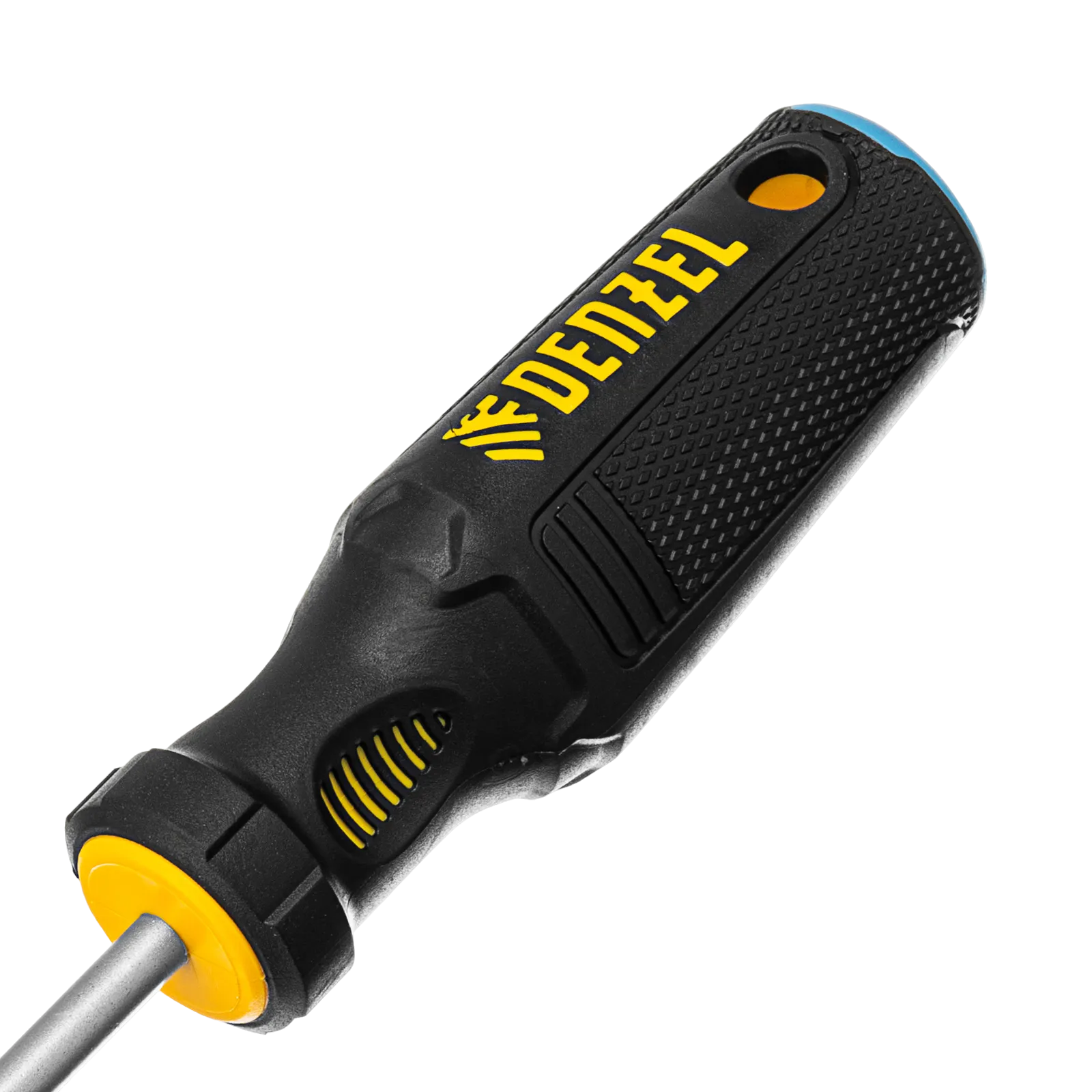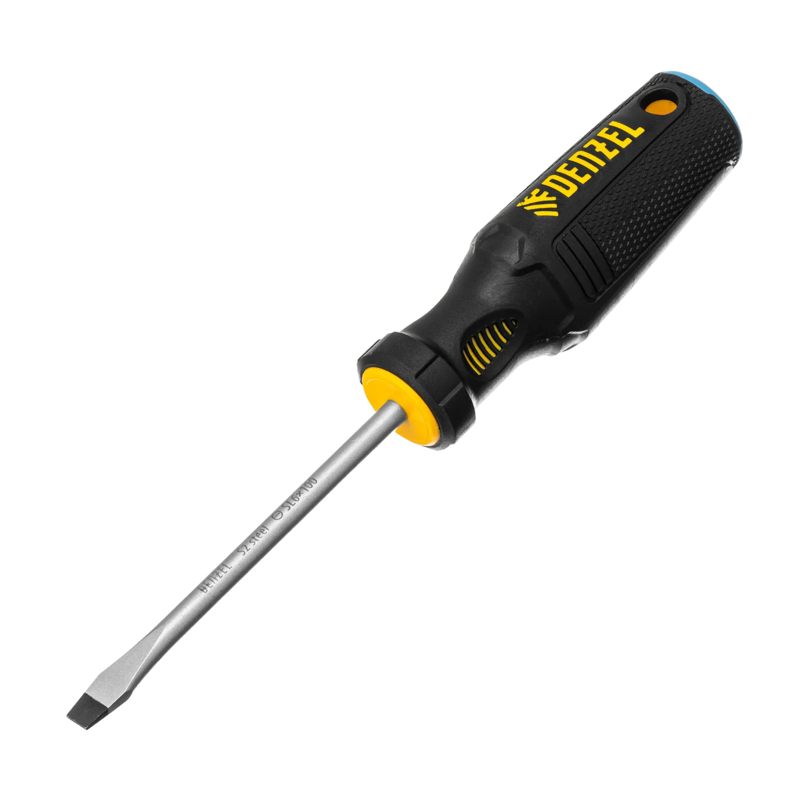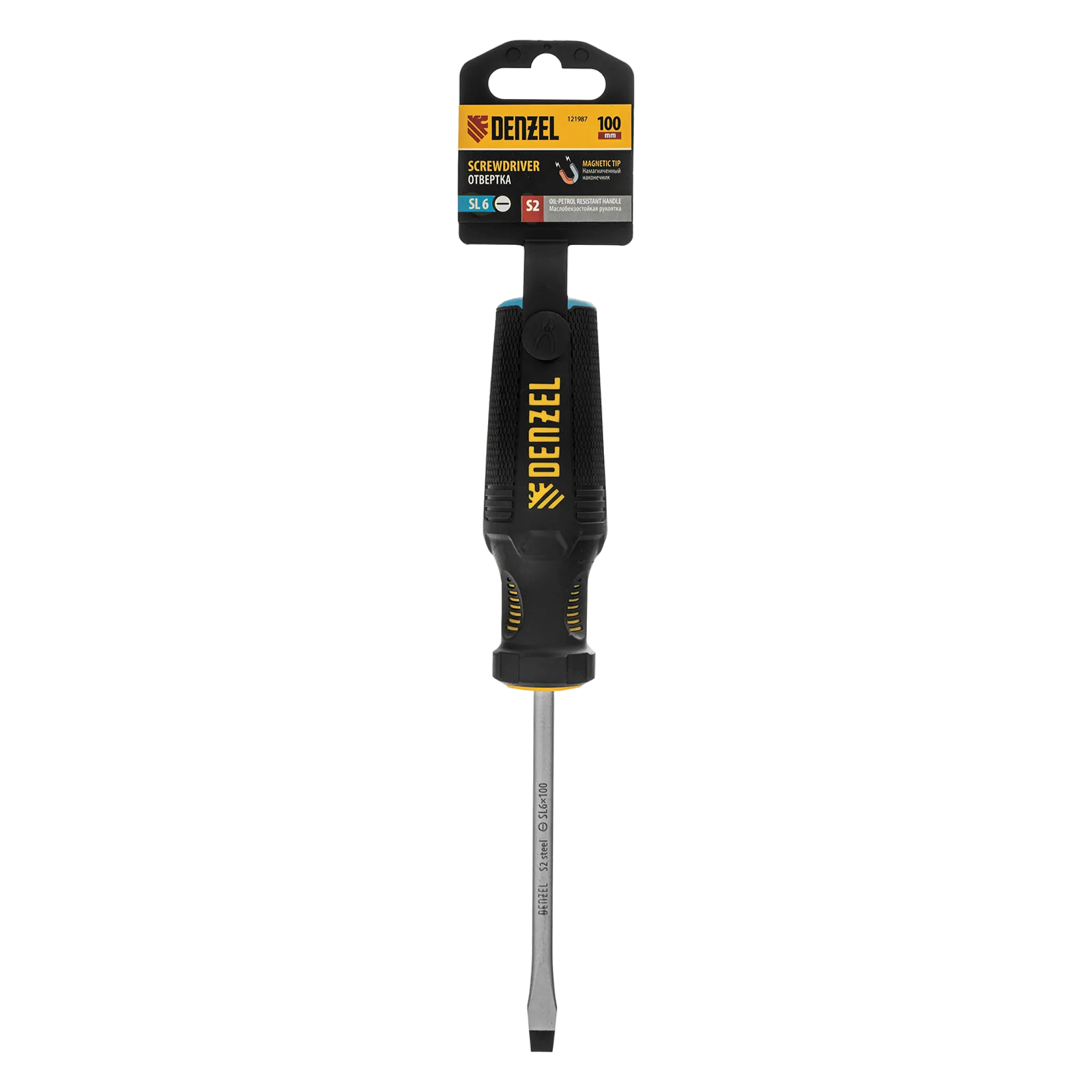 Отвертка Denzel 121987 с трехкомпонентной рукояткой, со стержнем из стали S2, длиной 100 мм, предназначена для монтажа и демонтажа винтов и саморезов с прямым шлицем SL6. Высокоточный намагниченный шлиц крепко фиксируется в головке крепежа. Отвертка выдерживает интенсивное применение, предназначена для выполнения профессиональных ремонтных и монтажных работ.