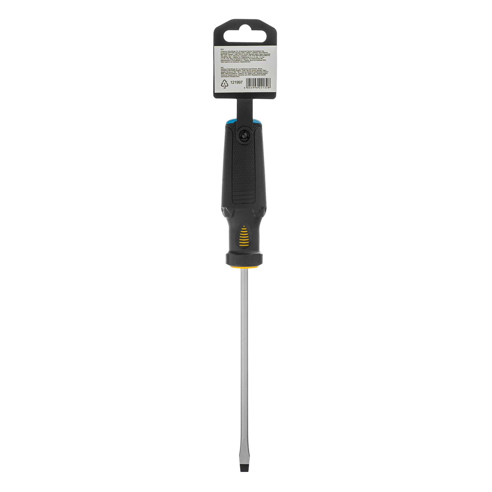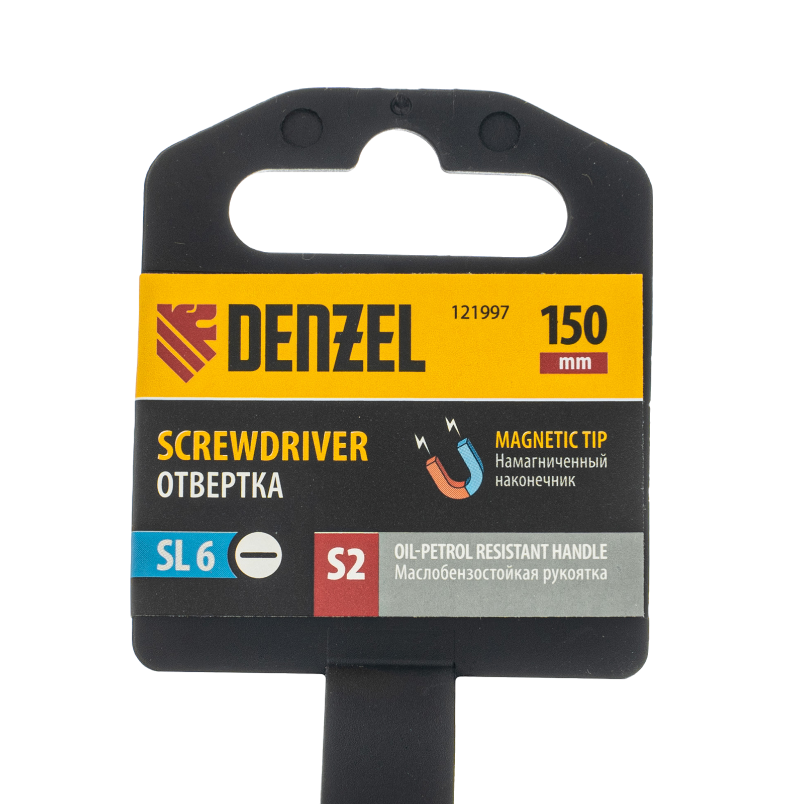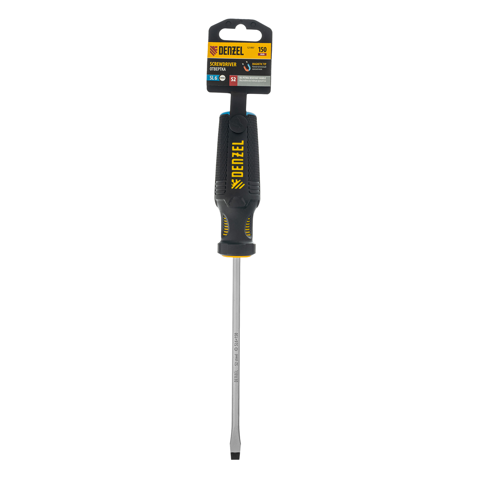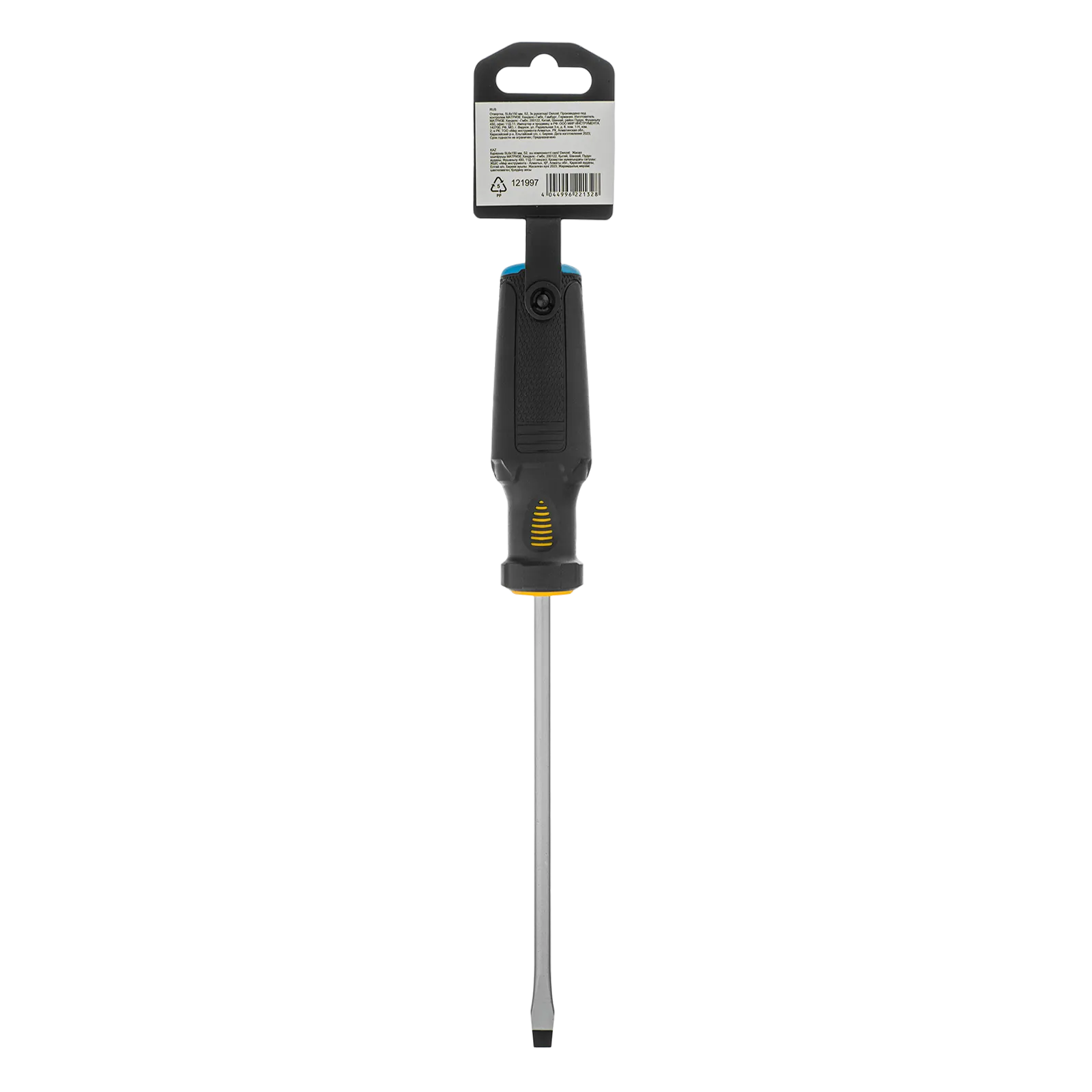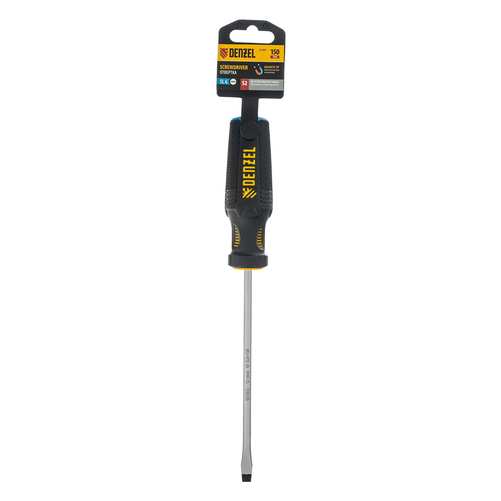 Отвертка Denzel 121997 с трехкомпонентной рукояткой, со стержнем из стали S2, длиной 150 мм, предназначена для монтажа и демонтажа винтов и саморезов с прямым шлицем SL6. Высокоточный намагниченный шлиц крепко фиксируется в головке крепежа. Отвертка выдерживает интенсивное применение, предназначена для выполнения профессиональных ремонтных и монтажных работ.