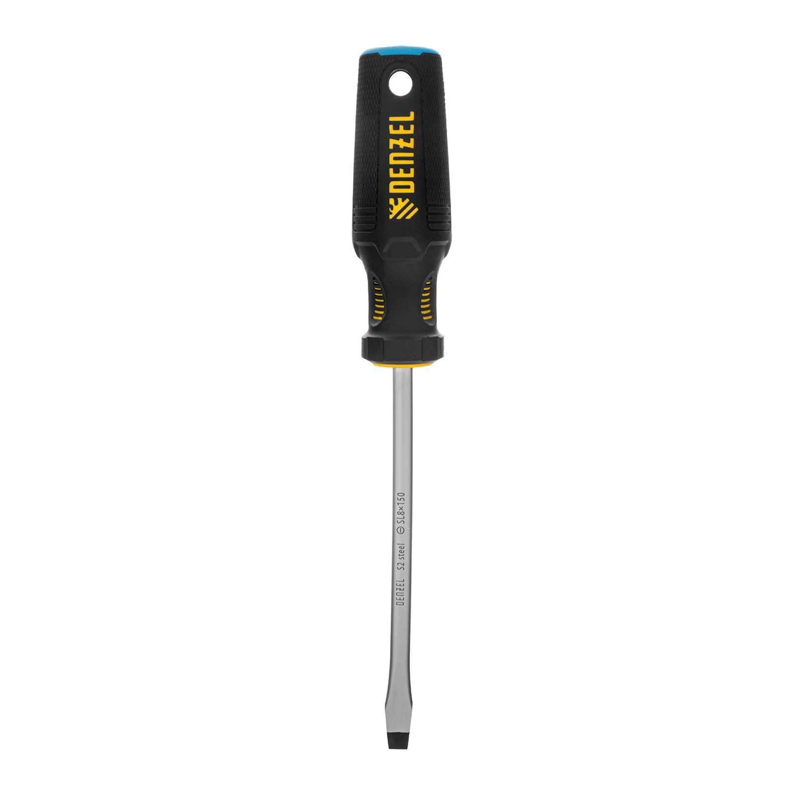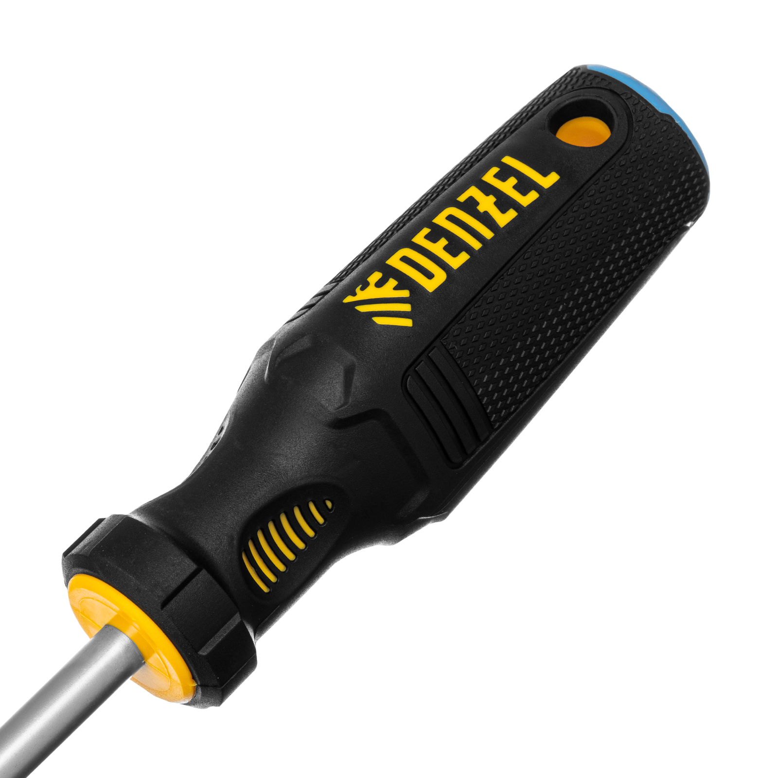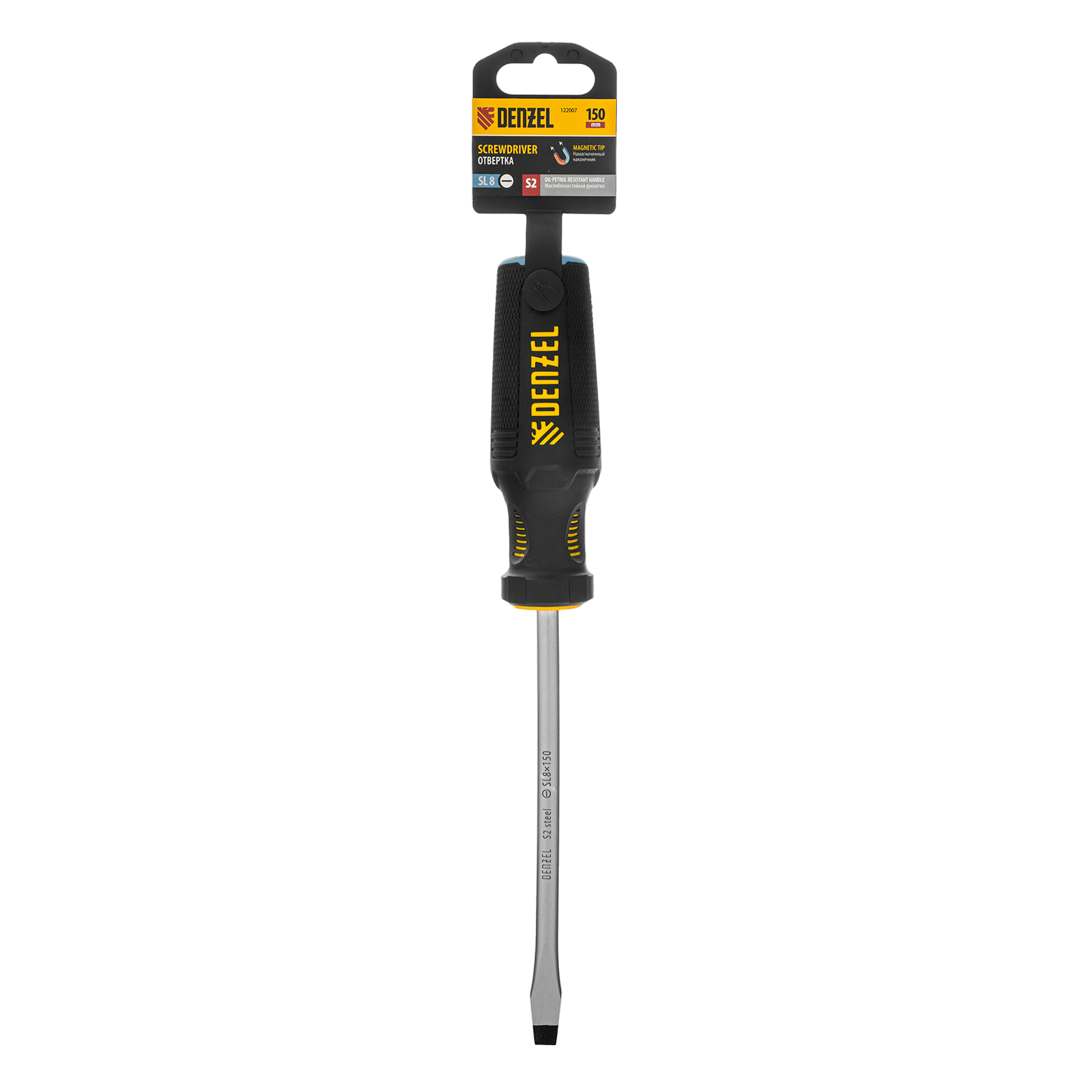 Отвертка Denzel 122007 с трехкомпонентной рукояткой, со стержнем из стали S2, длиной 150 мм, предназначена для монтажа и демонтажа винтов и саморезов с прямым шлицем SL8. Высокоточный намагниченный шлиц крепко фиксируется в головке крепежа. Отвертка выдерживает интенсивное применение, предназначена для выполнения профессиональных ремонтных и монтажных работ.