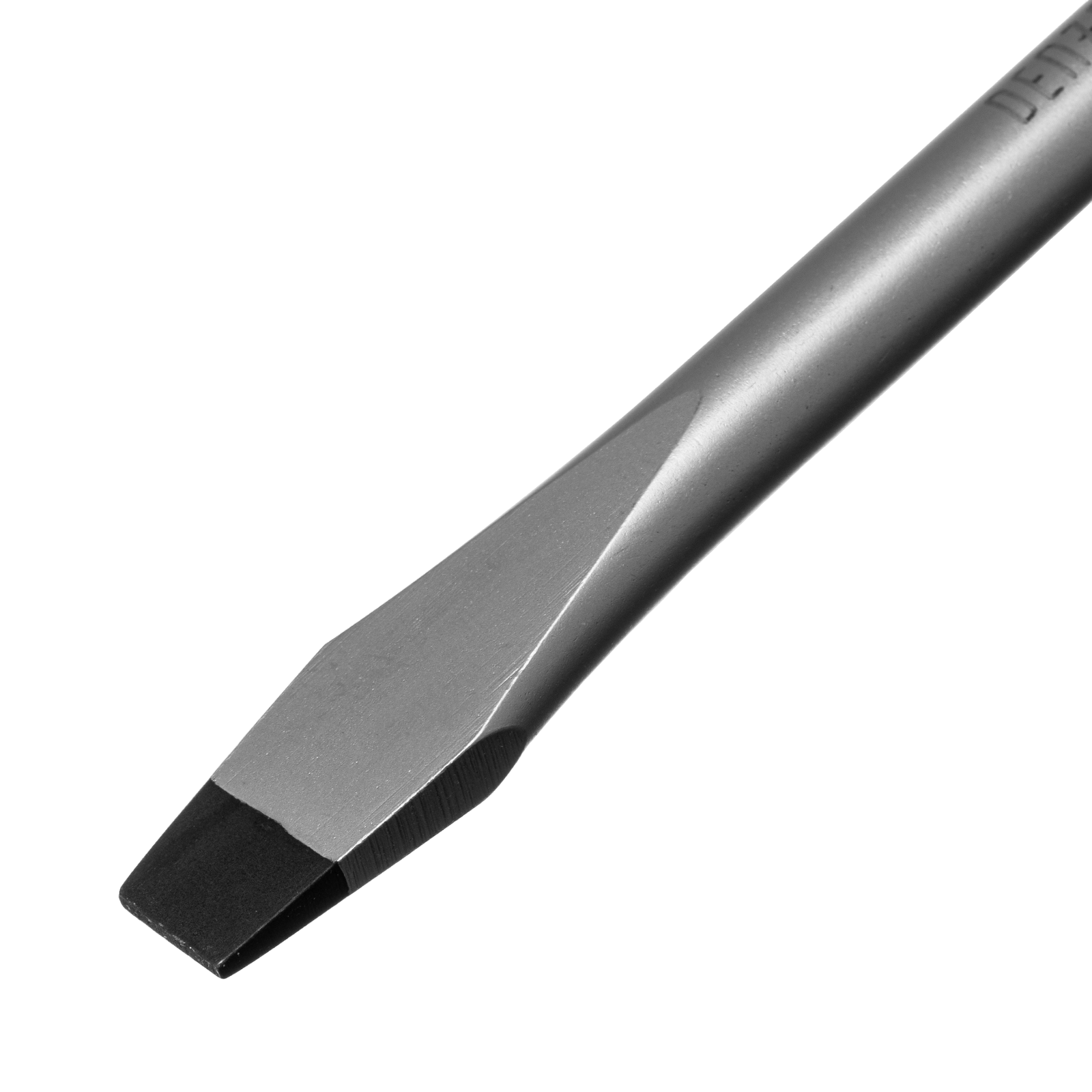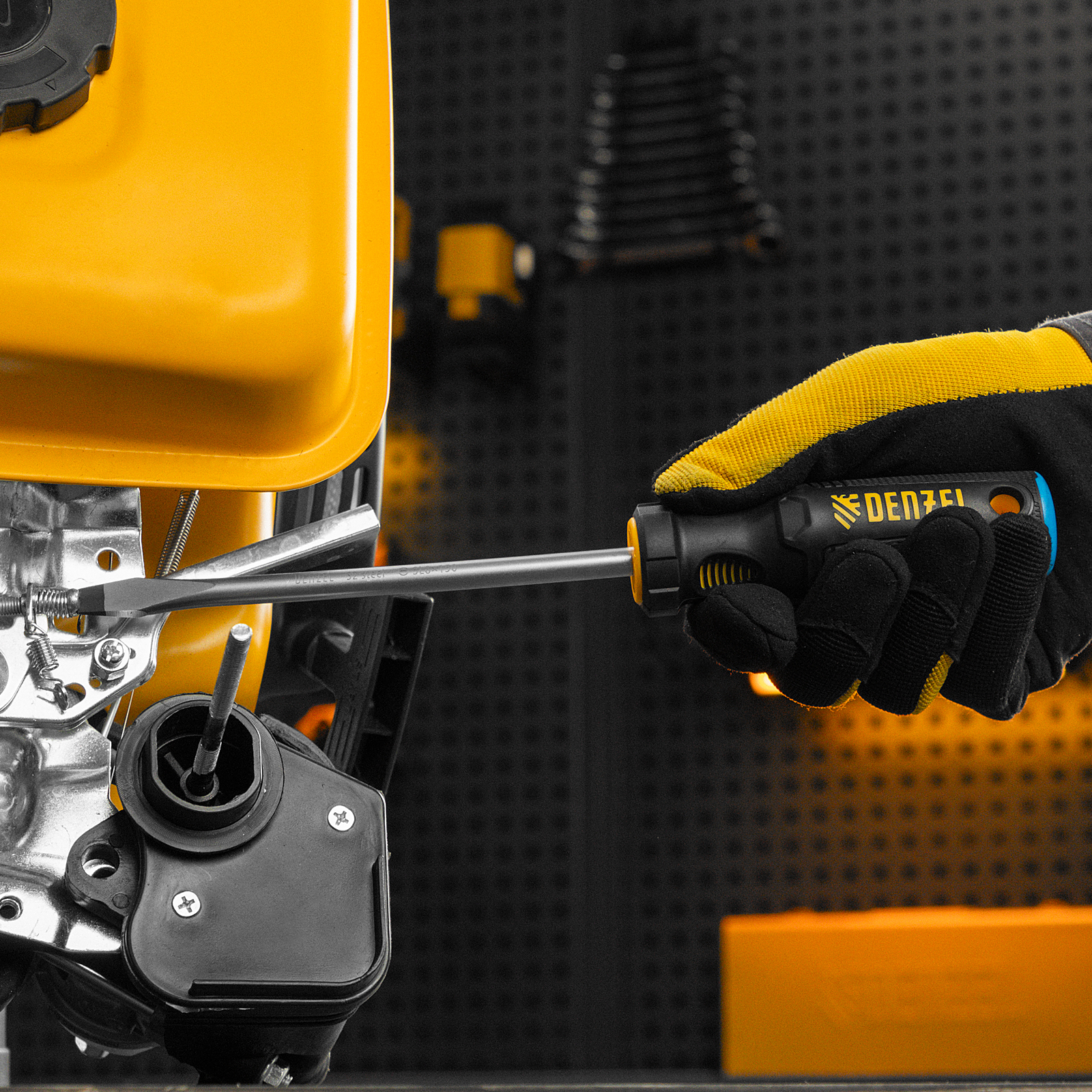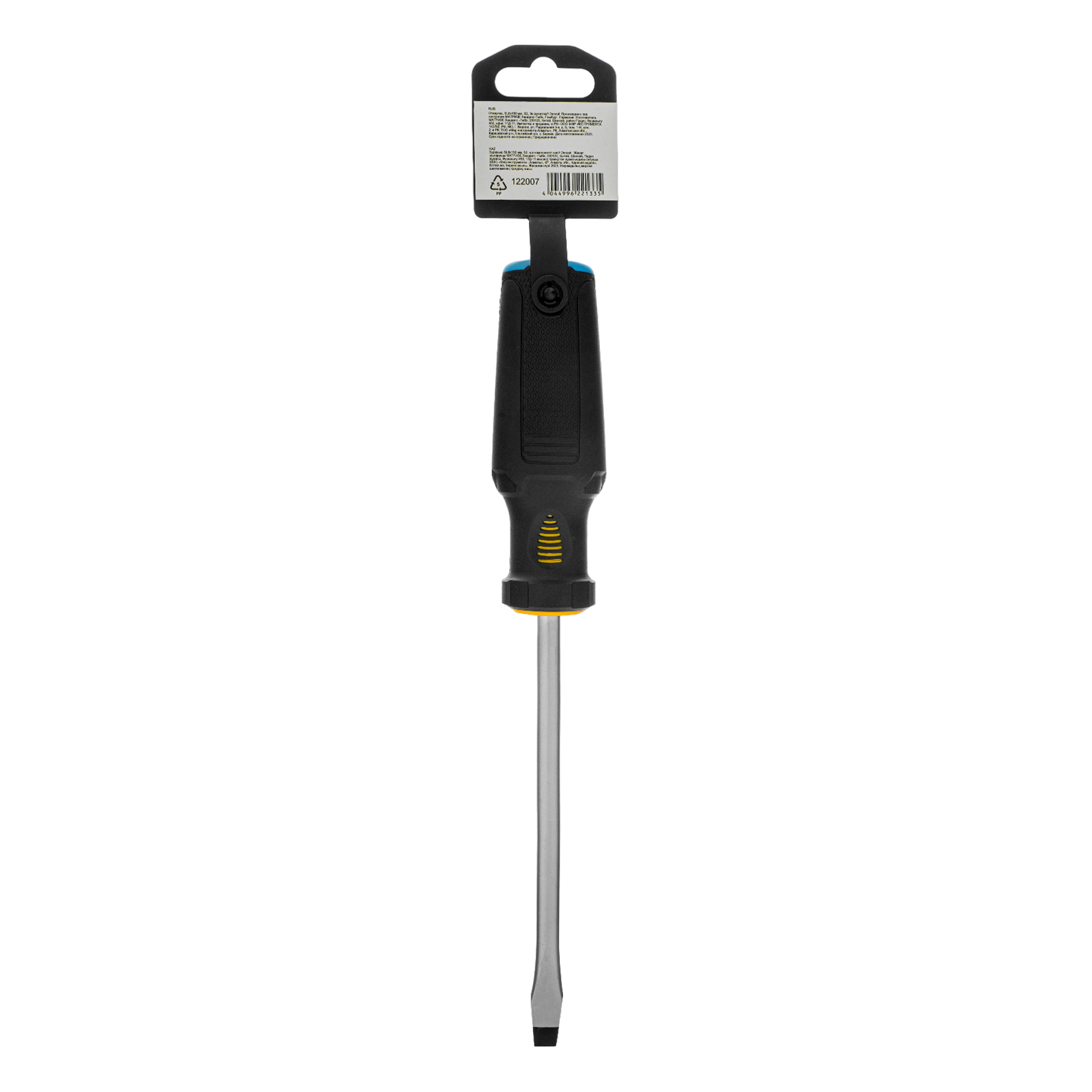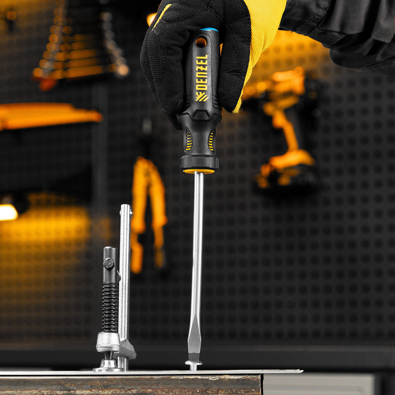 Отвертка Denzel 122007 с трехкомпонентной рукояткой, со стержнем из стали S2, длиной 150 мм, предназначена для монтажа и демонтажа винтов и саморезов с прямым шлицем SL8. Высокоточный намагниченный шлиц крепко фиксируется в головке крепежа. Отвертка выдерживает интенсивное применение, предназначена для выполнения профессиональных ремонтных и монтажных работ.