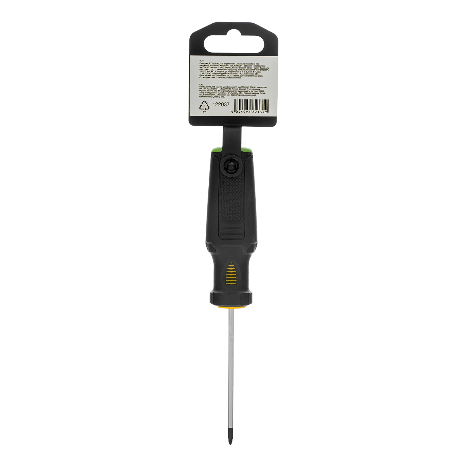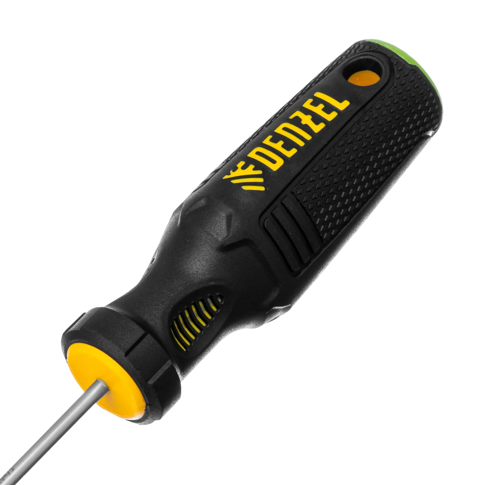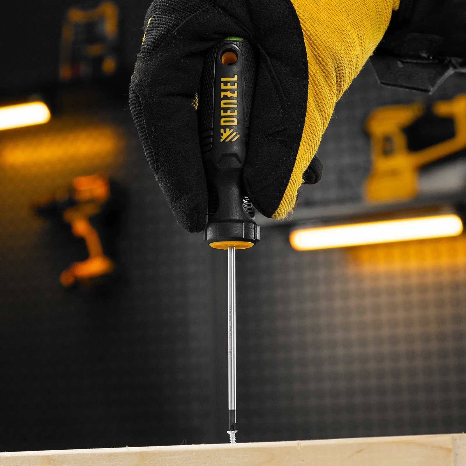 Отвертка Denzel 122037 с трехкомпонентной рукояткой, со стержнем из стали S2, длиной 75 мм, имеет шлиц PZ0 и предназначена для монтажных и демонтажных работ с резьбовыми соединениями типа Pozidriv. Благодаря намагниченному высокоточному шлицу отвертку с крепежом можно направлять одной рукой, удерживая другой закрепляемую деталь. Инструмент подходит для профессионального использования.