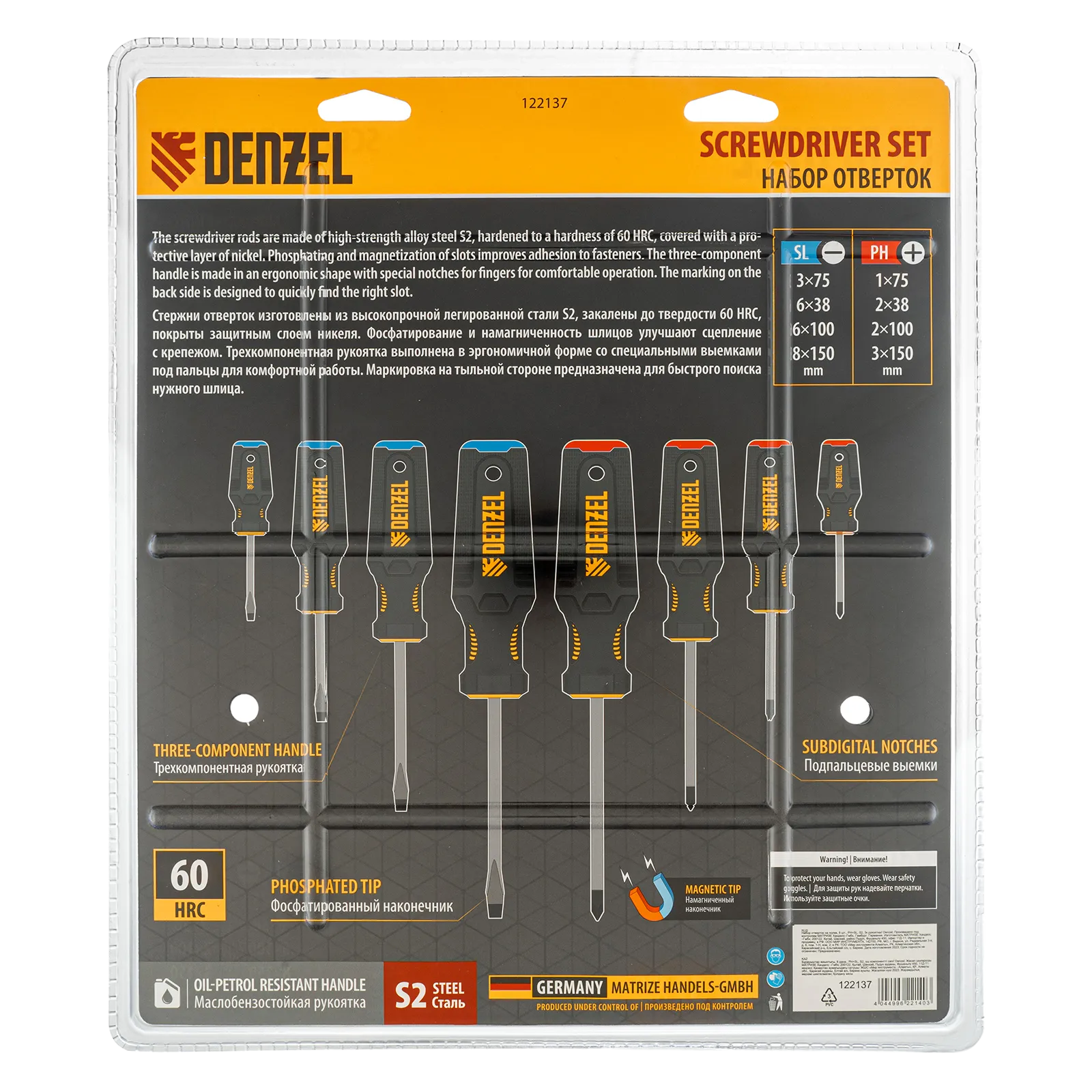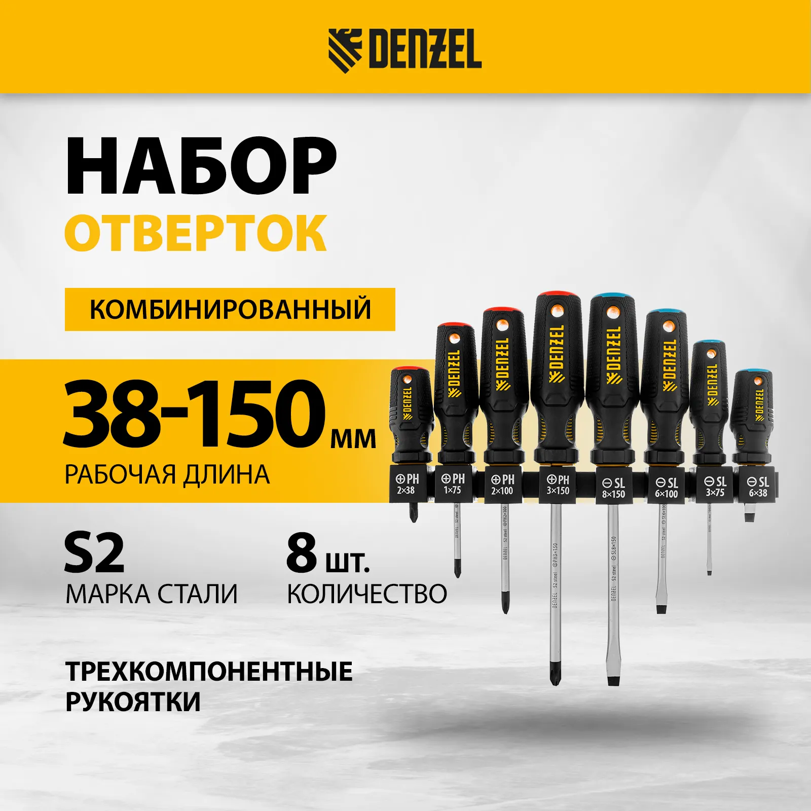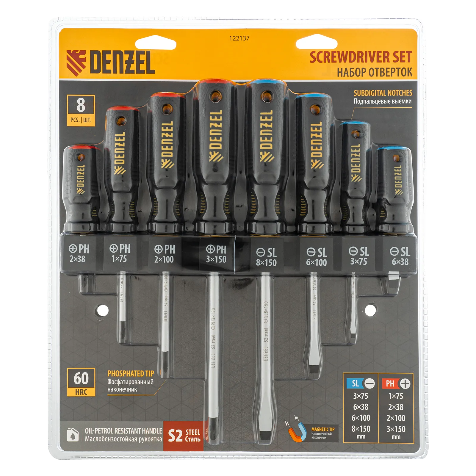 Набор Denzel 122137 состоит из 8 отверток с трехкомпонентными рукоятками, изготовленных из стали S2 и предназначенных для работы с резьбовым крепежом типа PH и SL. Благодаря намагниченным высокоточным шлицам направлять отвертки с крепежом можно одной рукой. Отвертка с длиной стержня 38 мм удобна для работы в ограниченном пространстве. Набор подходит для профессионального использования.