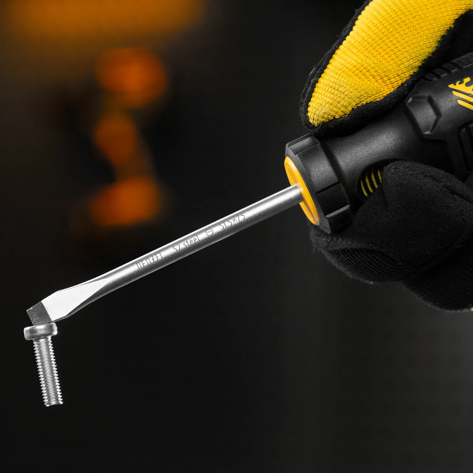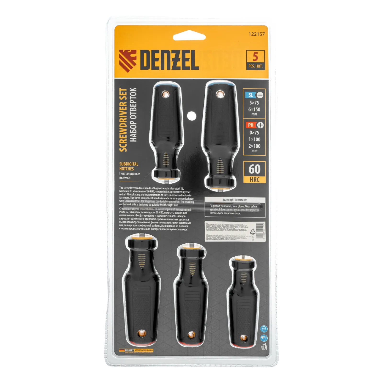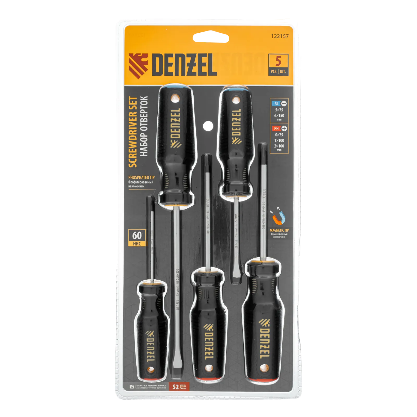 Набор Denzel 122157 из 5 отверток с трехкомпонентными рукоятками, изготовленных из стали S2, используется для монтажа и демонтажа резьбового крепежа со шлицами типа SL и PH. Высокоточные шлицы намагничены, поэтому во время работы не нужно придерживать винты или саморезы рукой. Набор подходит для интенсивного использования.