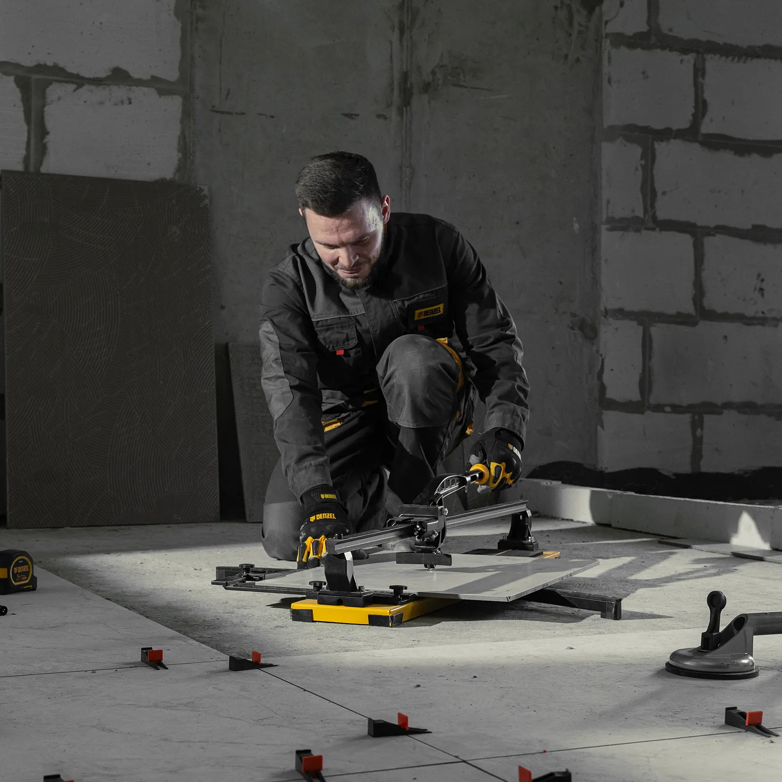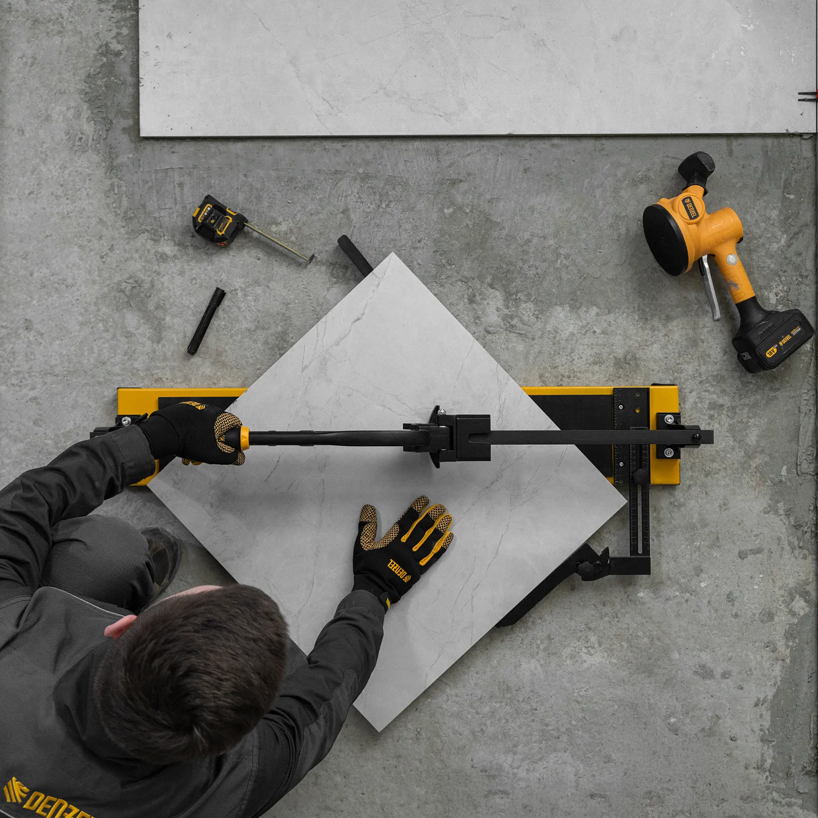 - Удобная работа — благодаря противоскользящим накладкам плиткорез не смещается даже на гладких поверхностях.