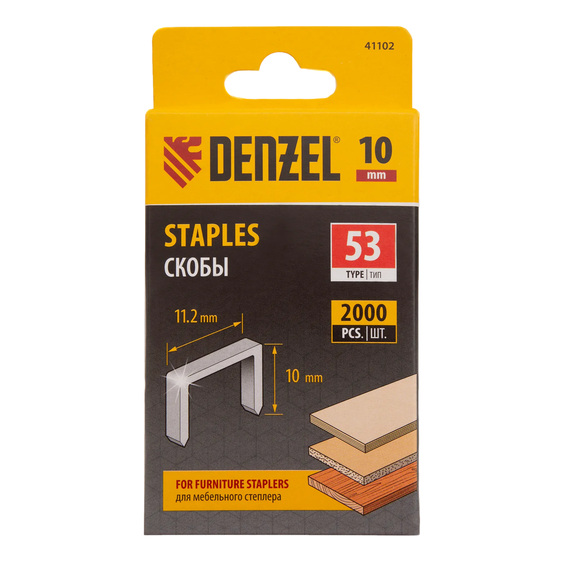 Скобы Denzel 41102 типа 53, высотой 10 мм, 2000 шт. в упаковке, — расходные материалы для мебельного степлера. Универсальные П-образные скобы подходят для фиксации картона, фанеры, ткани, пленки ПВХ, утеплителя и других материалов. Пригодятся для обшивки мебели, укладки утеплителя и выполнения других работ.