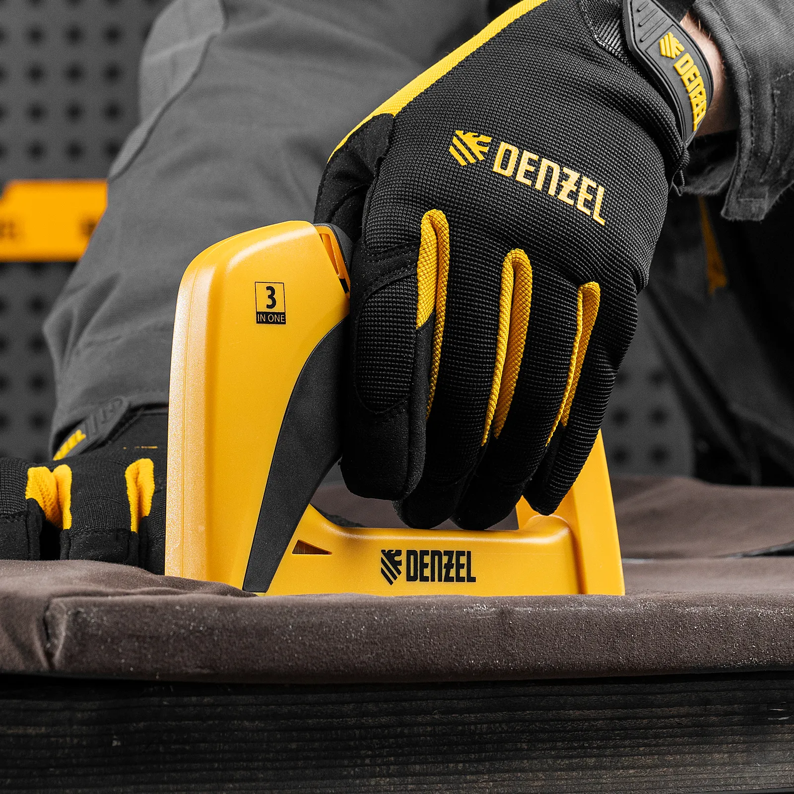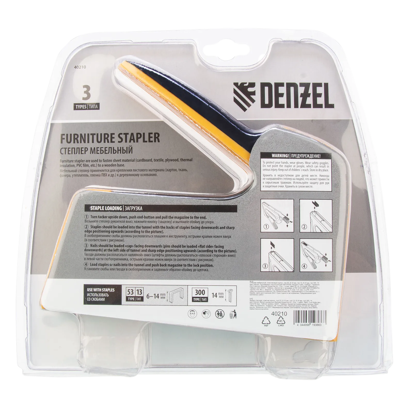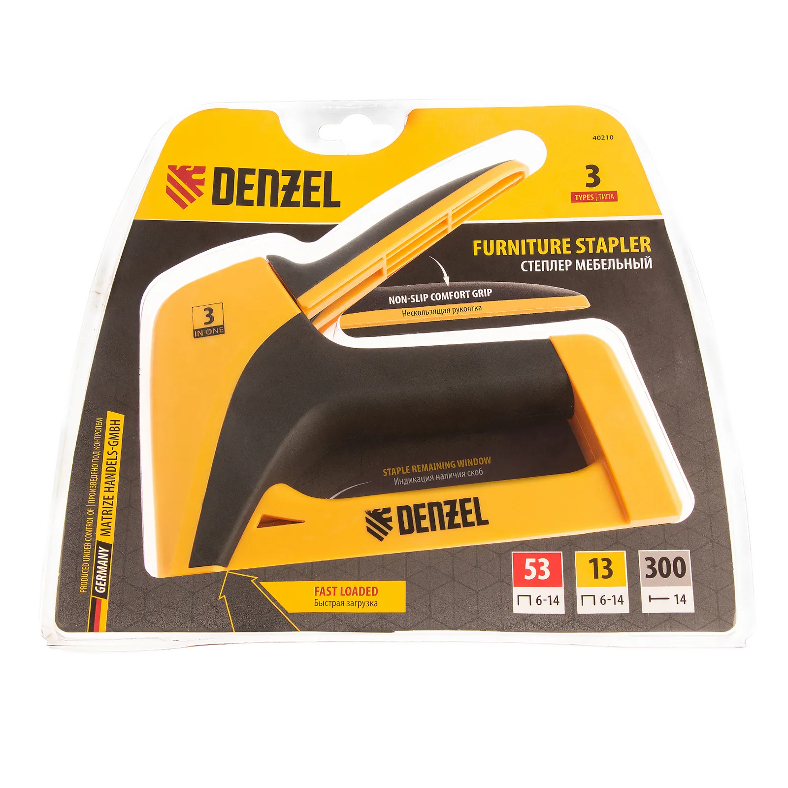 Мебельный степлер Denzel 40210 в пластиковом корпусе совместим со скобами типа 53, 13 размером 6-14 мм и типа 300 (14 мм), и позволяет быстро скреплять с деревянным основанием листовой материал — фанеру, ткань, пленку ПВХ, утеплитель, картон. Инструмент весит 400 г и удобен для длительного использования. Будет полезен при сборке и обивке мебели, укладке напольных покрытий, а также во время выполнения ремонтных и багетных работ.