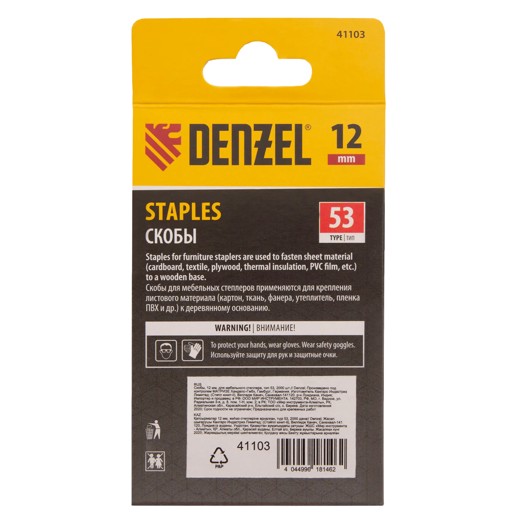 Скобы Denzel 41103 типа 53, высотой 12 мм, 2000 шт. в упаковке, — расходные материалы для мебельного степлера. Универсальные П-образные скобы подходят для фиксации картона, фанеры, ткани, пленки ПВХ, утеплителя и других материалов. Пригодятся для обшивки мебели, укладки утеплителя и выполнения других работ.