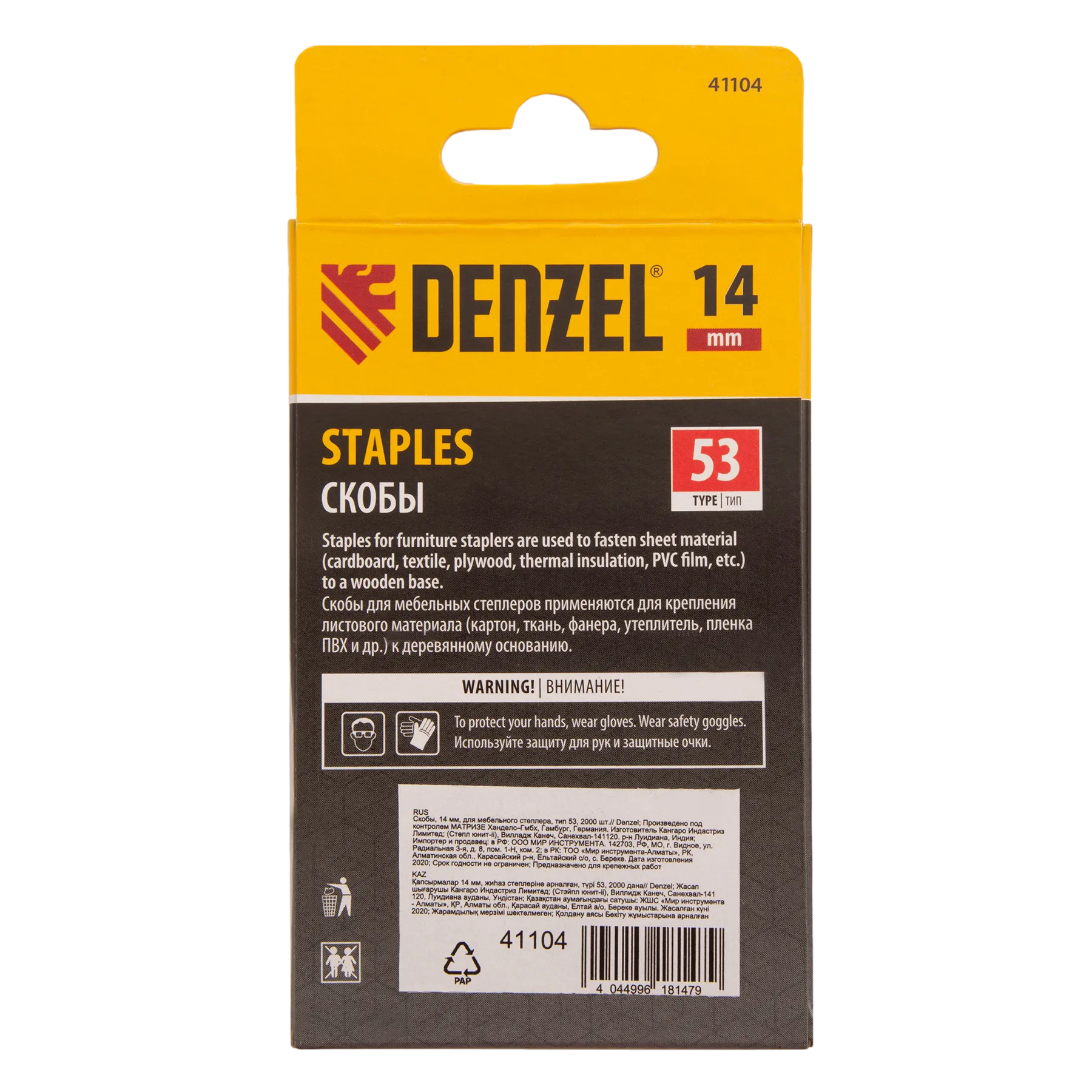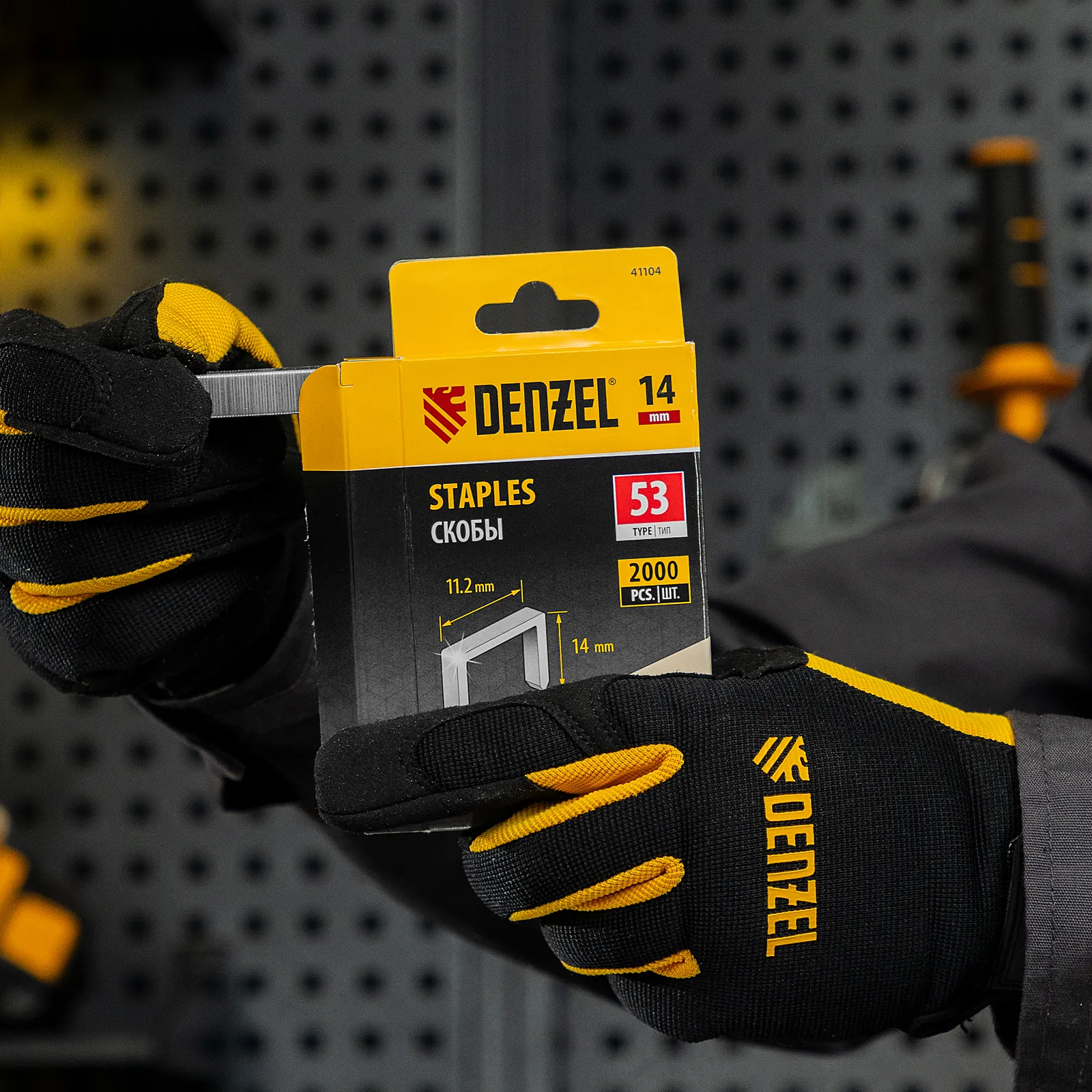 Скобы Denzel 41104 типа 53, высотой 14 мм, 2000 шт. в упаковке, — расходные материалы для мебельного степлера. Универсальные П-образные скобы подходят для фиксации картона, фанеры, ткани, пленки ПВХ, утеплителя и других материалов. Пригодятся для обшивки мебели, укладки утеплителя и выполнения других работ.