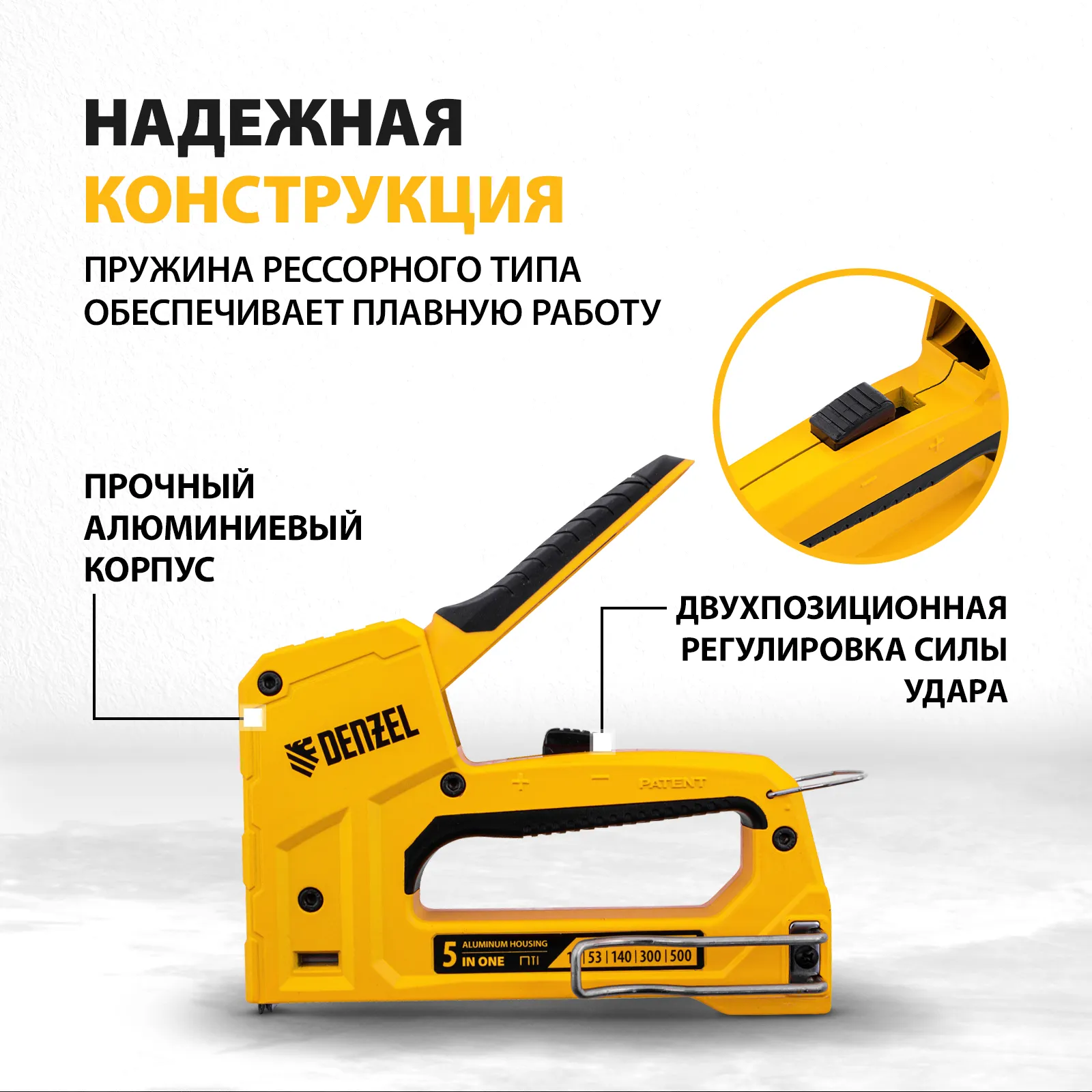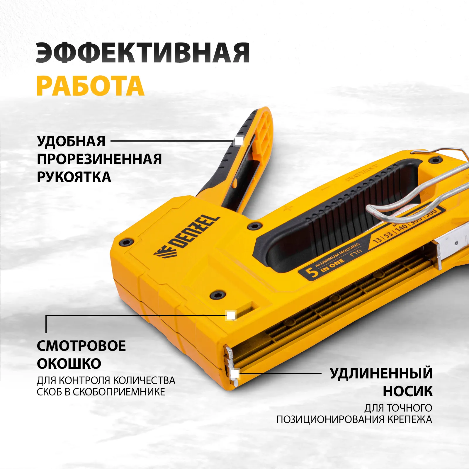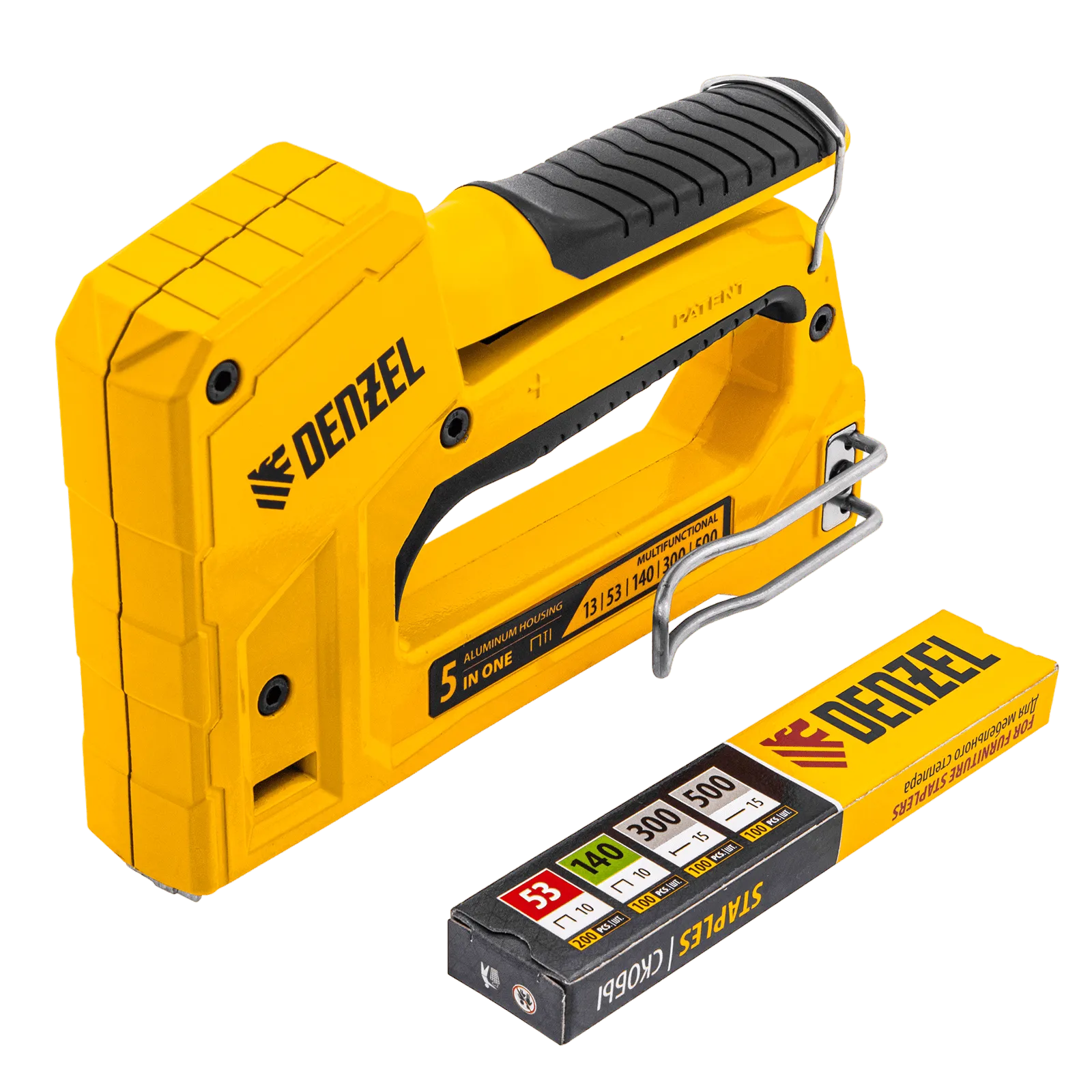 Мебельный степлер Denzel 40215 совместим со скобами типа 53 и 13 размером 6-14 мм, типа 140 размером 10-14 мм, а также с гвоздями типа 300 размером 15 мм и штифтами типа 500 размером 15 мм. Предназначен для фиксации листовых материалов на деревянном основании. Используется для крепления фанеры, ДСП, ДВП, картона, оргалита, изоляционного материала, а также для укладки напольных покрытий, обивки мебели и выполнения багетных работ.