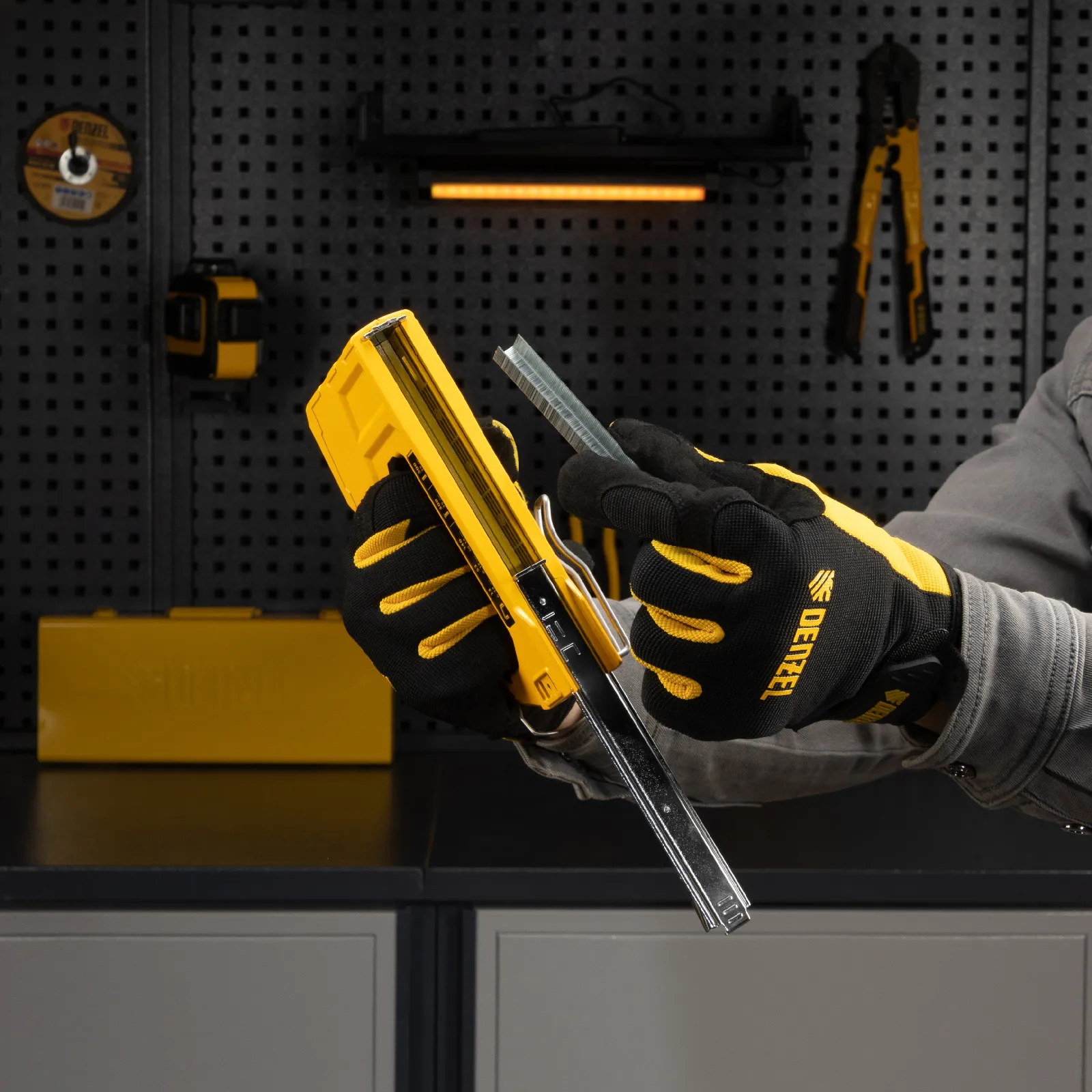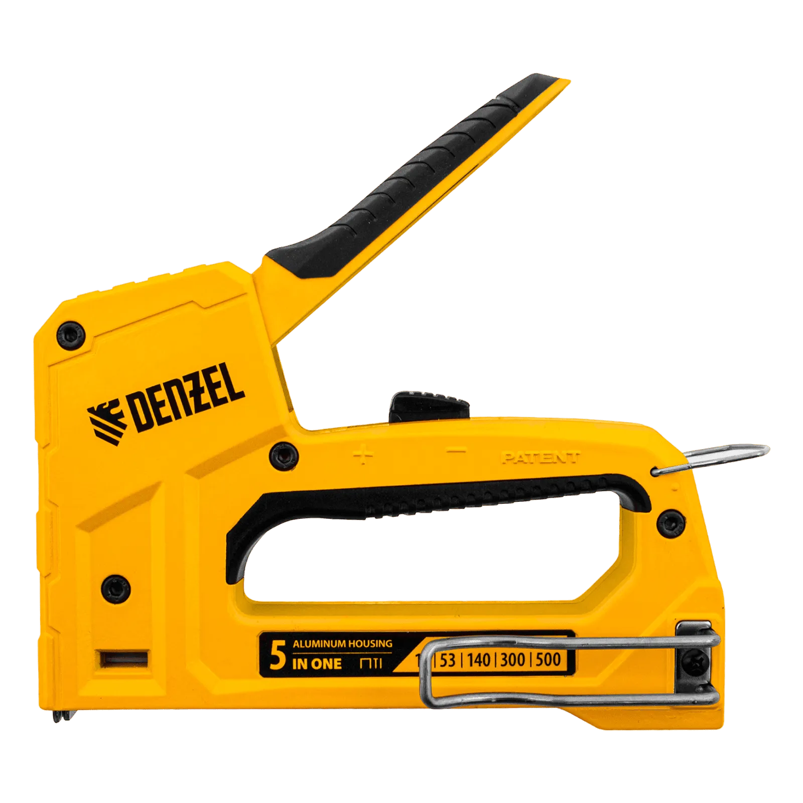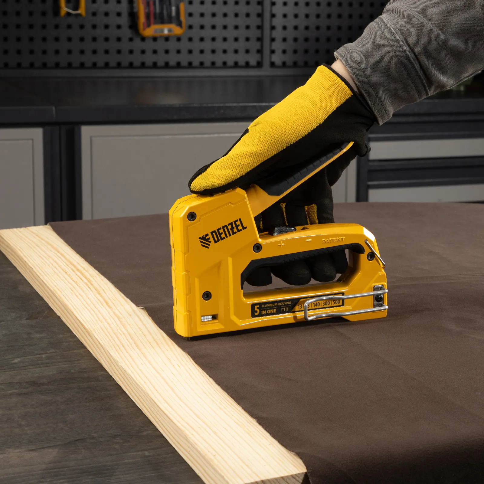 Мебельный степлер Denzel 40215 совместим со скобами типа 53 и 13 размером 6-14 мм, типа 140 размером 10-14 мм, а также с гвоздями типа 300 размером 15 мм и штифтами типа 500 размером 15 мм. Предназначен для фиксации листовых материалов на деревянном основании. Используется для крепления фанеры, ДСП, ДВП, картона, оргалита, изоляционного материала, а также для укладки напольных покрытий, обивки мебели и выполнения багетных работ.