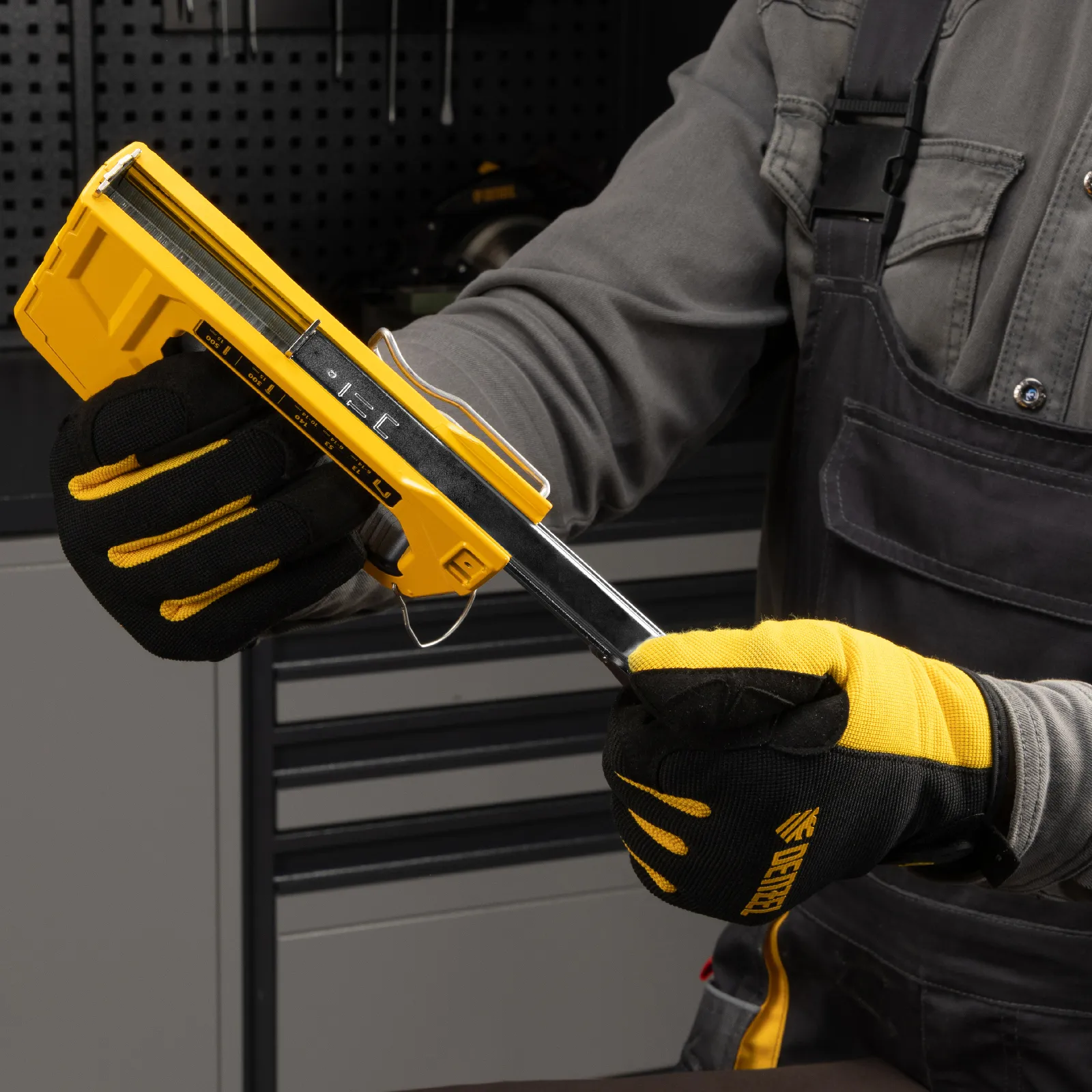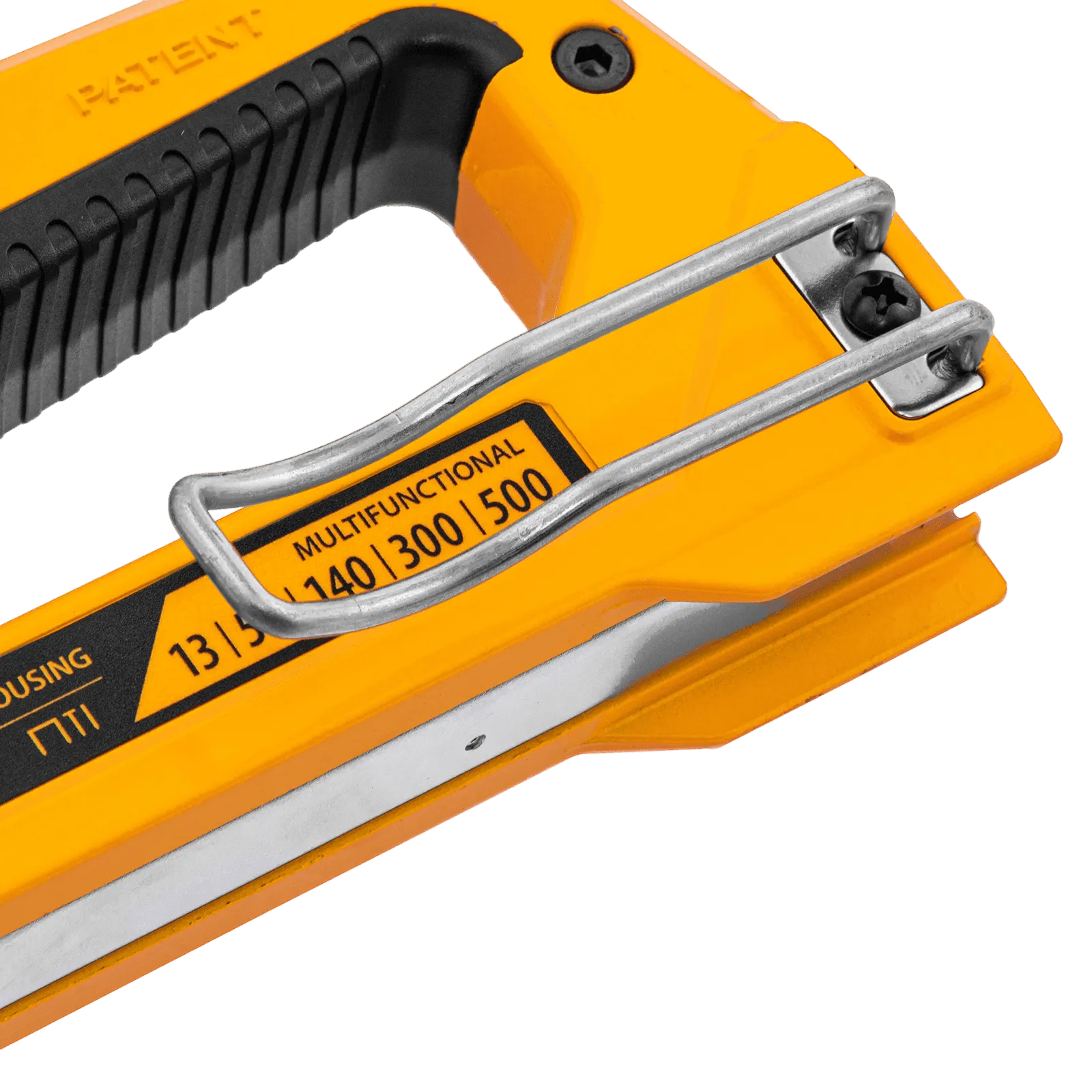 - Эргономичность — прорезиненная рукоятка не скользит в руке, а специальная скоба-подвес позволяет закрепить степлер на ремне или поясе монтажника.