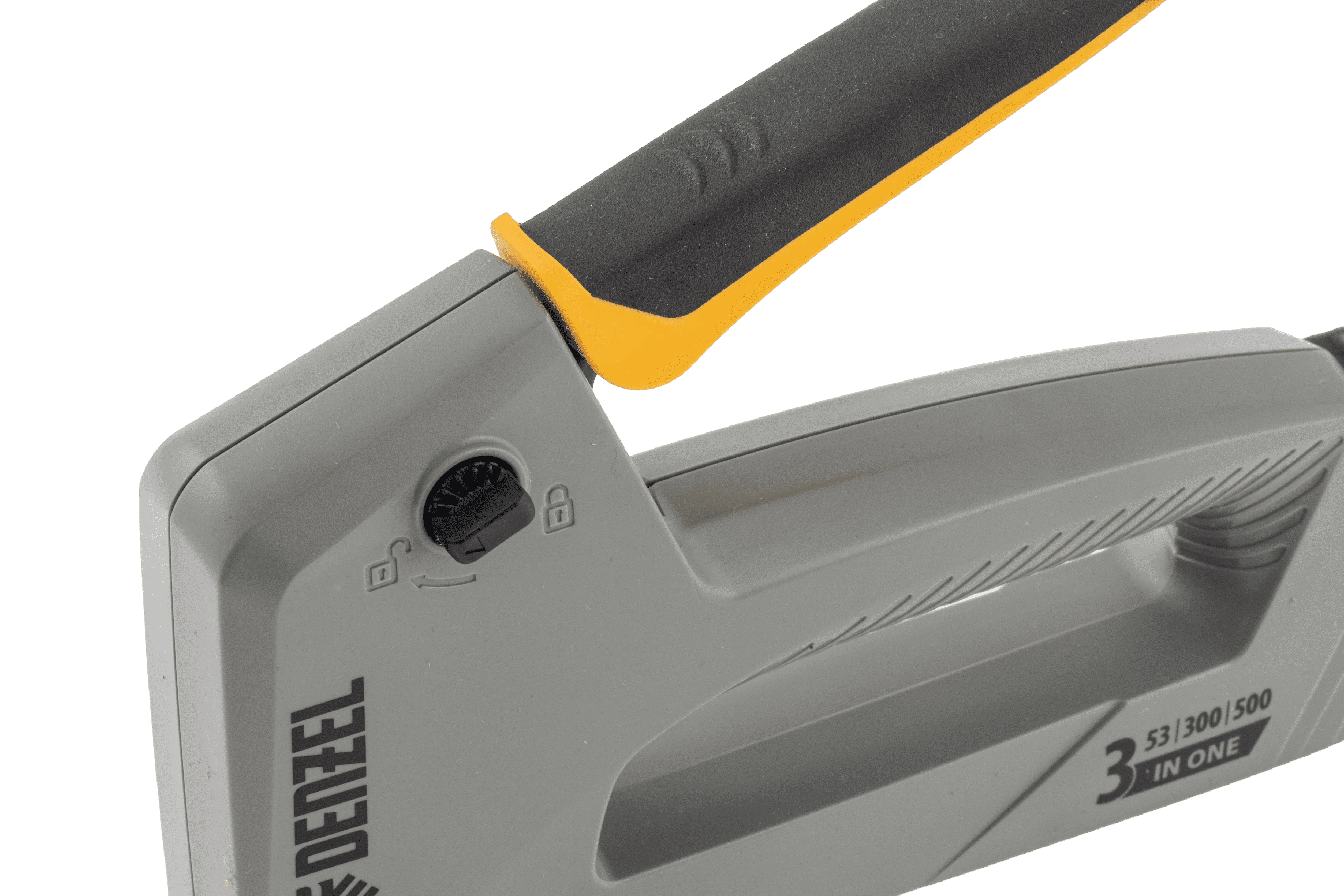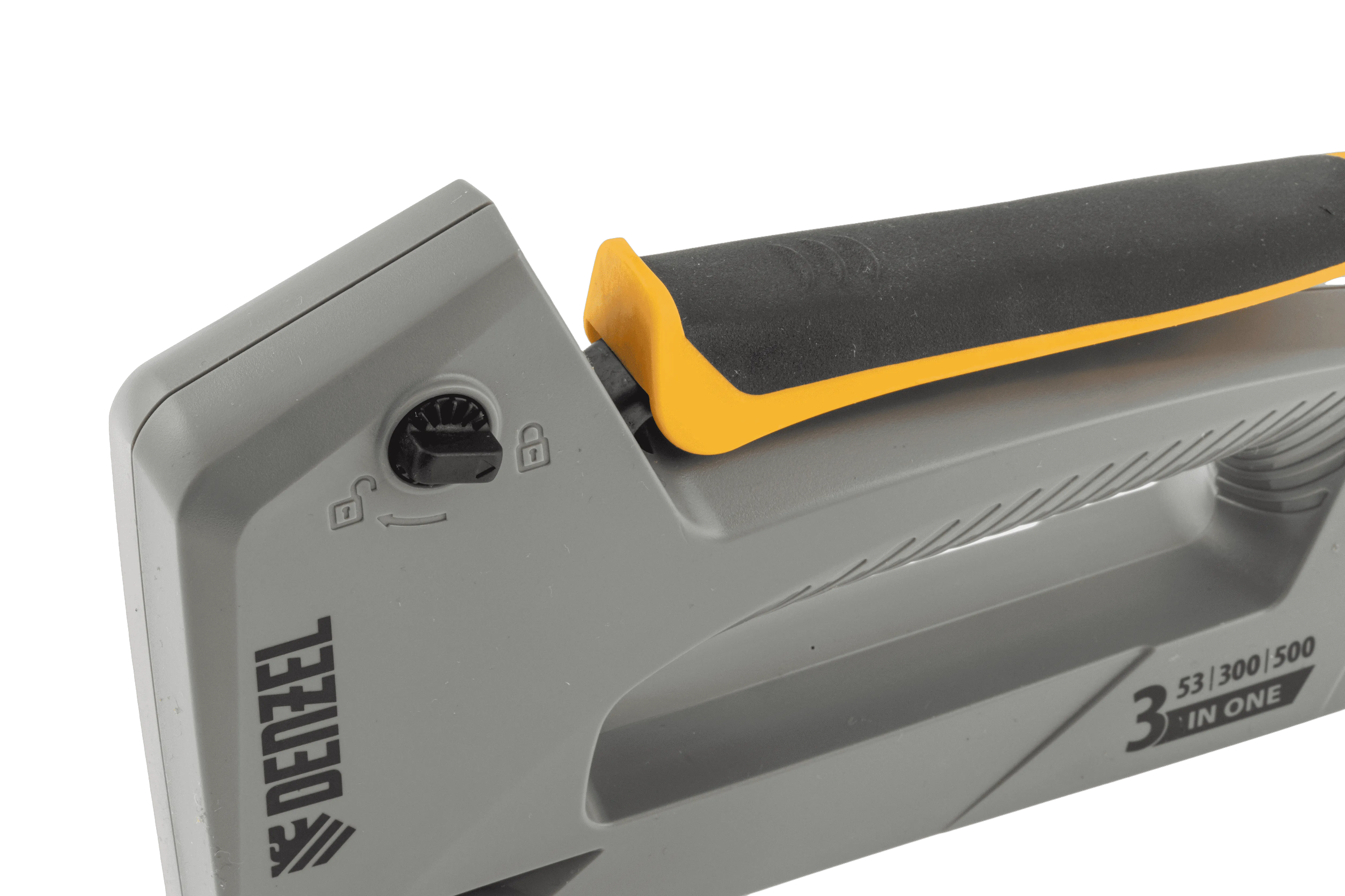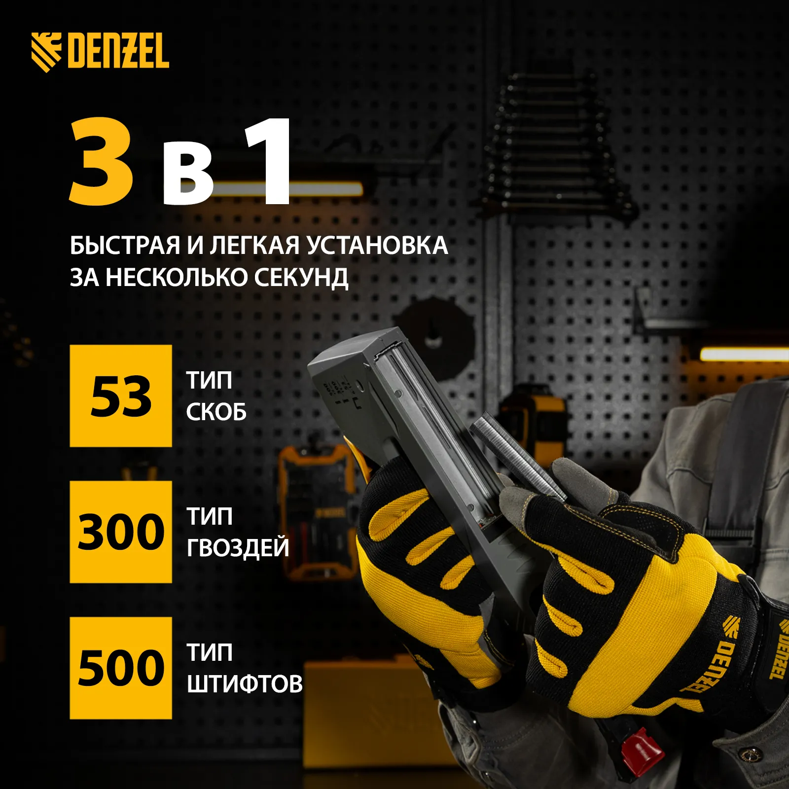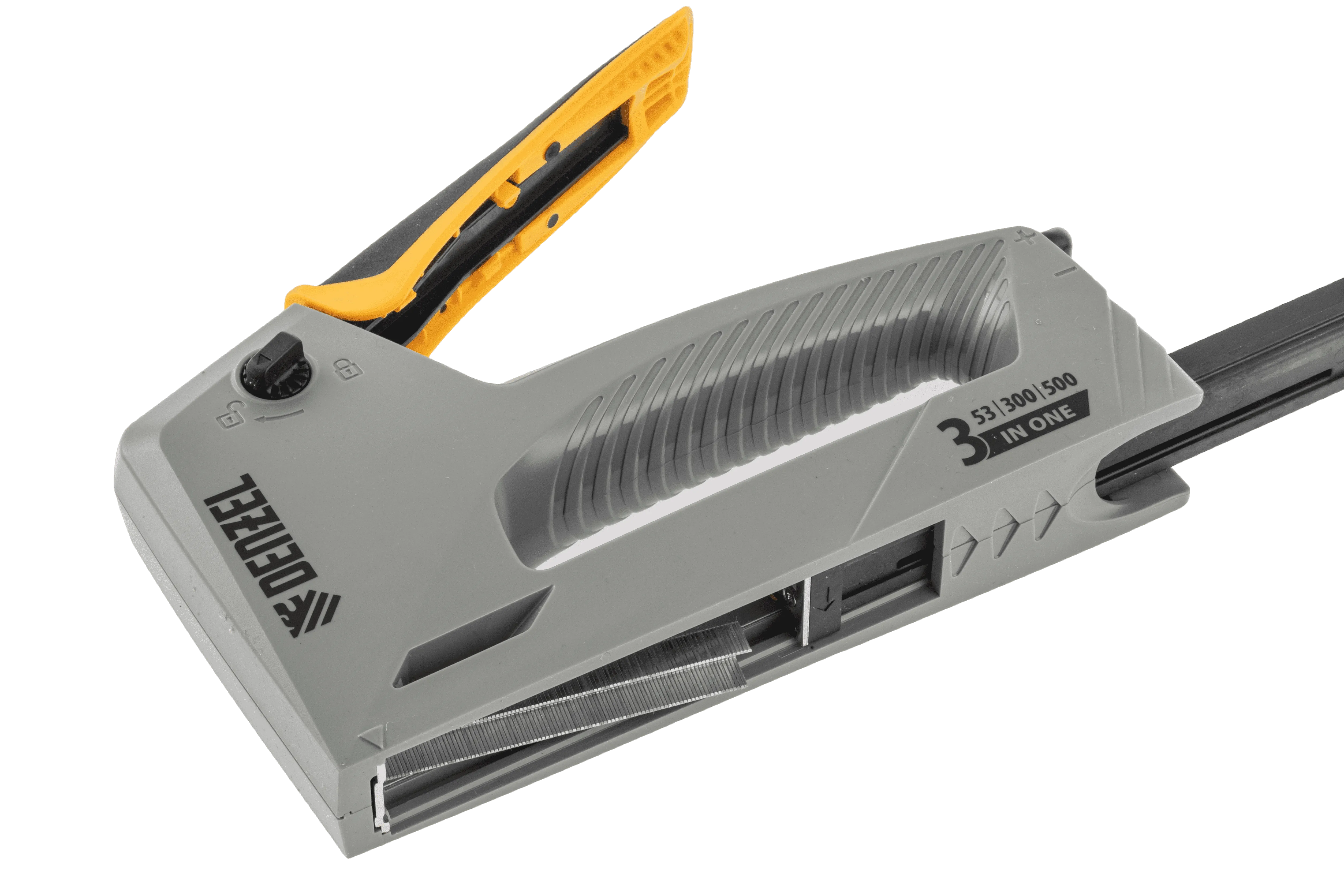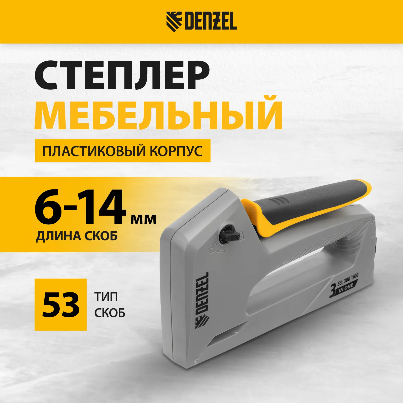 Мебельный степлер Denzel 40213 в пластиковом корпусе работает со скобами типа 53 размером 6-14 мм, а также гвоздями 300 и штифтами 500 длиной 15 мм. Используется для скрепления листовых материалов: фанеры, ДВП, ДСП, оргалита, а также для фиксации пленки и теплоизоляционного материала на деревянном основании. Эффективный ударный механизм позволяет на 30% снизить нагрузку на руку. Инструмент пригодится для обивки мебели, укладки напольных покрытий, выполнения ремонтных и багетных работ.