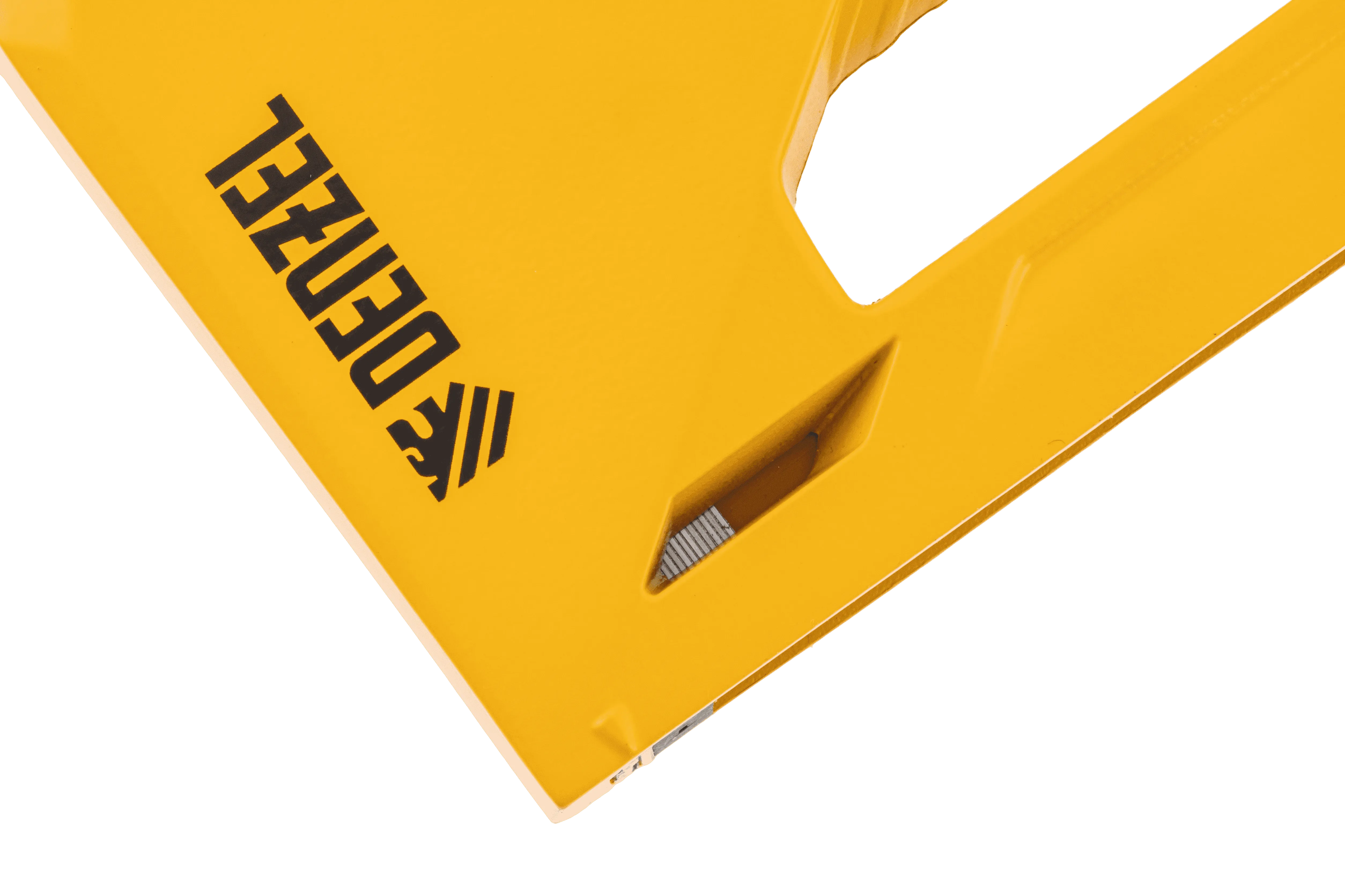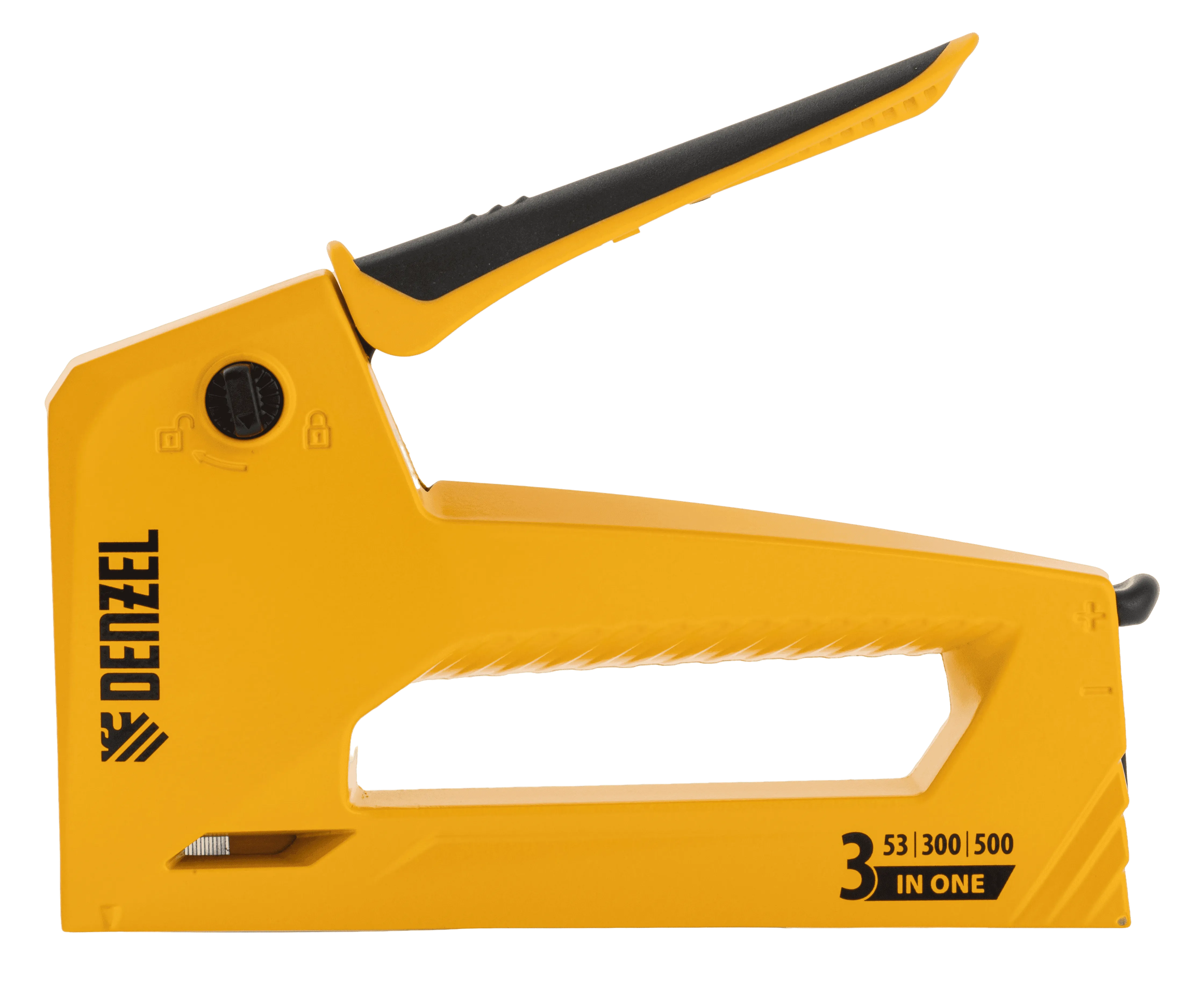 Мебельный степлер Denzel 40214 в алюминиевом корпусе работает со скобами типа 53 размером 6-14 мм, а также гвоздями 300 и штифтами 500 длиной 15 мм. Используется для скрепления листовых материалов: фанеры, ДВП, ДСП, оргалита, а также для фиксации пленки и теплоизоляционного материала на деревянном основании. Эффективный ударный механизм позволяет на 30% снизить нагрузку на руку. Инструмент пригодится для обивки мебели, укладки напольных покрытий, выполнения ремонтных и багетных работ.