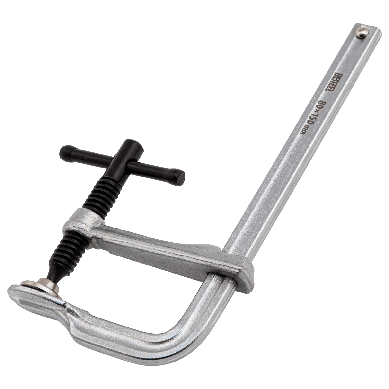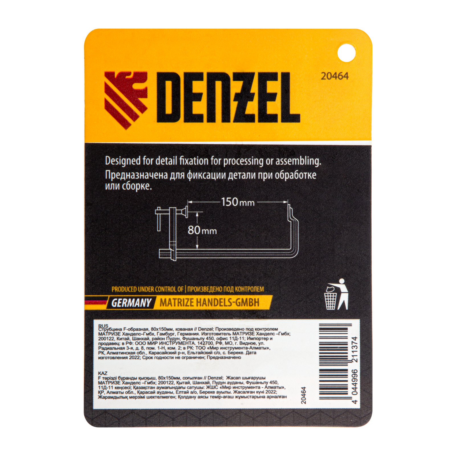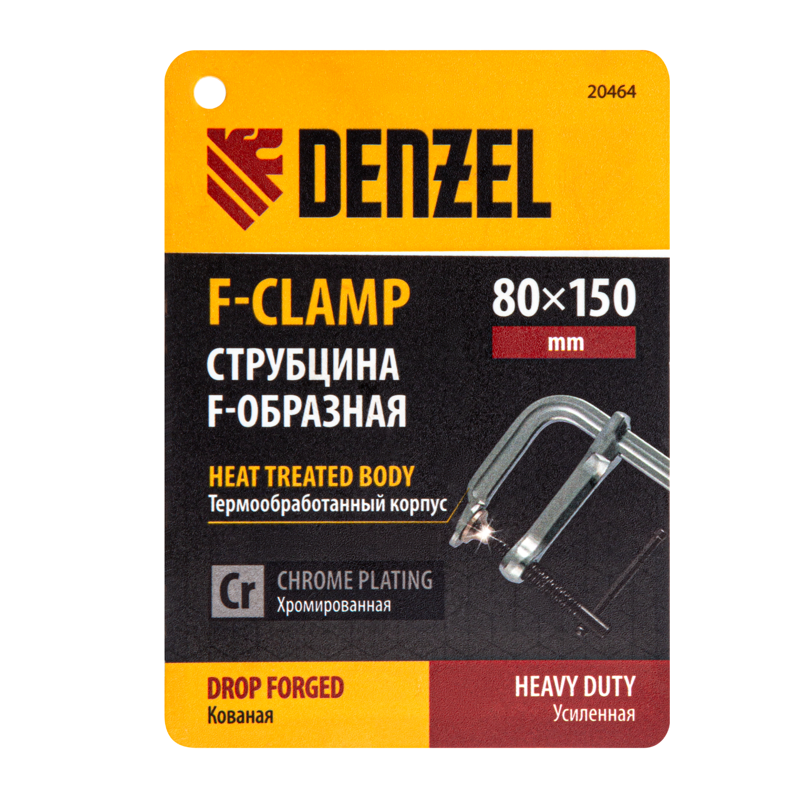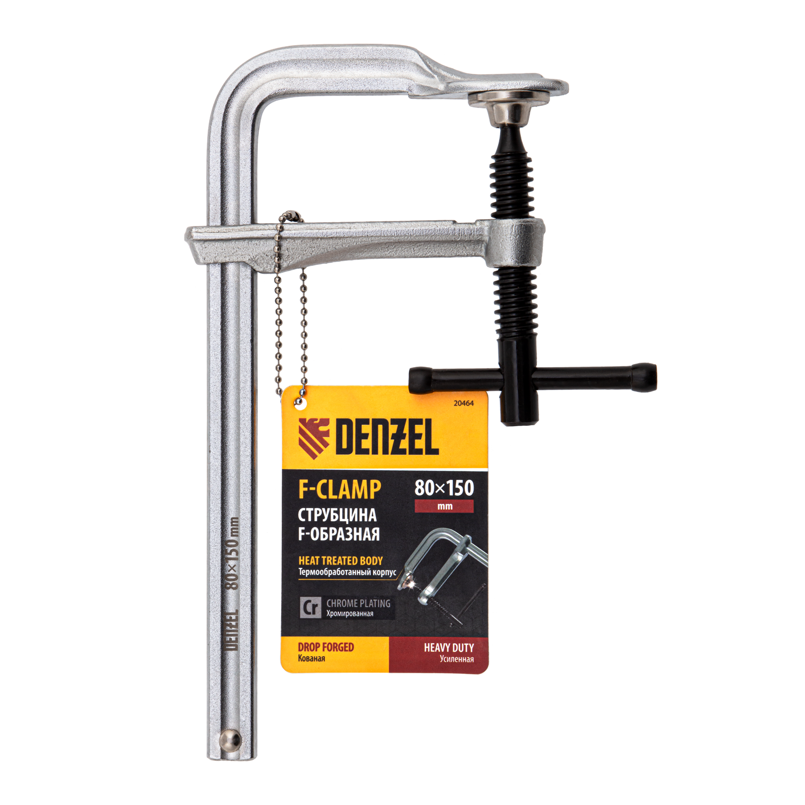 Кованая F-образная струбцина Denzel 20464 с глубиной зажима 80 мм, усиленная, предназначена для фиксации деталей шириной до 150 мм и материалов при проведении слесарных, столярных и сварочных работ. Тавровый профиль обеспечивает устойчивость конструкции к изгибу, что позволяет фиксировать детали со значительным усилием. Струбцина подходит для профессионального применения.