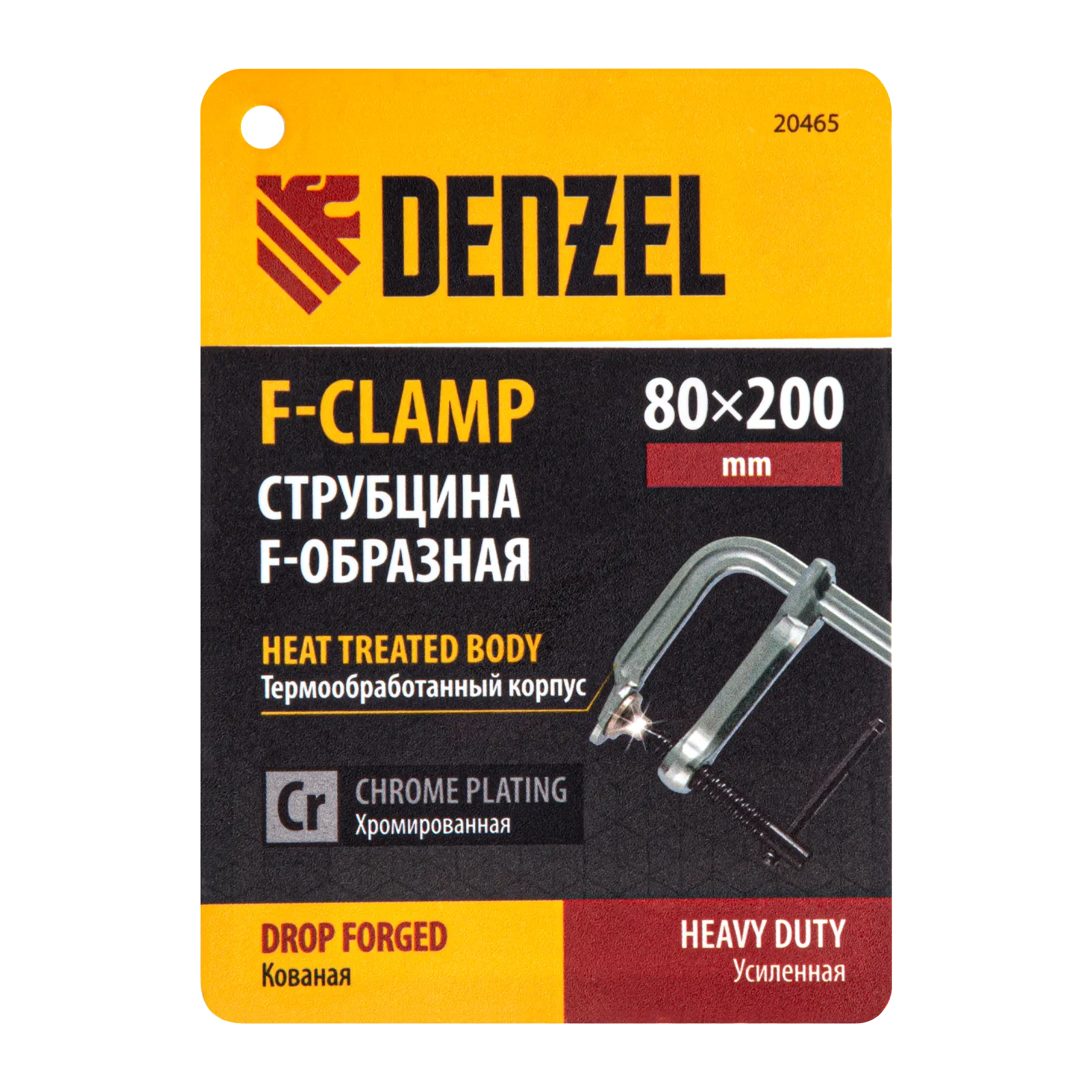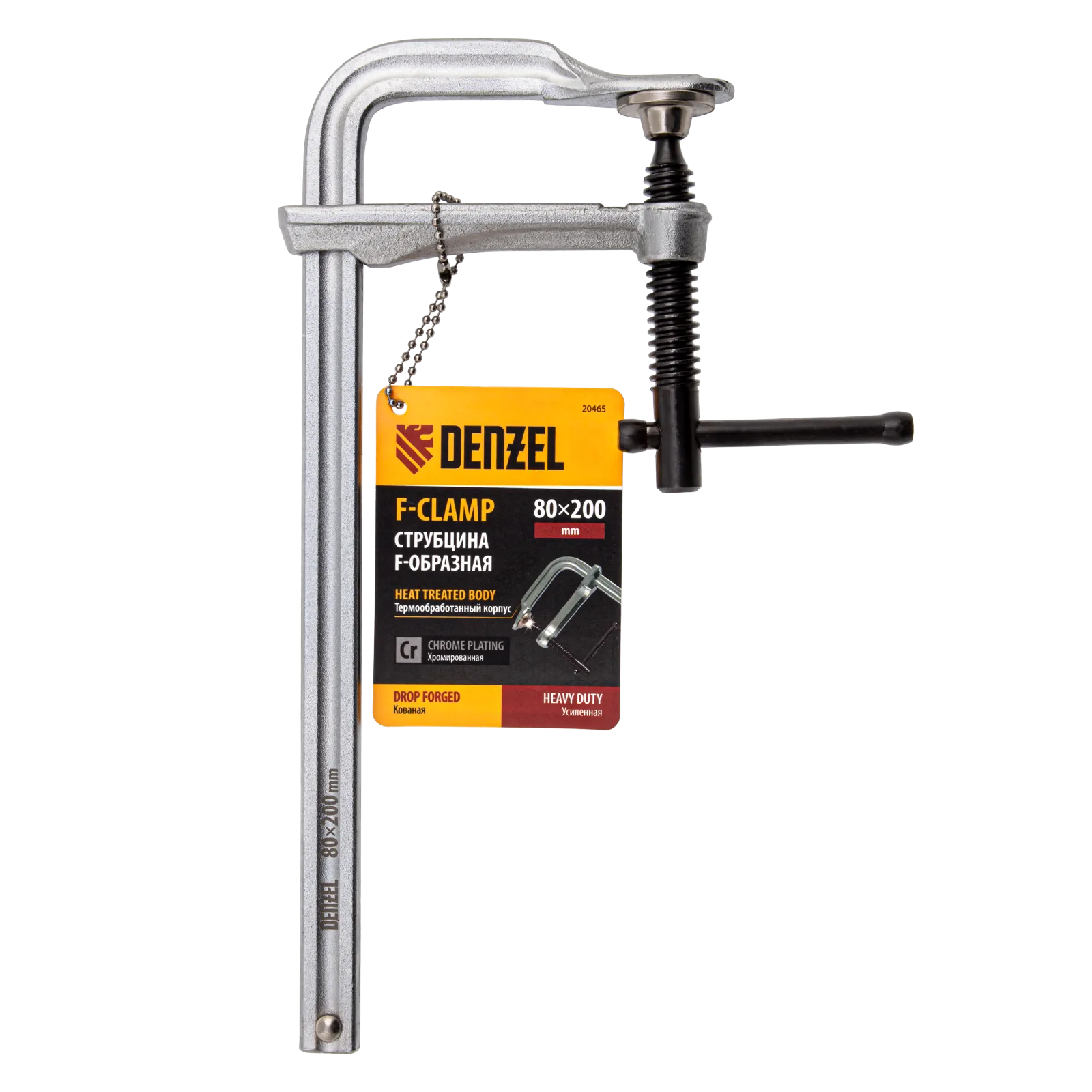 Кованая F-образная струбцина Denzel 20465 с глубиной зажима 80 мм, усиленная, предназначена для фиксации деталей шириной до 200 мм и материалов при проведении слесарных, столярных и сварочных работ. Тавровый профиль обеспечивает устойчивость конструкции к изгибу, что позволяет фиксировать детали со значительным усилием. Струбцина подходит для профессионального применения.