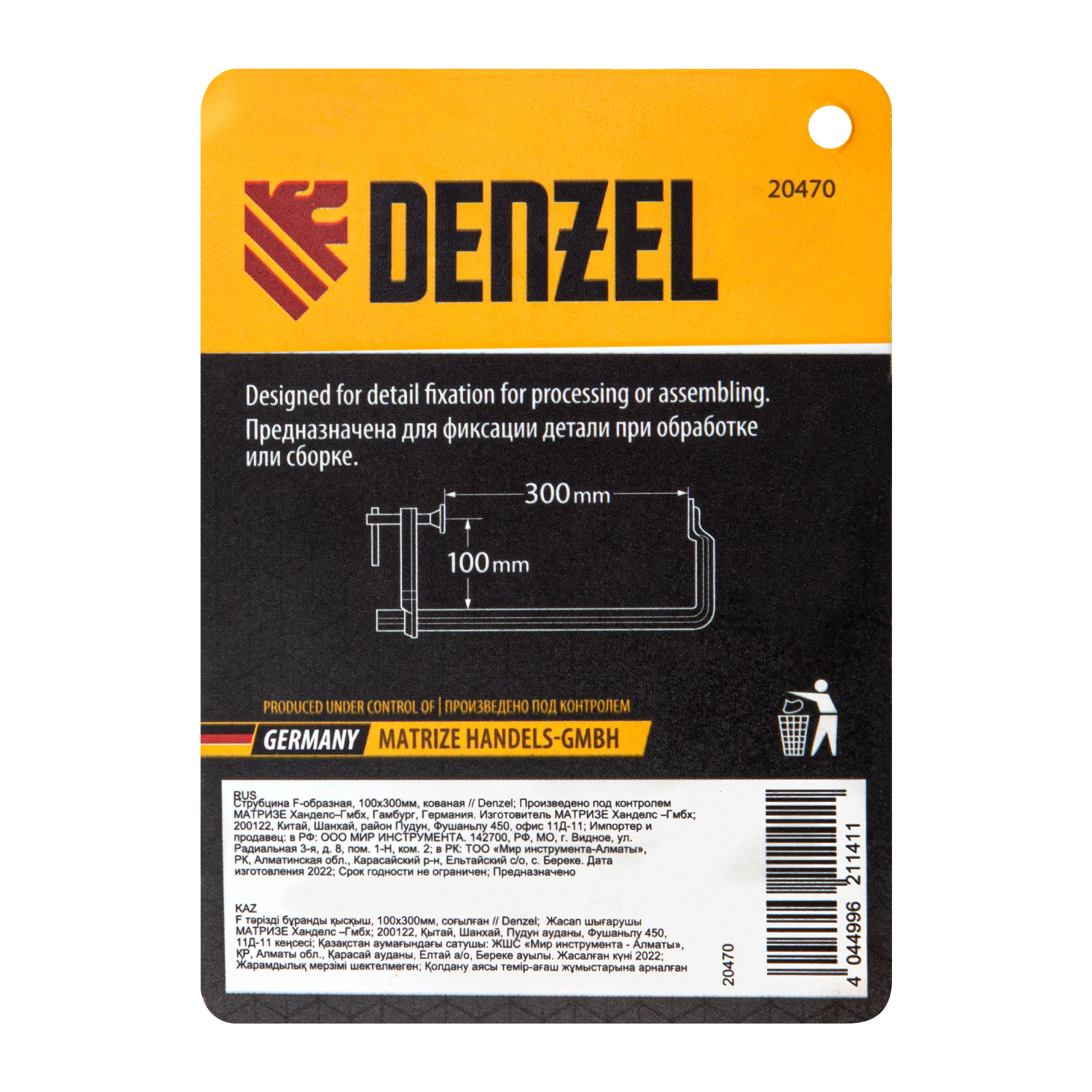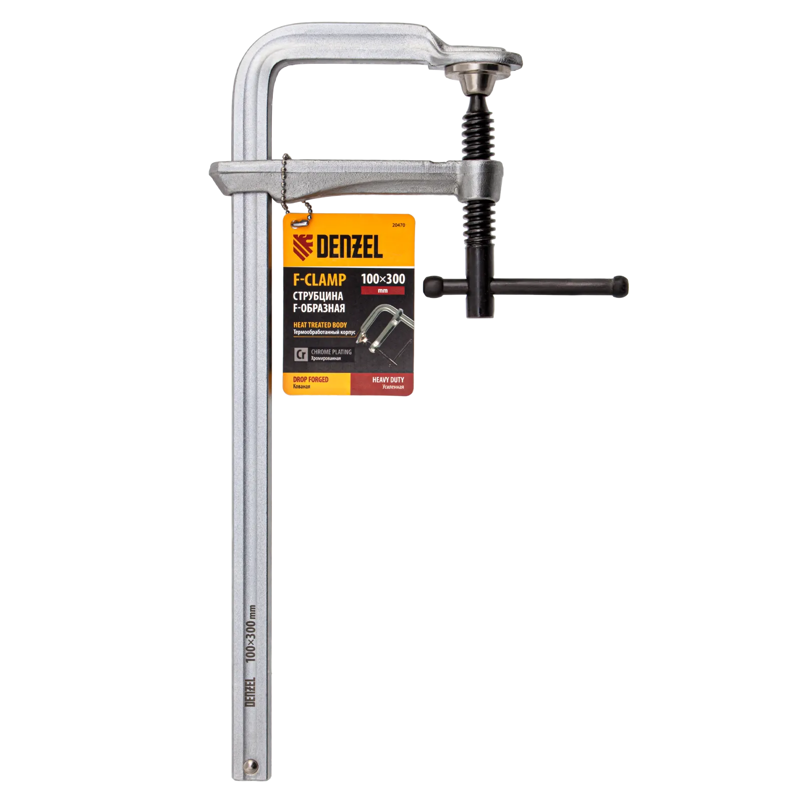 Кованая F-образная струбцина Denzel 20470 с глубиной зажима 100 мм, усиленная, предназначена для фиксации деталей шириной до 300 мм и материалов при проведении слесарных, столярных и сварочных работ. Тавровый профиль обеспечивает устойчивость конструкции к изгибу, что позволяет фиксировать детали со значительным усилием. Струбцина подходит для профессионального применения.