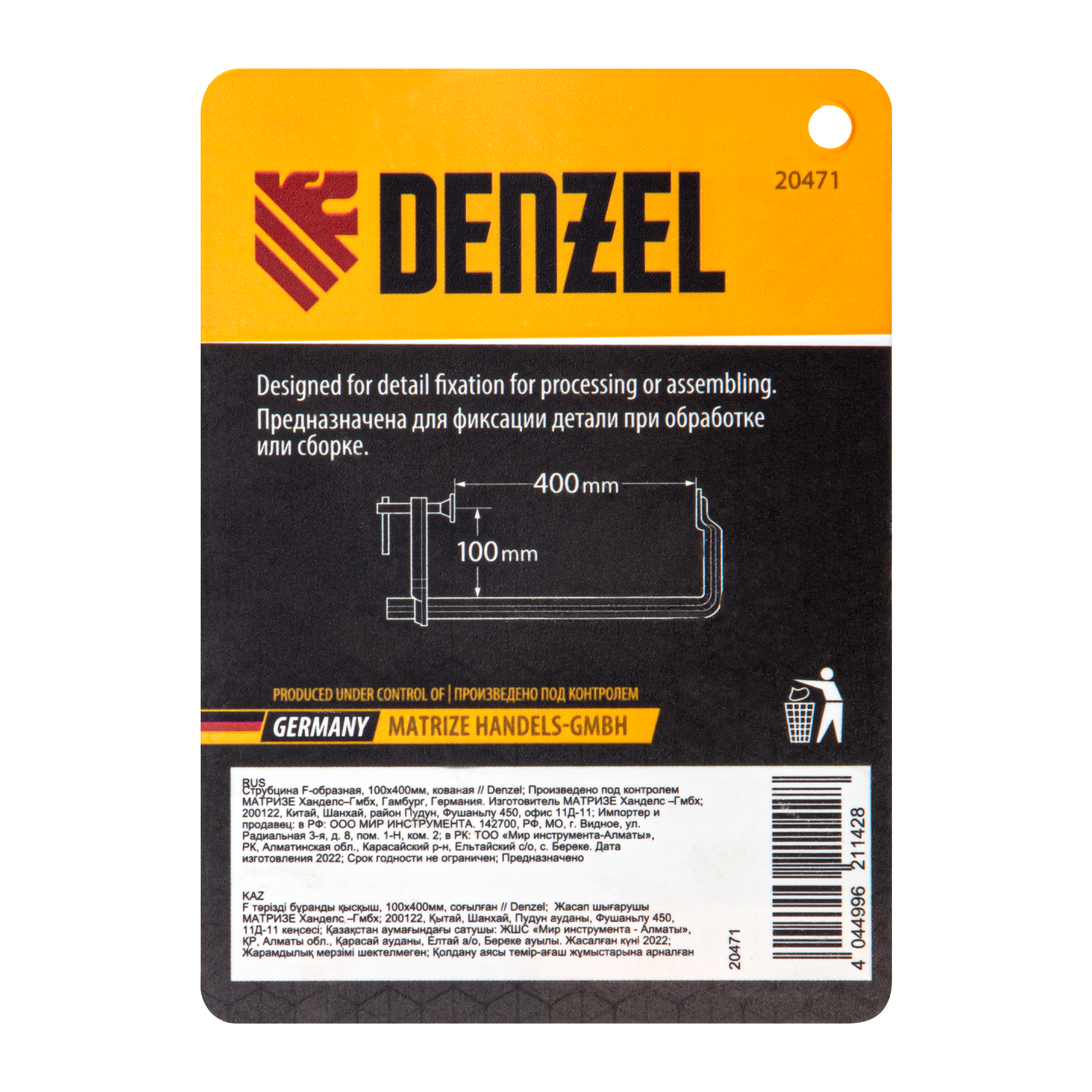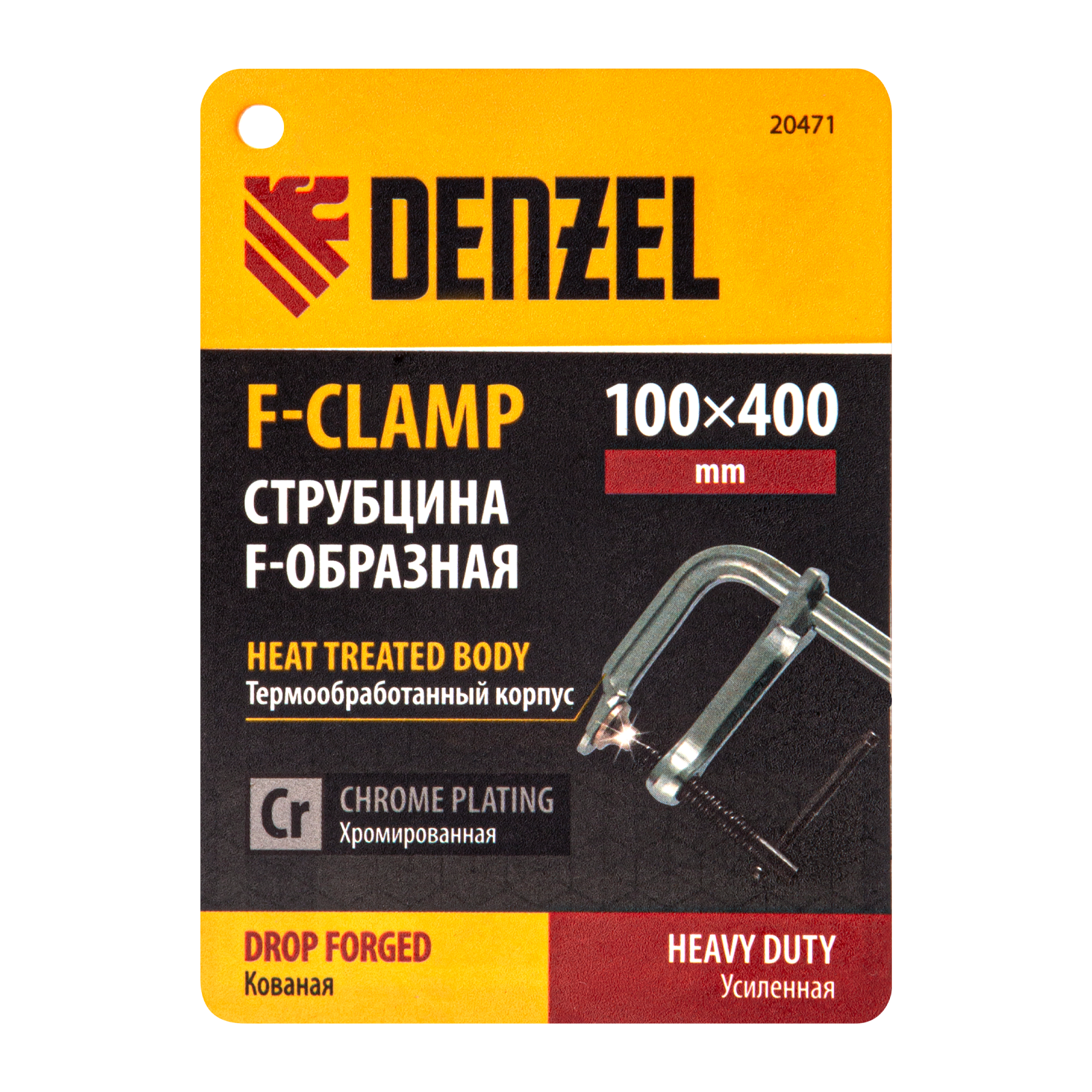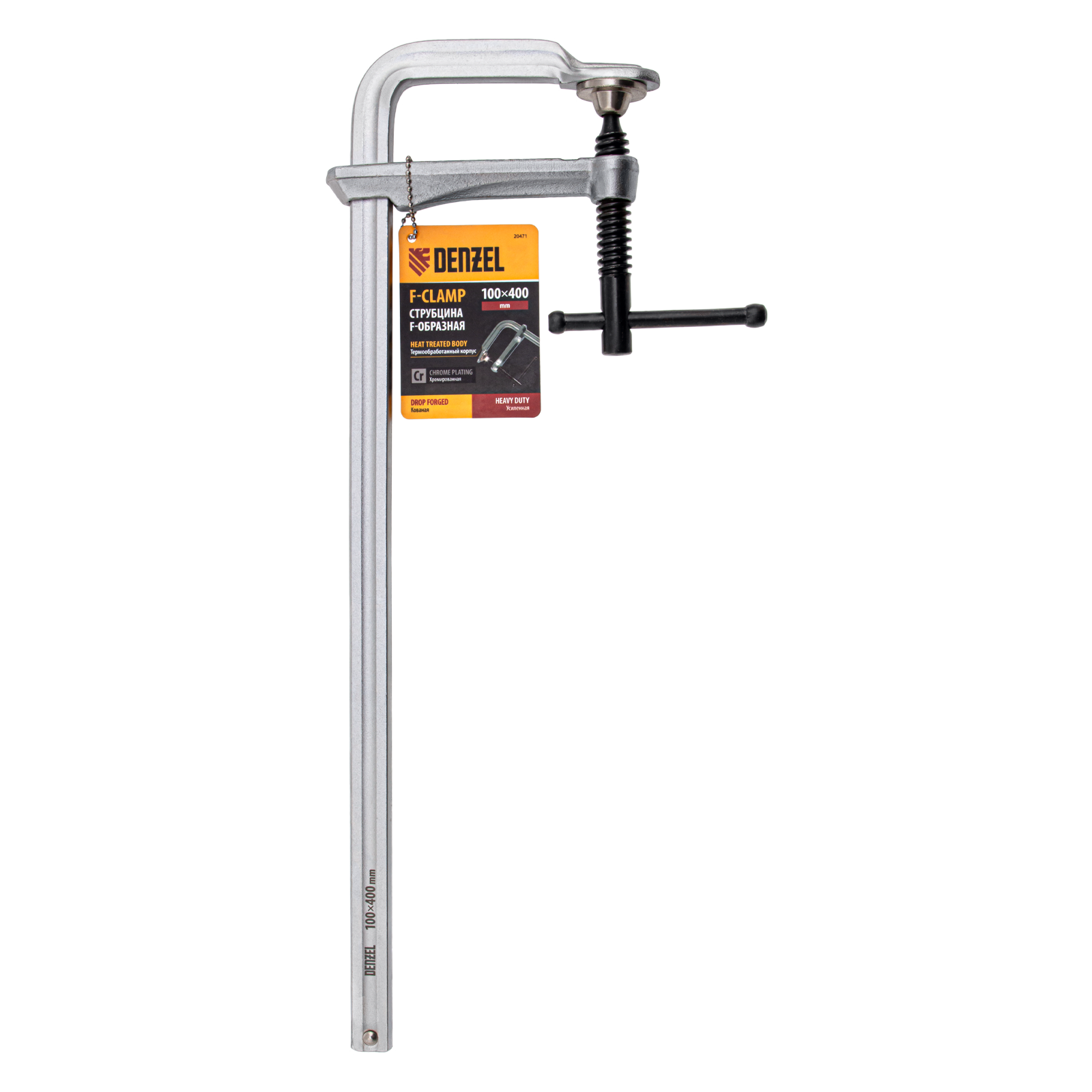 Кованая F-образная струбцина Denzel 20471 с глубиной зажима 100 мм, усиленная, предназначена для фиксации деталей шириной до 400 мм и материалов при проведении слесарных, столярных и сварочных работ. Тавровый профиль обеспечивает устойчивость конструкции к изгибу, что позволяет фиксировать детали со значительным усилием. Струбцина подходит для профессионального применения.
