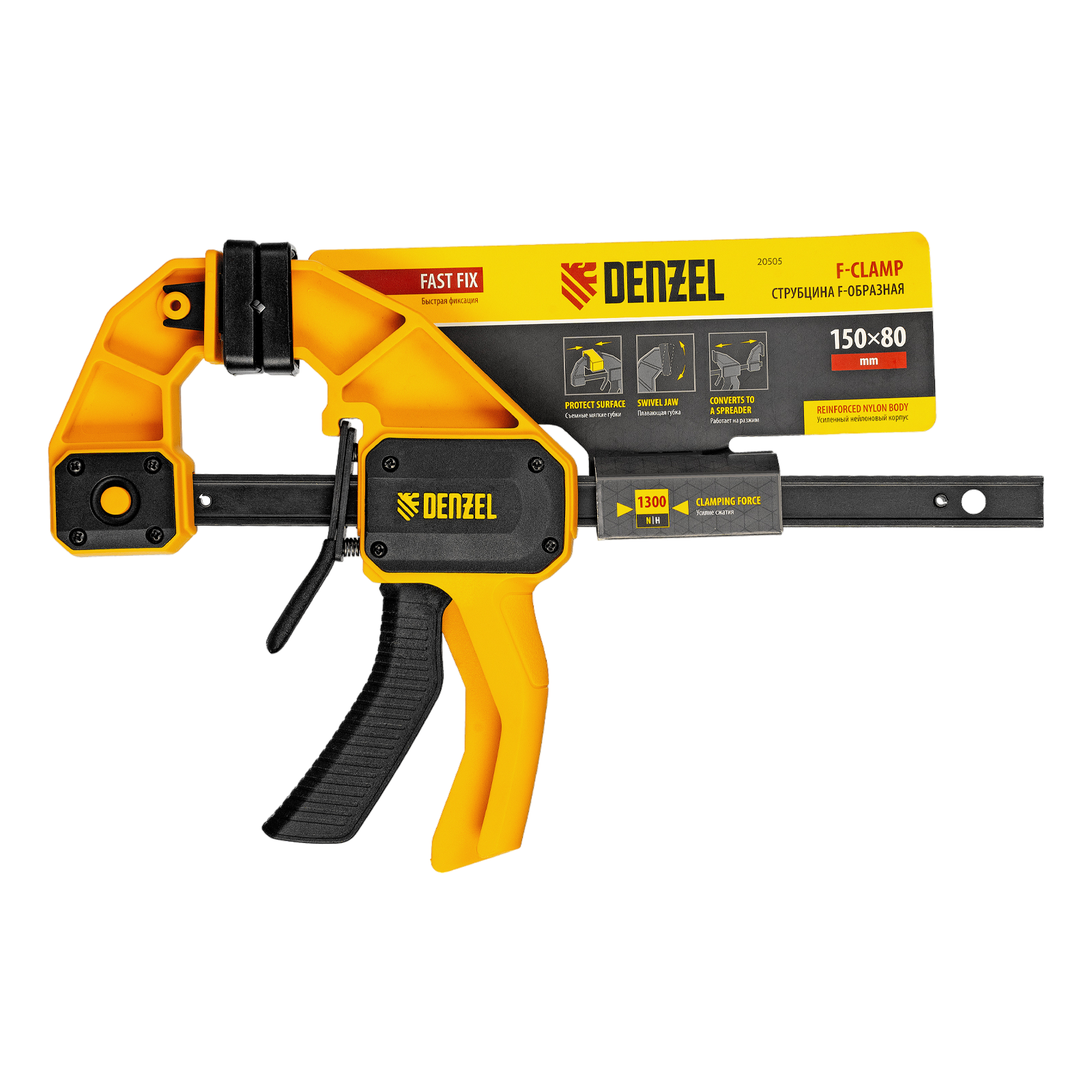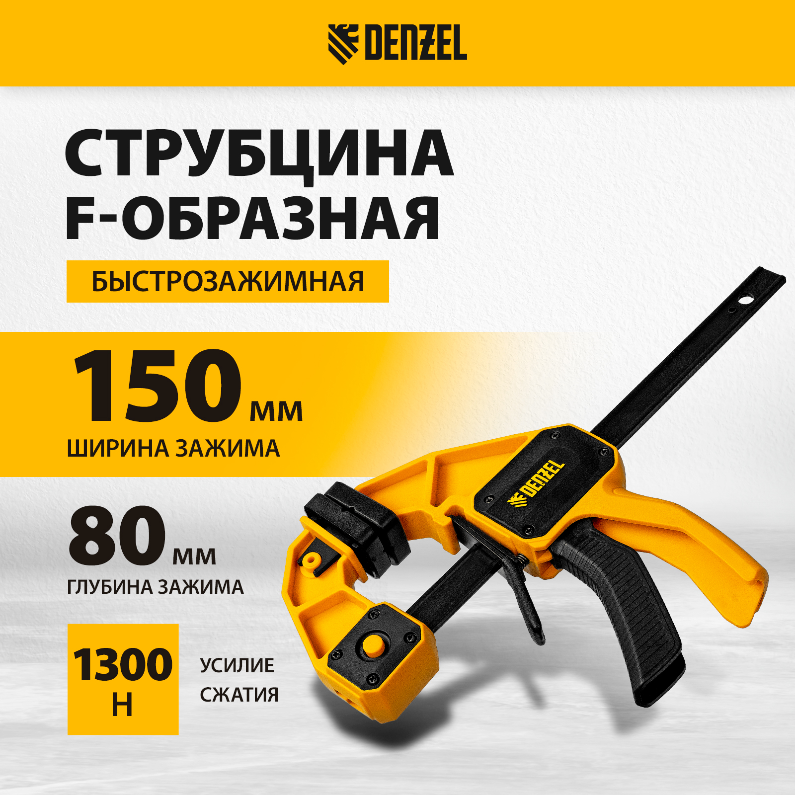 Струбцина F-образная быстрозажимная Denzel 20505 с пошаговым зажимом шириной 150 мм и глубиной 80 мм, с усиленным нейлоновым корпусом, позволяет прочно зафиксировать детали для их обработки, склеивания и выполнения других задач. Сила сжатия составляет 1300 Н. Струбцина подходит для бытового и профессионального применения.