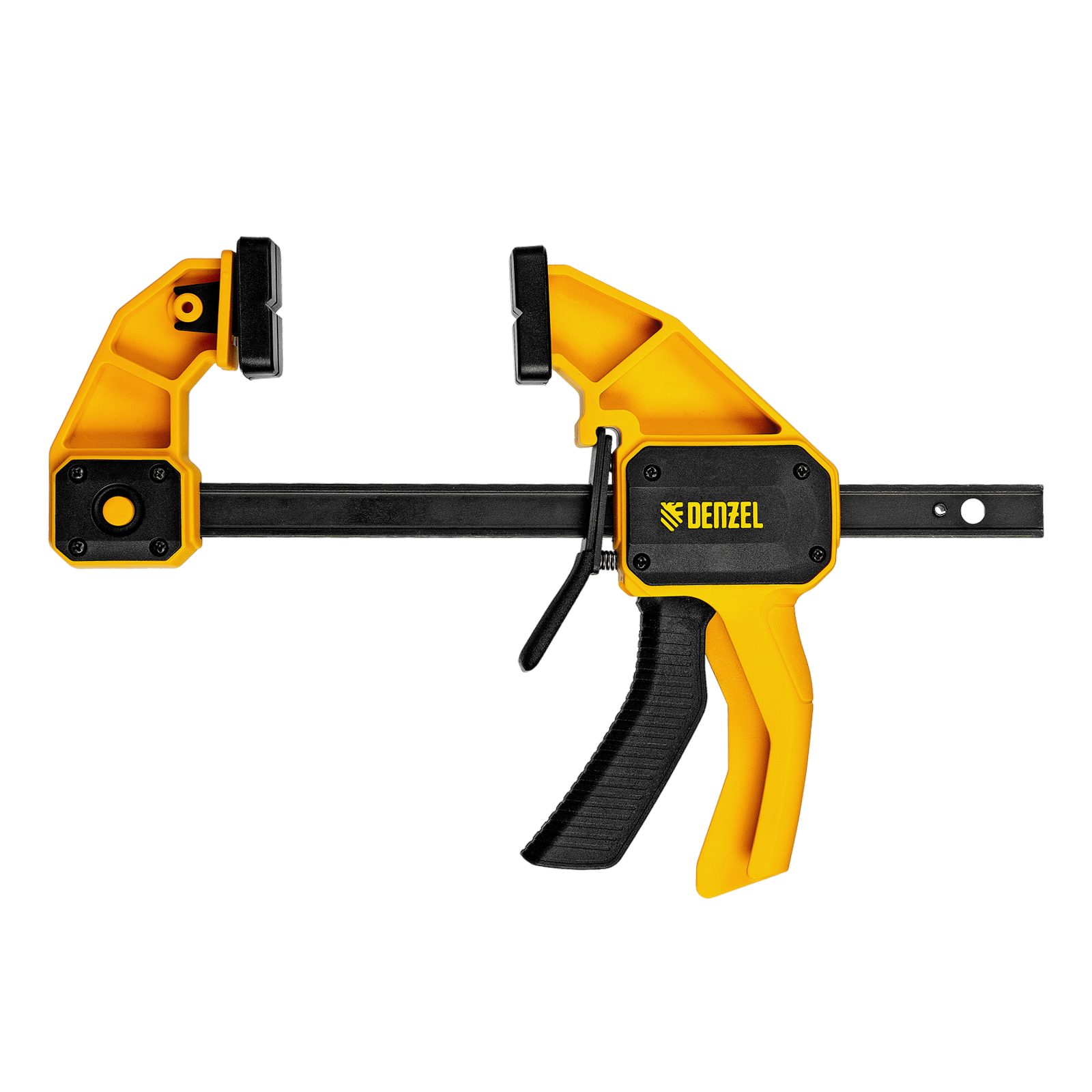 - Комфортное использование — струбцина весит всего 560 г, обрезиненная кнопка фиксации обеспечивает удобный захват.