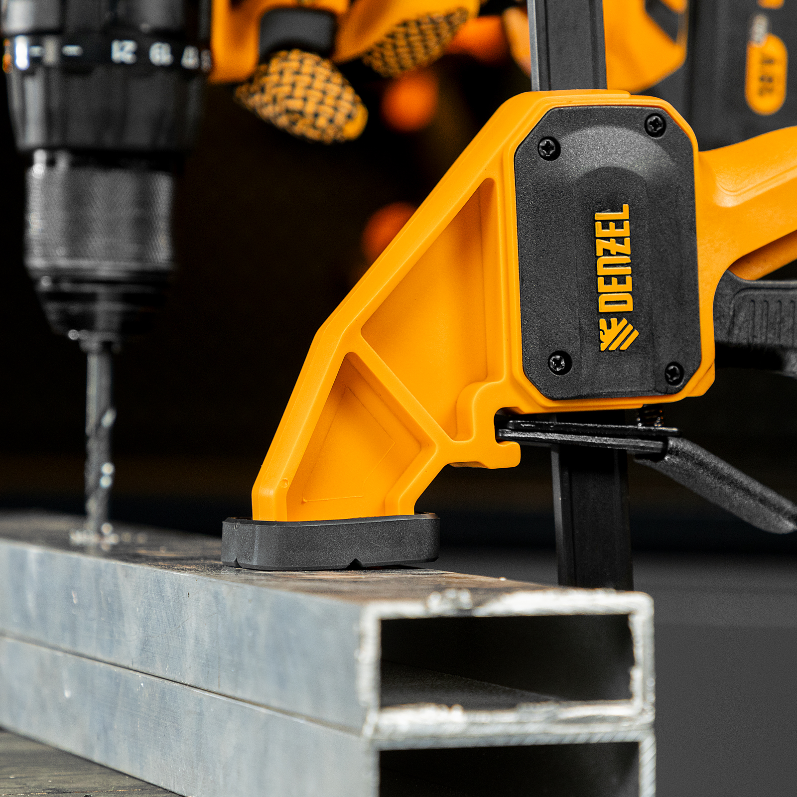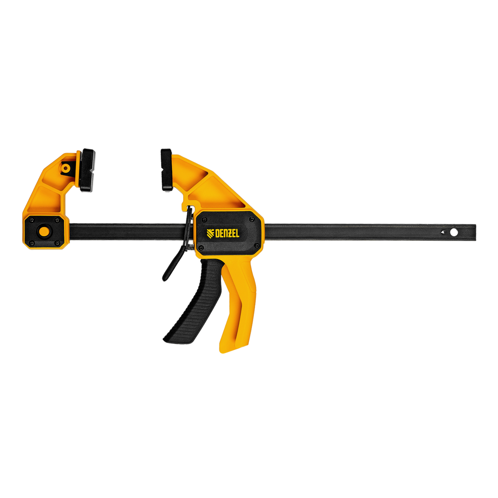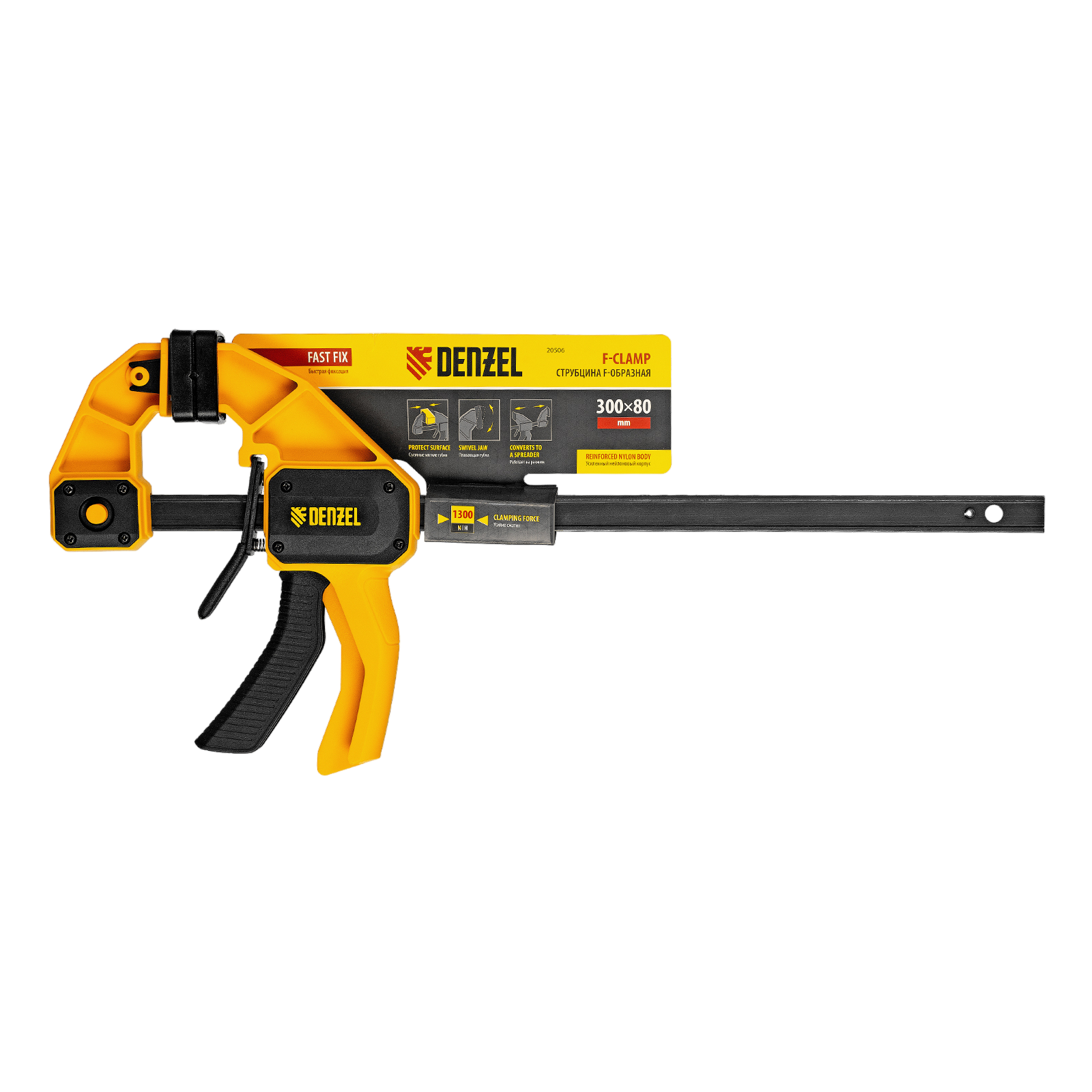 Струбцина F-образная быстрозажимная Denzel 20506 с пошаговым зажимом шириной 300 мм и глубиной 80 мм, с усиленным нейлоновым корпусом, позволяет прочно зафиксировать детали для их обработки, склеивания и выполнения других задач. Сила сжатия составляет 1300 Н. Струбцина подходит для бытового и профессионального применения.
