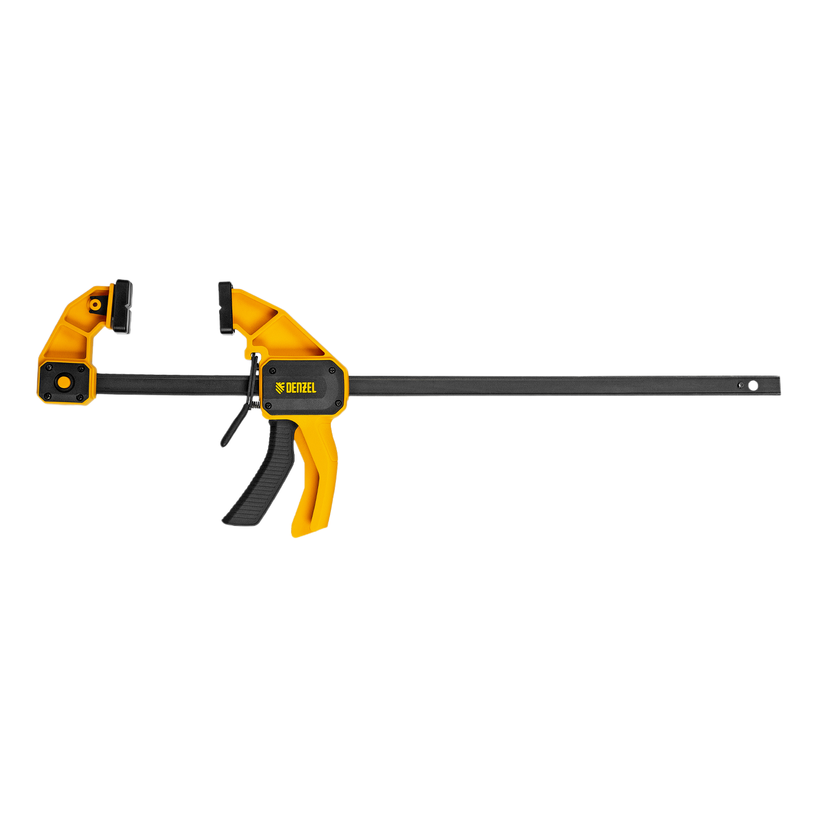 - Комфортное использование — струбцина весит всего 710 г, обрезиненная кнопка фиксации обеспечивает удобный захват.