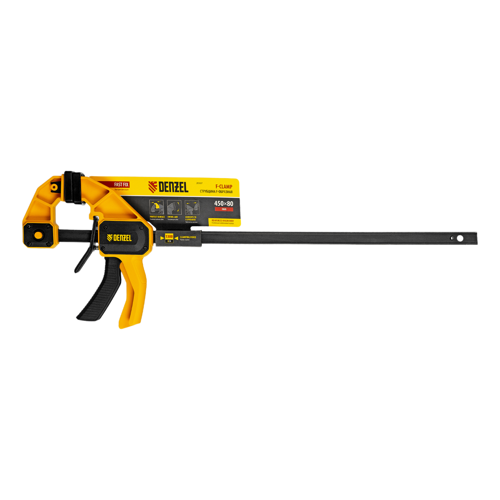 Струбцина F-образная быстрозажимная Denzel 20507 с пошаговым зажимом шириной 450 мм и глубиной 80 мм, с усиленным нейлоновым корпусом, позволяет прочно зафиксировать детали для их обработки, склеивания и выполнения других задач. Сила сжатия составляет 1300 Н. Струбцина подходит для бытового и профессионального применения.