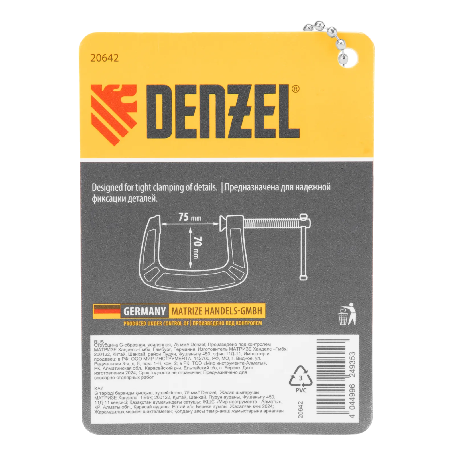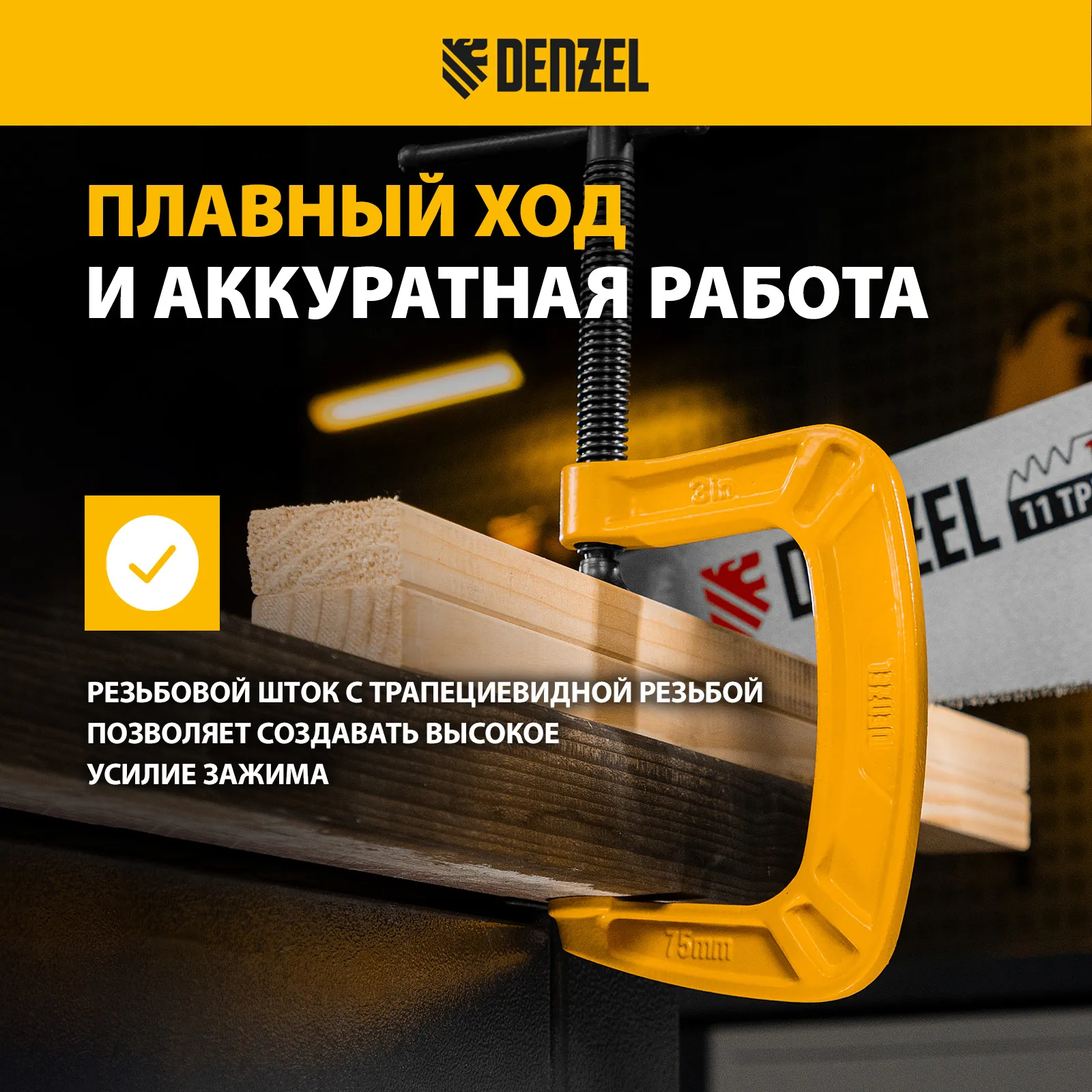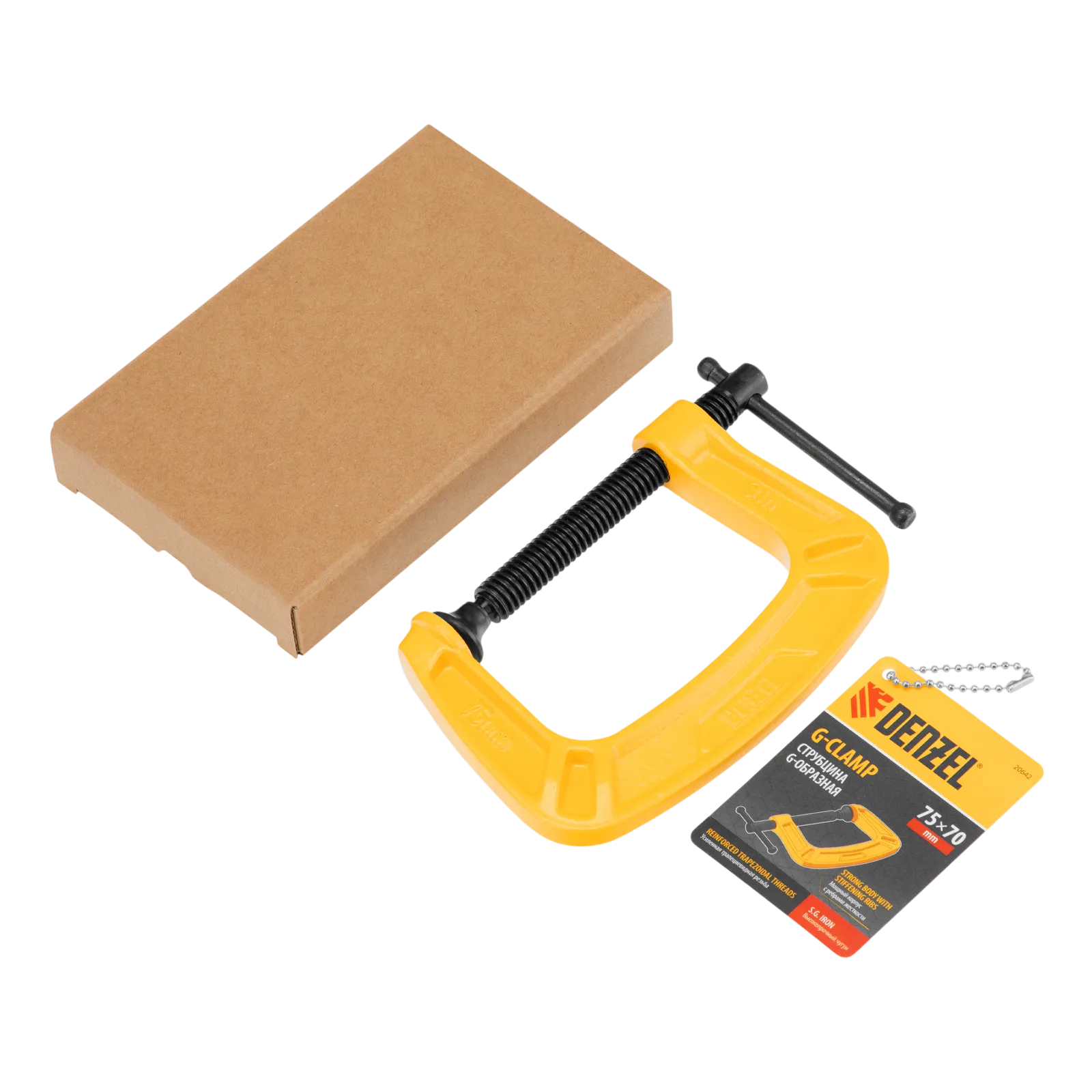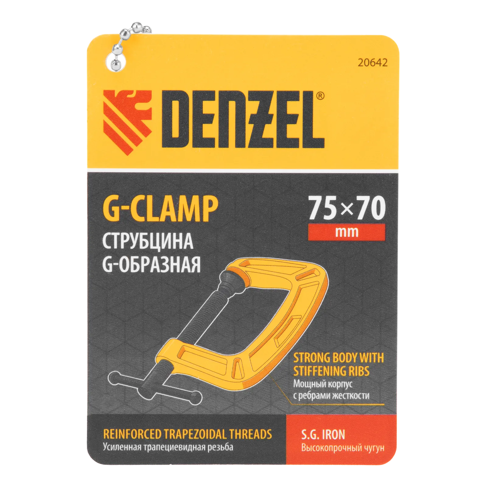 G-образная струбцина Denzel 20642 с максимальной шириной зажима 75 мм используется для фиксации заготовок или закрепления их на верстаке, станке или между собой. Позволяет склеивать детали, а также сверлить их, шлифовать, опиливать и проводить другие работы. Может использоваться во время выполнения сварочных работ. Винт с трапециевидной резьбой обеспечивает надежную фиксацию предметов. Струбцина применяется в слесарном и столярном деле, будет полезна также домашнем хозяйстве.