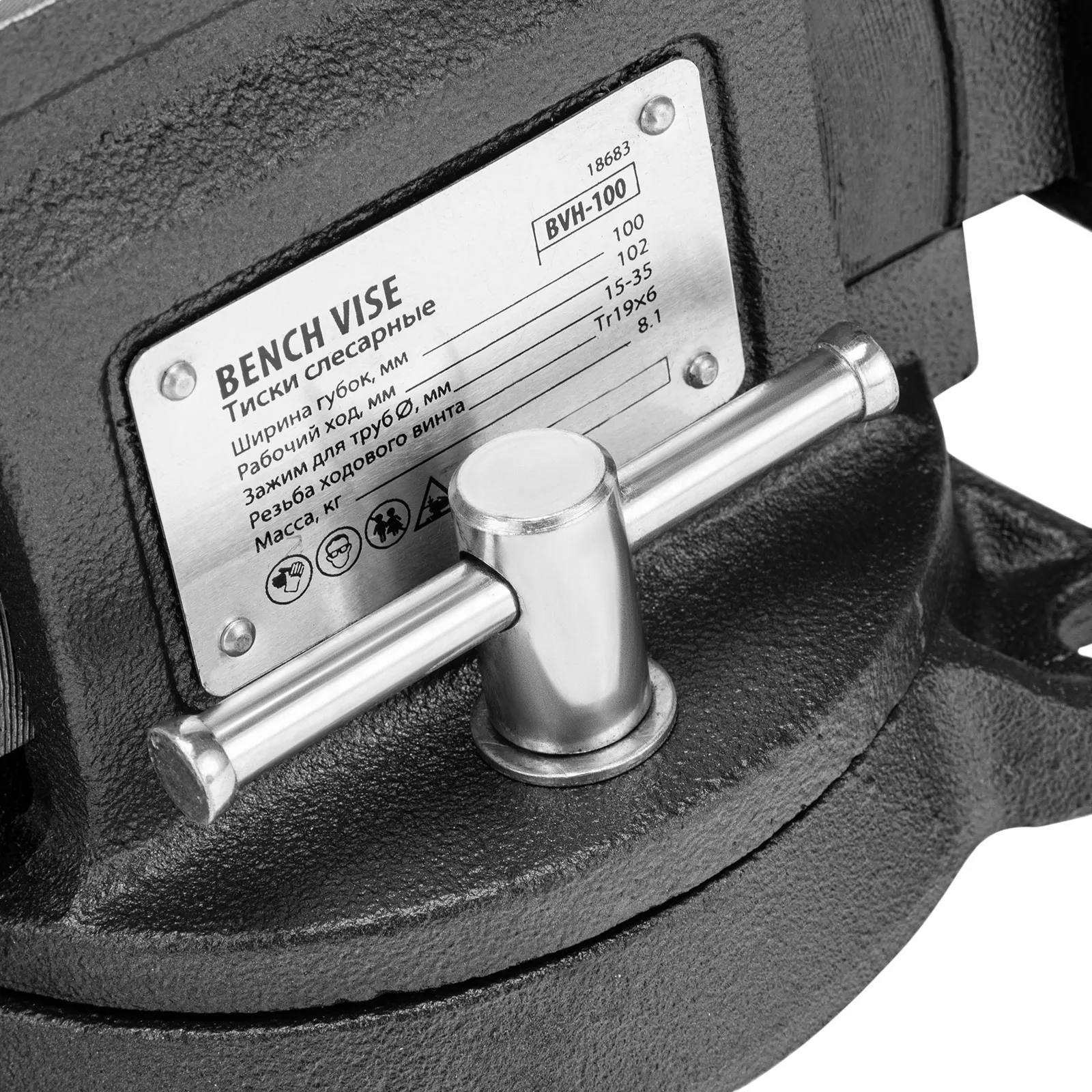 Слесарные поворотные тиски Denzel BVH-100 18683 с губками шириной 100 мм и стальной направляющей предназначены для фиксации деталей и заготовок, а также для выполнения мелких ударных работ — в конструкции предусмотрена наковальня. Рабочий ход составляет 100 мм, глубина зажима — 60 мм. Специальный зажим позволяет фиксировать трубы диаметром 15-35 мм, что расширяет возможности использования инструмента. На губки можно установить защитные накладки (приобретаются отдельно) для предотвращения повреждения зажимаемых предметов. Тиски поставляются с болтами для фиксации на рабочем столе и запасными штифтами-предохранителями. Пригодятся в мастерской и гараже.
