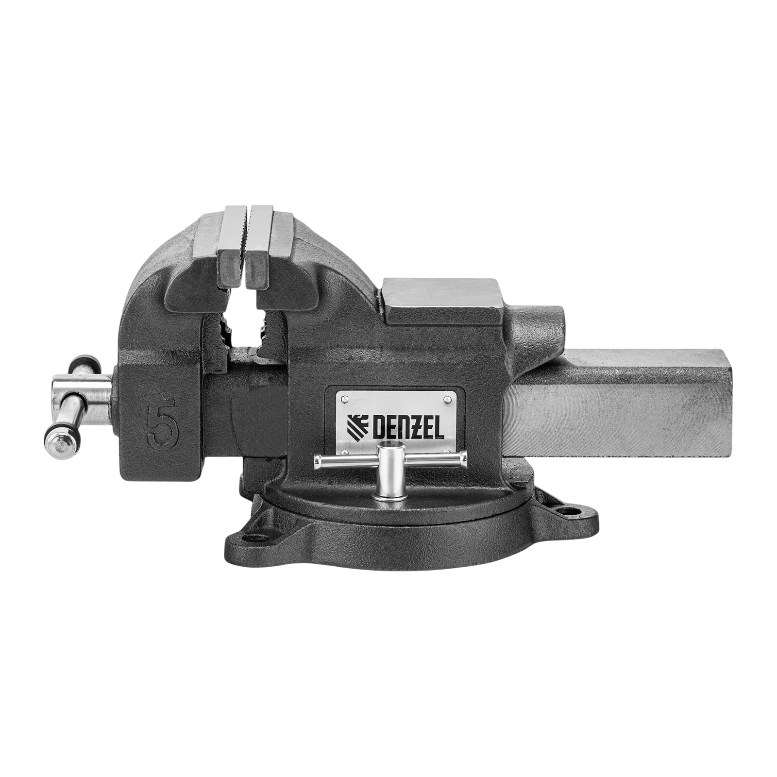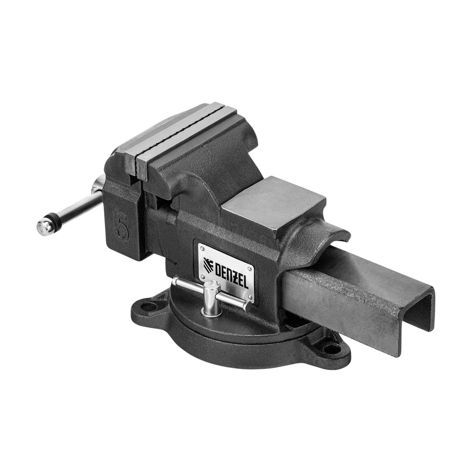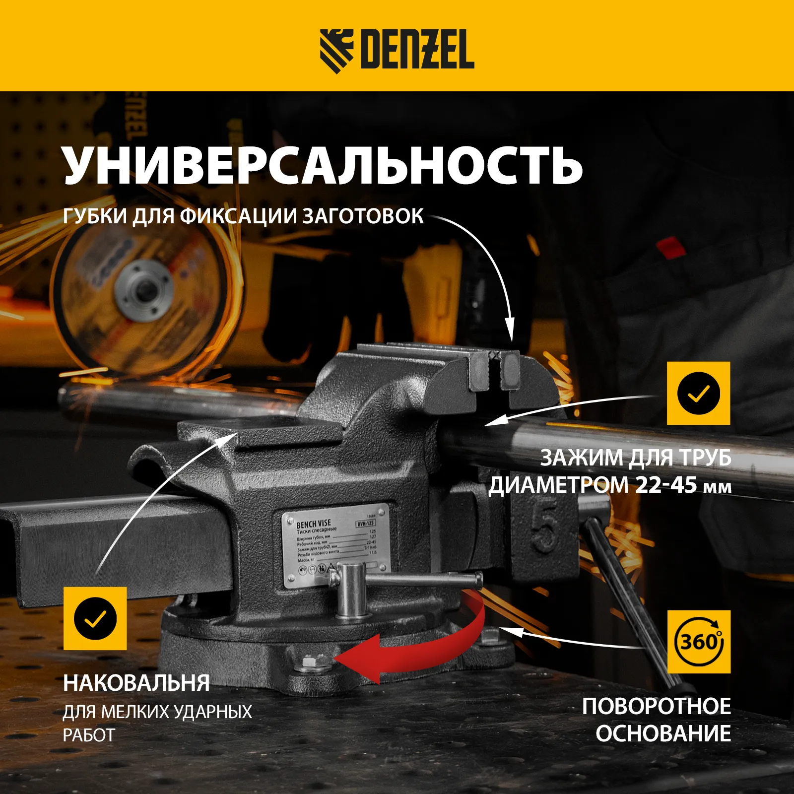 Слесарные поворотные тиски Denzel BVH-125 18684 с губками шириной 125 мм и стальной направляющей предназначены для фиксации деталей и заготовок, а также для выполнения мелких ударных работ — в конструкции предусмотрена наковальня. Рабочий ход составляет 125 мм, глубина зажима — 70 мм. Специальный зажим позволяет фиксировать трубы диаметром 22-45 мм, что расширяет возможности использования инструмента. На губки можно установить защитные накладки (приобретаются отдельно) для предотвращения повреждения зажимаемых предметов. Тиски пригодятся в мастерской и гараже.
