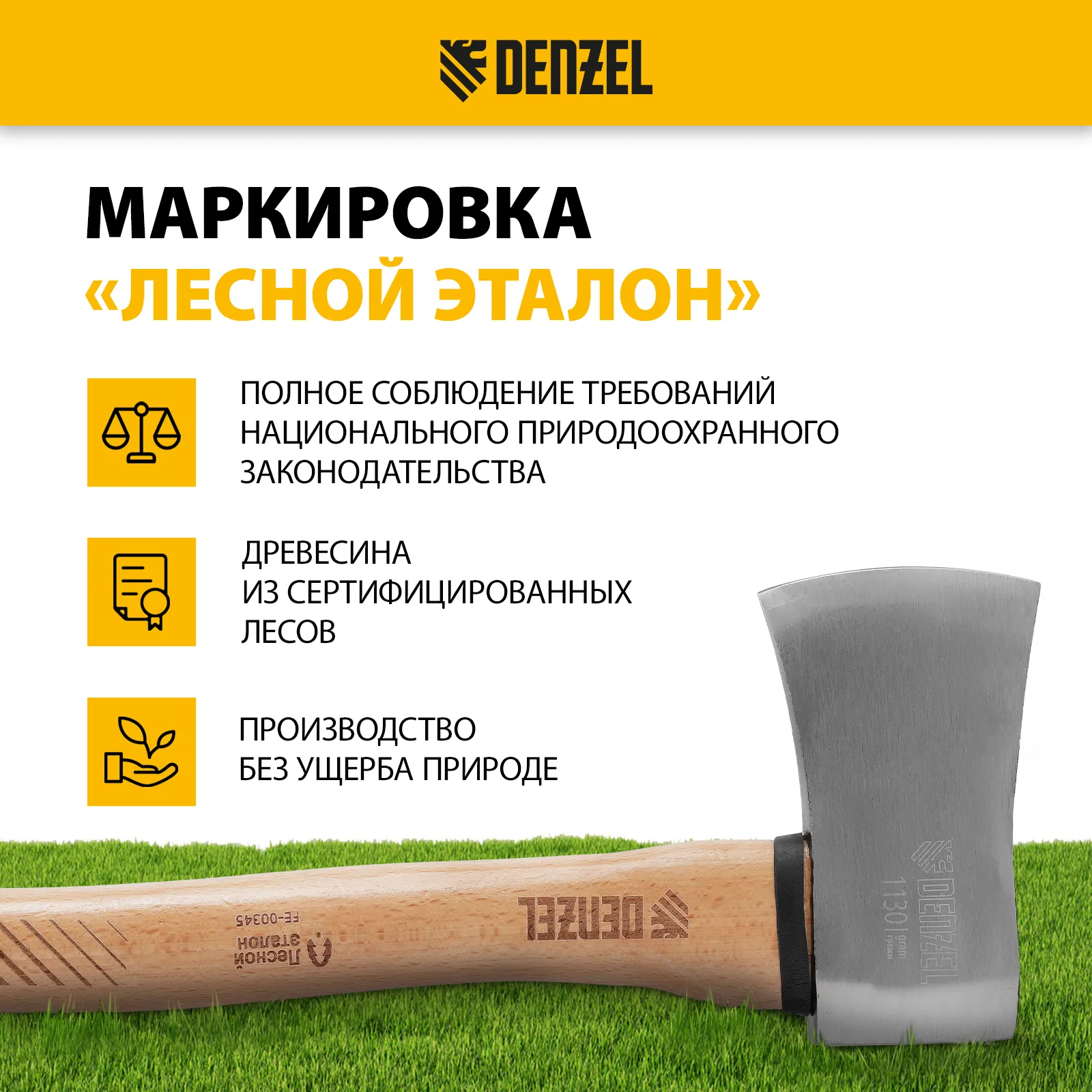 - Экологичность — инструмент соответствует стандартам системы «Лесной эталон», для изготовления топорища использована древесина из сертифицированных лесов, полностью соблюдены требования, направленные на сохранение экологически ценных лесов.