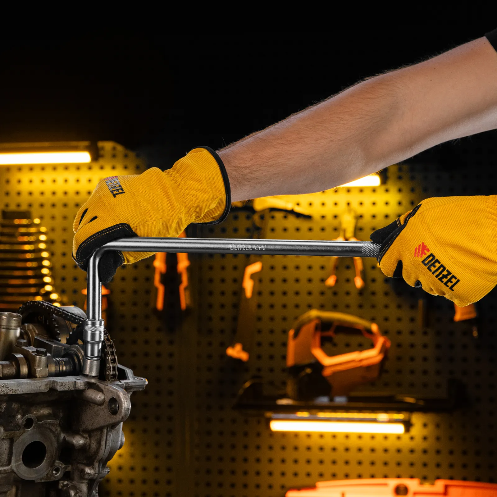 Г-образный вороток Denzel 14067 из стали CrV, размером 375 х 100 мм, с присоединительным квадратом 1/2", с покрытием «матовый хром», предназначен для ручного монтажа и демонтажа гаек, болтов и другого резьбового крепежа с помощью торцевых головок. Может использоваться в бытовой и профессиональной сфере: для ремонта велосипедов, автомобилей, станков.