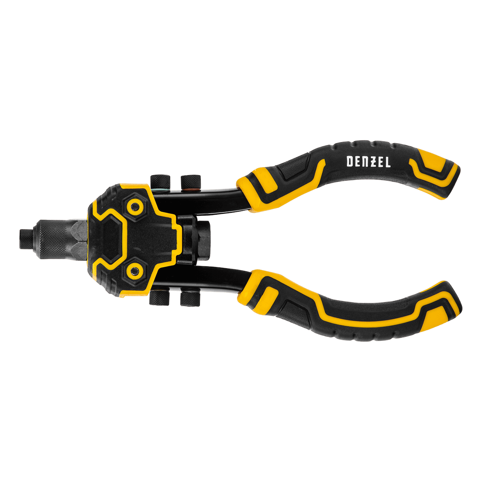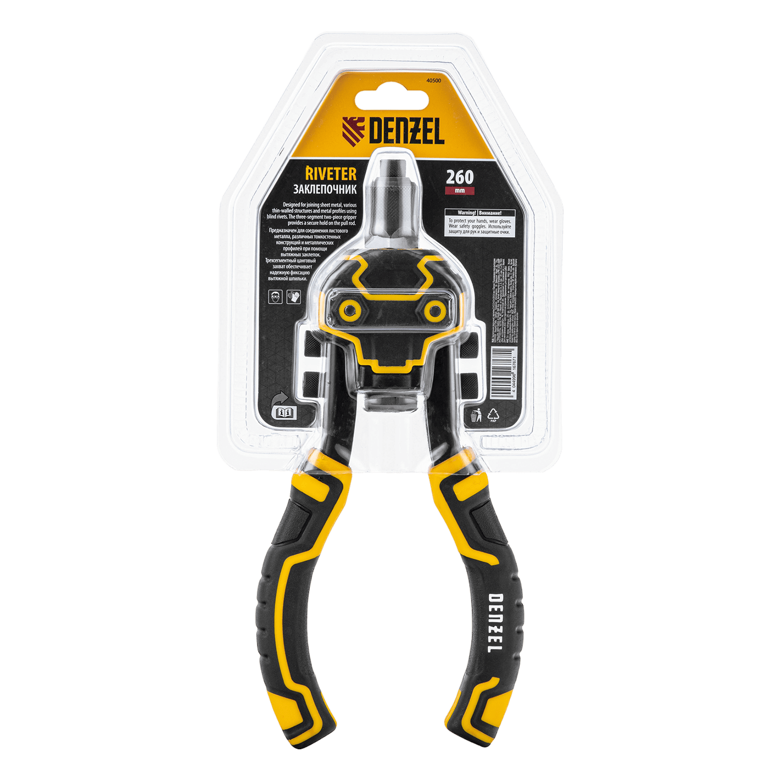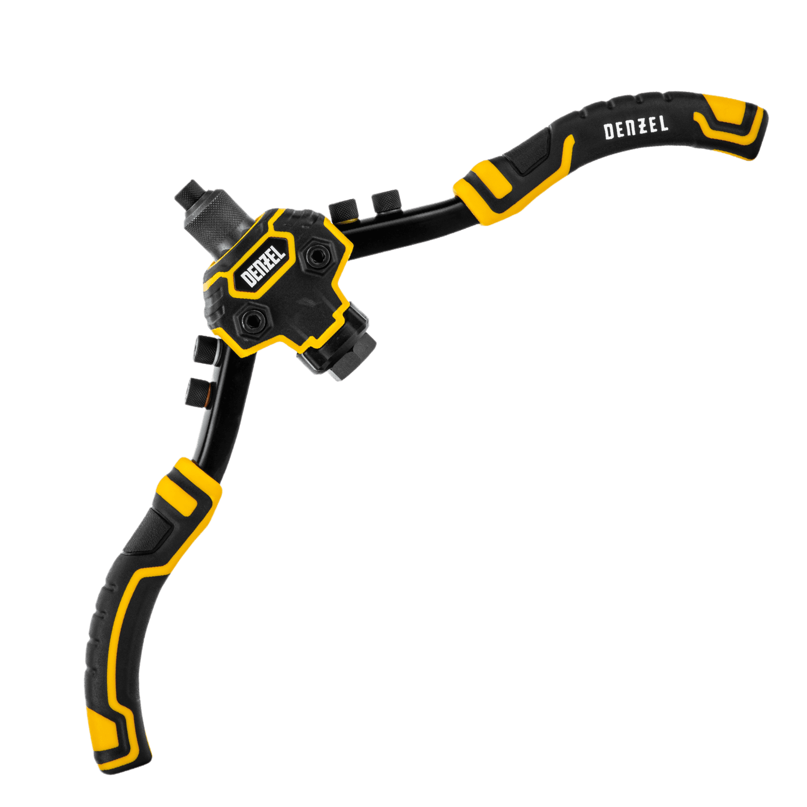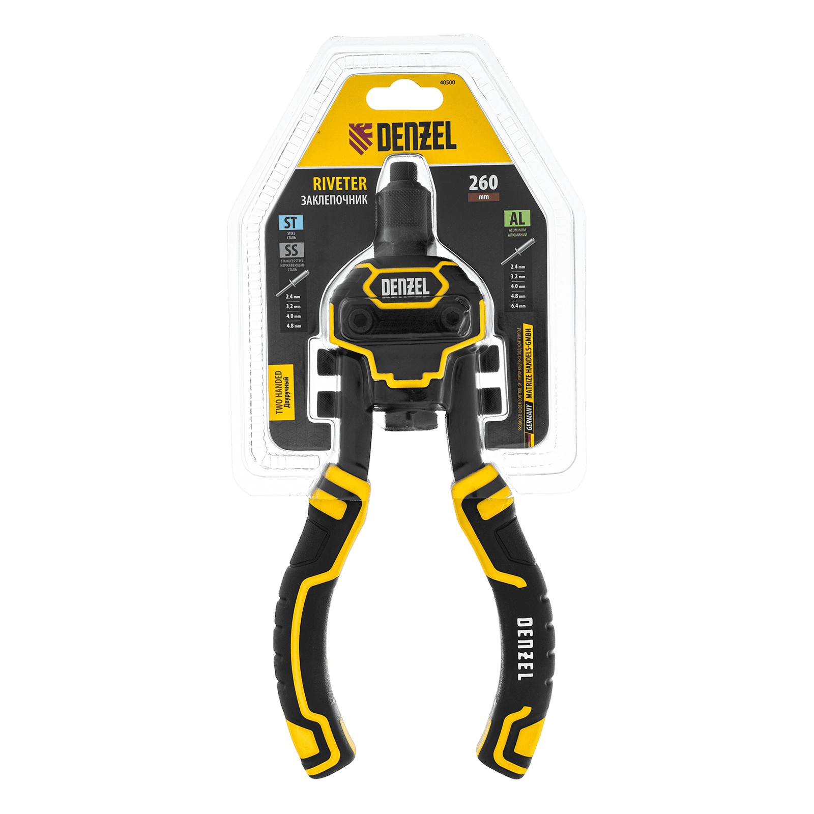 Заклепочник двуручный Denzel 40500 длиной 250 мм предназначен для работы с алюминиевыми и стальными заклепками диаметром 2,4-6,4 мм и 2,4-4,8 мм соответственно. Используется для прочного соединения листовых металлических заготовок, легких конструкций небольшой толщины и металлопрофилей. Двуручный заклепочник требует меньше усилий от пользователя для вытягивания шпильки, поэтому подходит для профессионального применения и выполнения больших объемов работ.