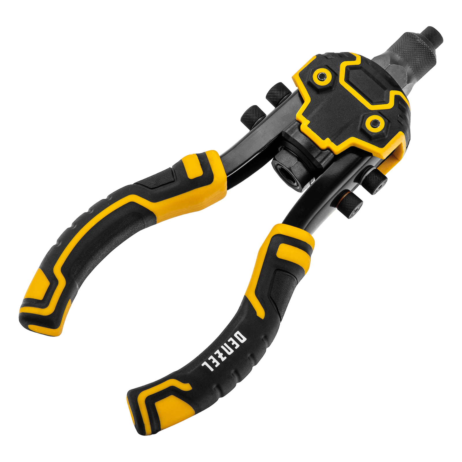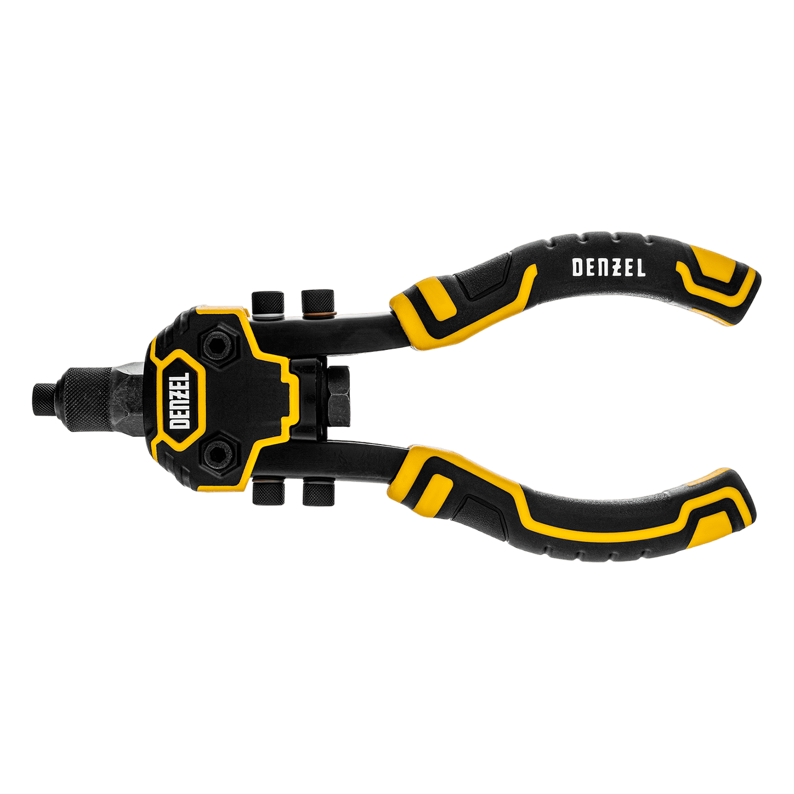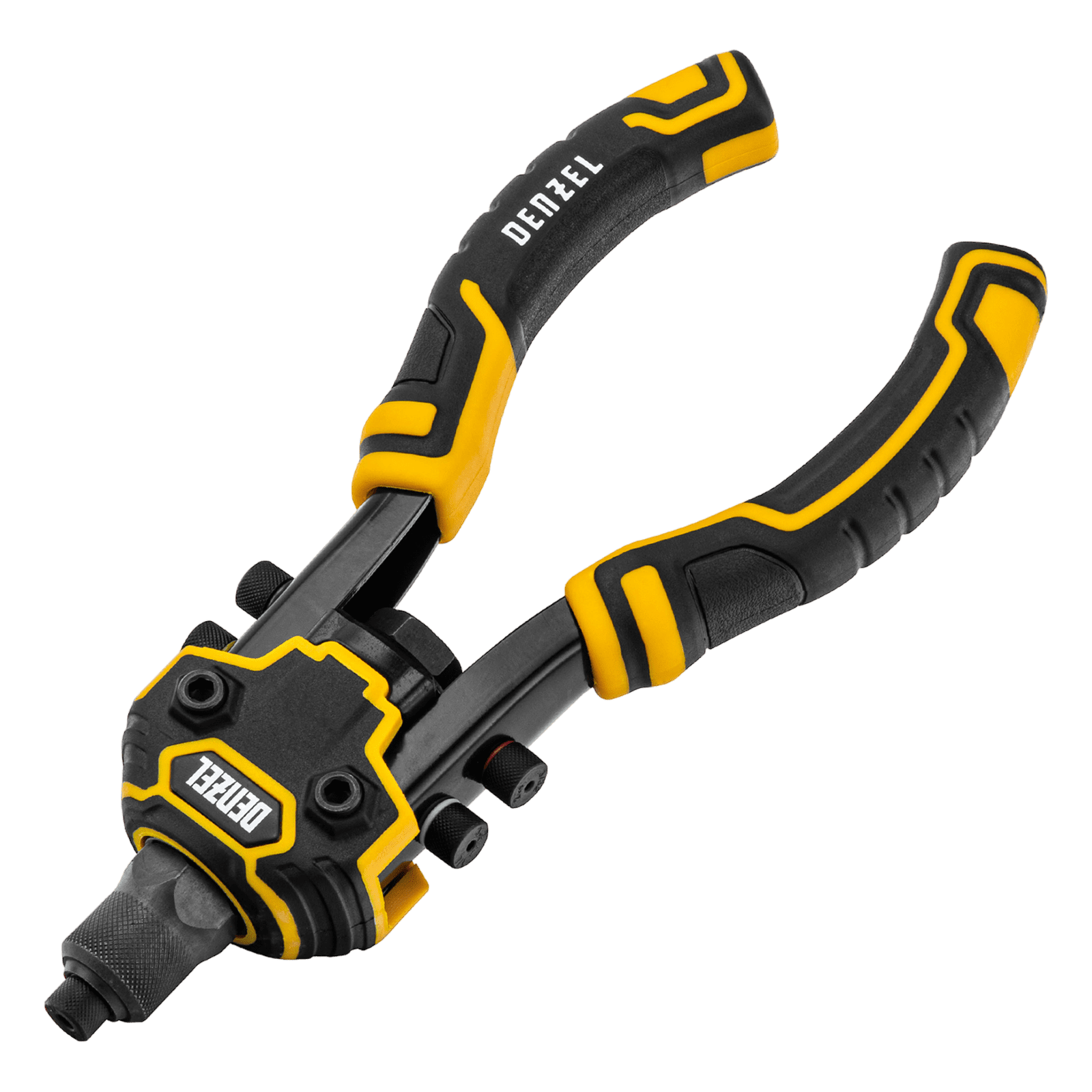 Заклепочник двуручный Denzel 40500 длиной 250 мм предназначен для работы с алюминиевыми и стальными заклепками диаметром 2,4-6,4 мм и 2,4-4,8 мм соответственно. Используется для прочного соединения листовых металлических заготовок, легких конструкций небольшой толщины и металлопрофилей. Двуручный заклепочник требует меньше усилий от пользователя для вытягивания шпильки, поэтому подходит для профессионального применения и выполнения больших объемов работ.