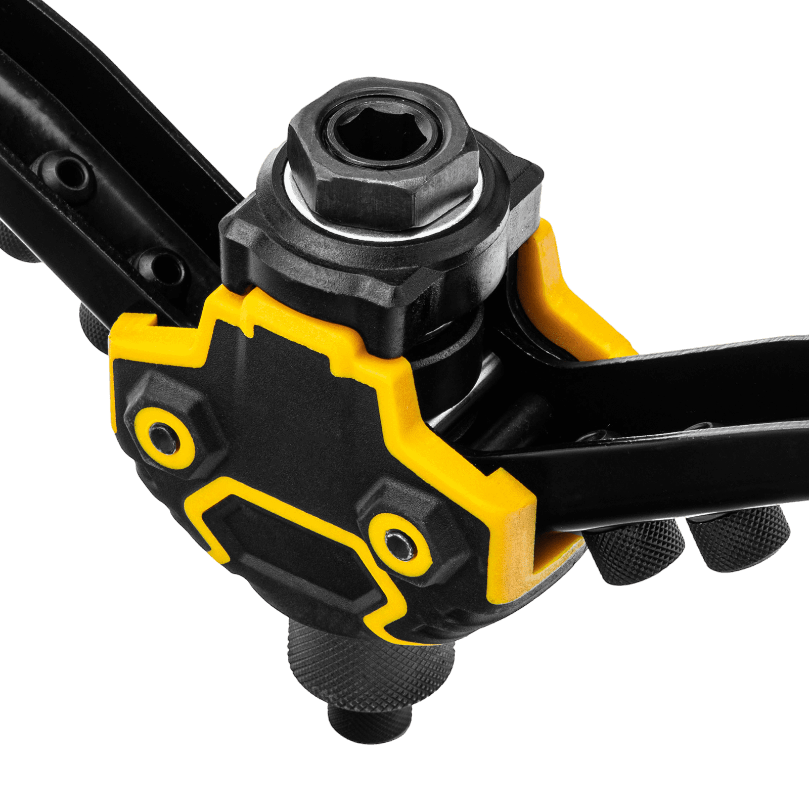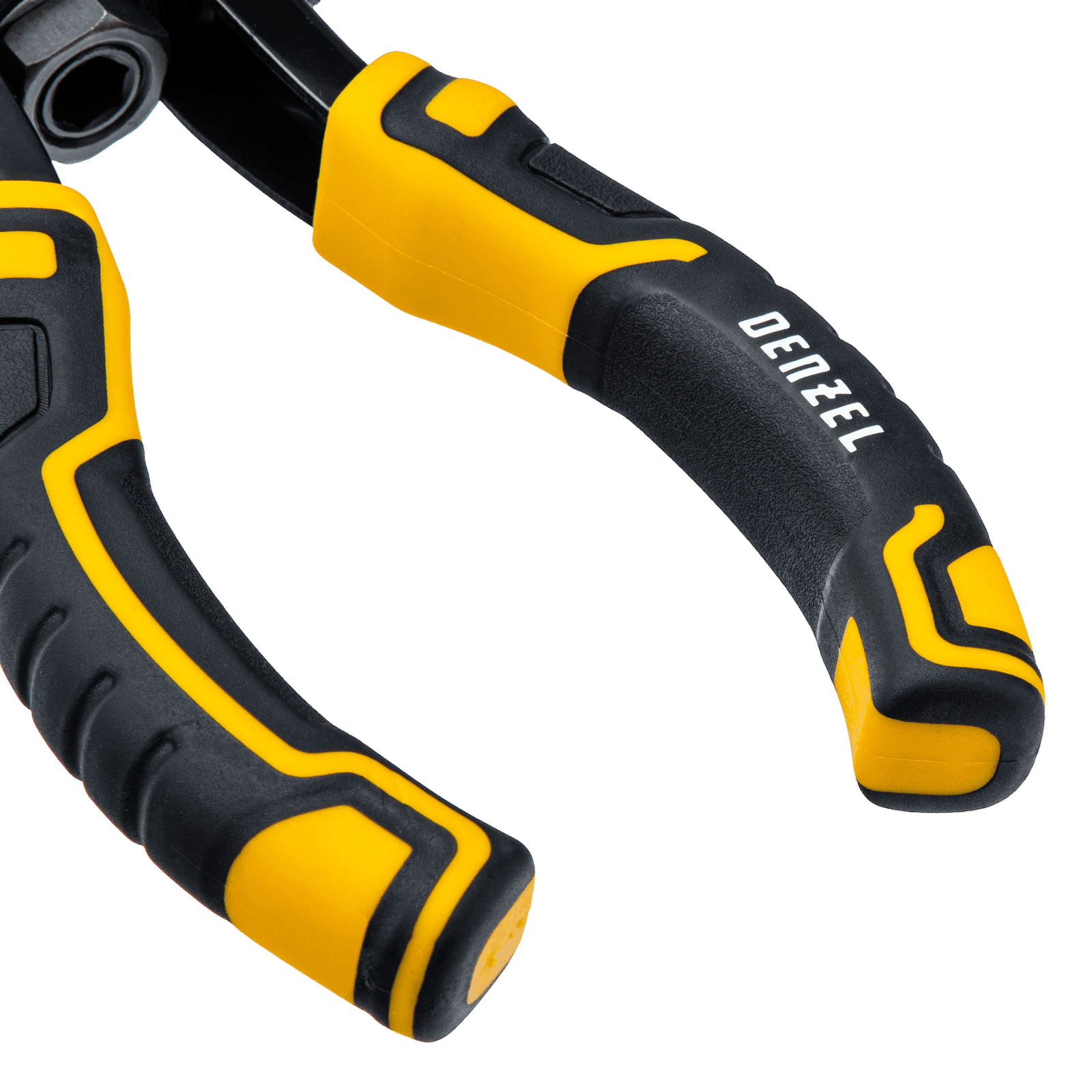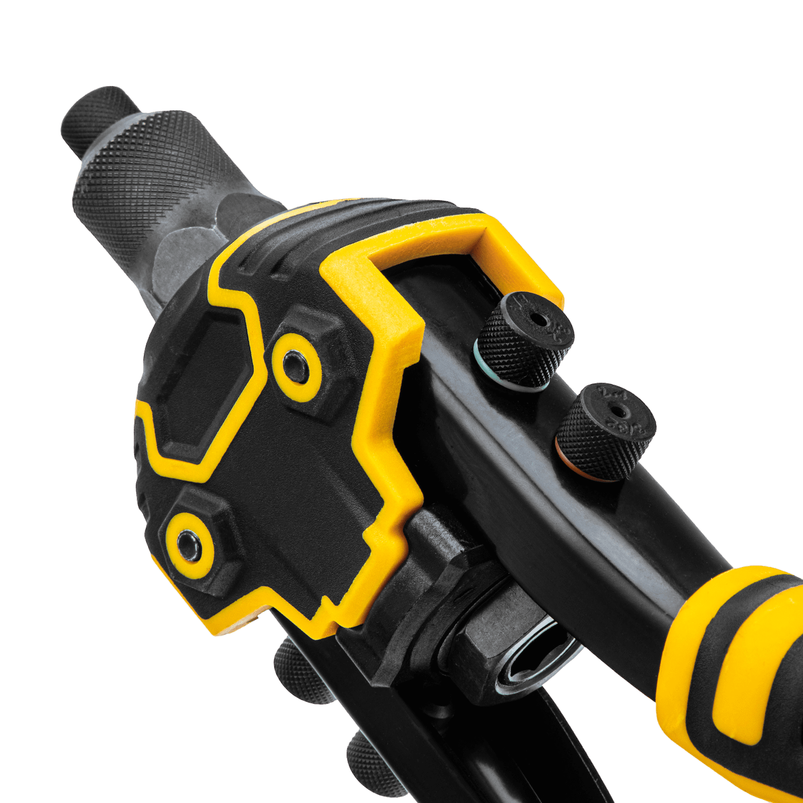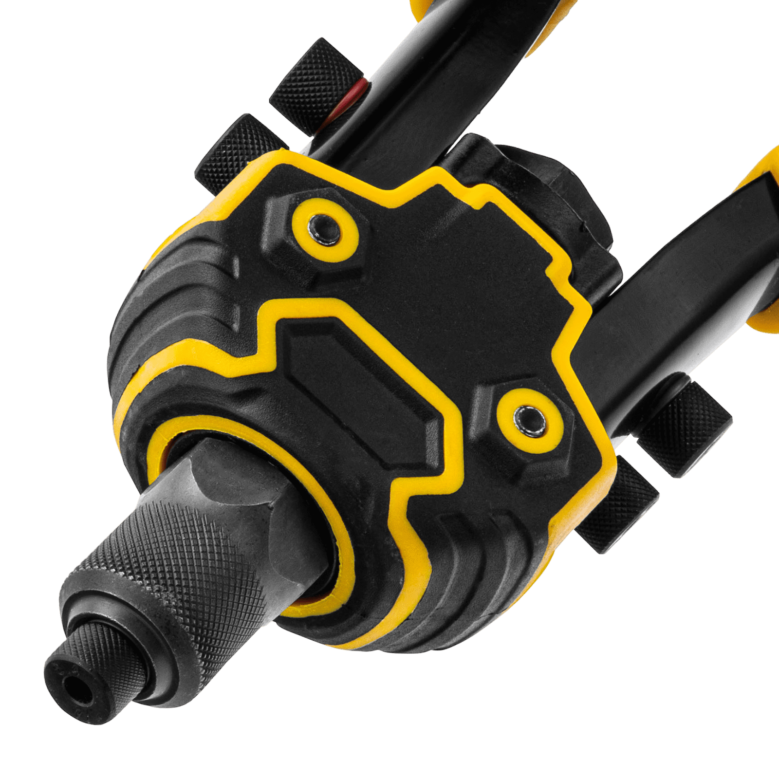 Заклепочник двуручный Denzel 40500 длиной 250 мм предназначен для работы с алюминиевыми и стальными заклепками диаметром 2,4-6,4 мм и 2,4-4,8 мм соответственно. Используется для прочного соединения листовых металлических заготовок, легких конструкций небольшой толщины и металлопрофилей. Двуручный заклепочник требует меньше усилий от пользователя для вытягивания шпильки, поэтому подходит для профессионального применения и выполнения больших объемов работ.