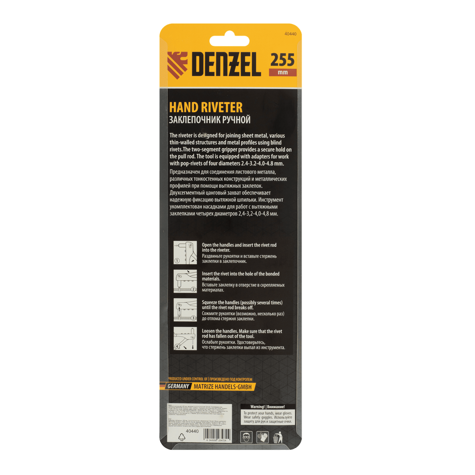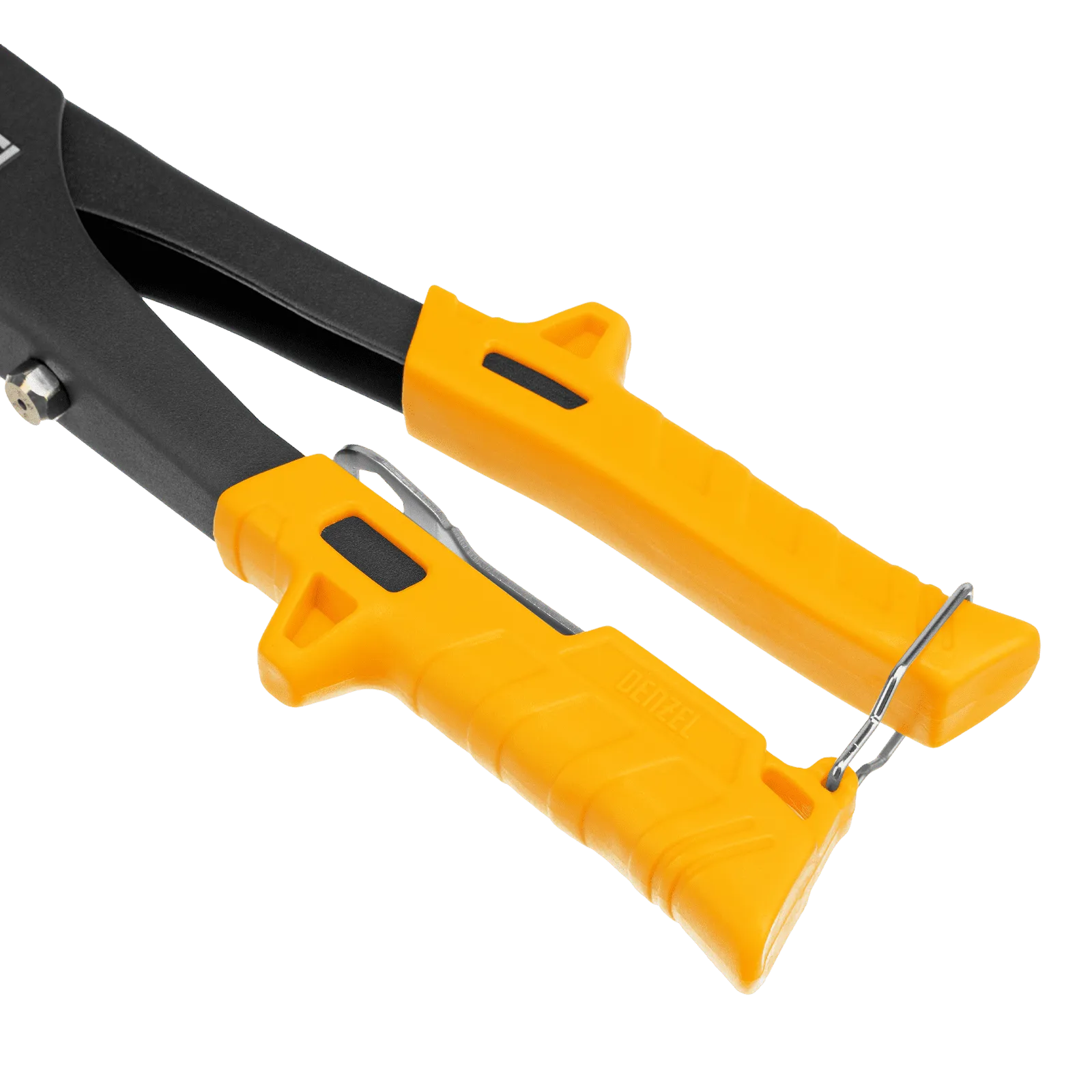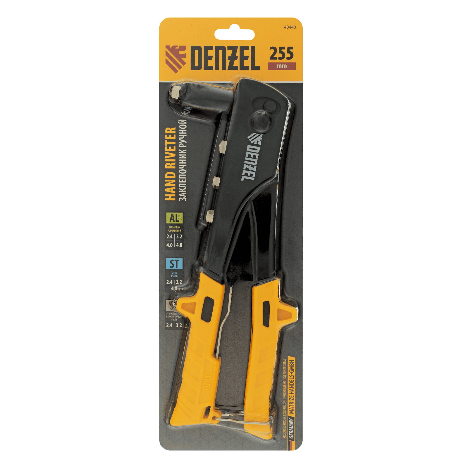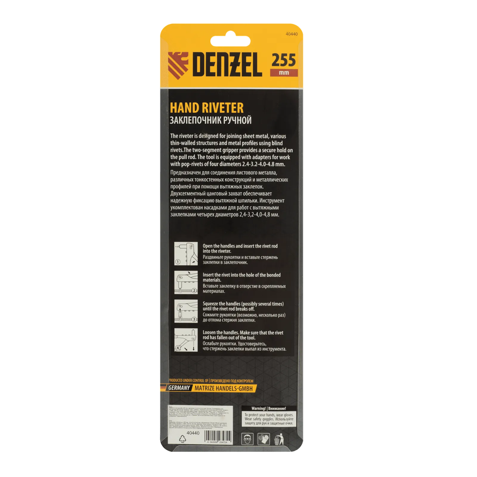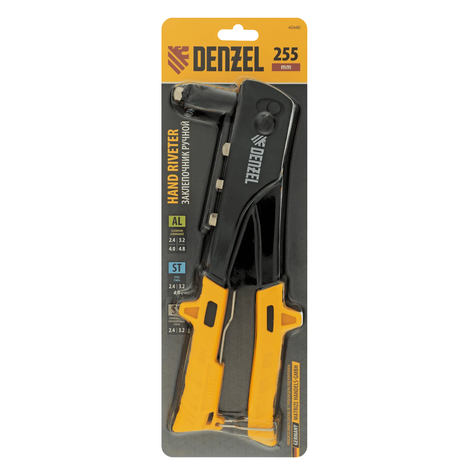 Ручной заклепочник Denzel 40440 длиной 255 мм предназначен для работы с алюминиевыми вытяжными заклепками диаметром 2,4-3,2-4,0-4,8 мм, стальными диаметром 2,4-3,2-4,0 мм и вытяжными заклепками из «нержавейки» диаметром 2,4-3,2 мм. Инструмент позволяет соединять листовые металлические заготовки, металлопрофиль и легкие конструкции небольшой толщины. Используется для проведения строительных, ремонтных и монтажных работ как в быту, так и в профессиональной сфере.