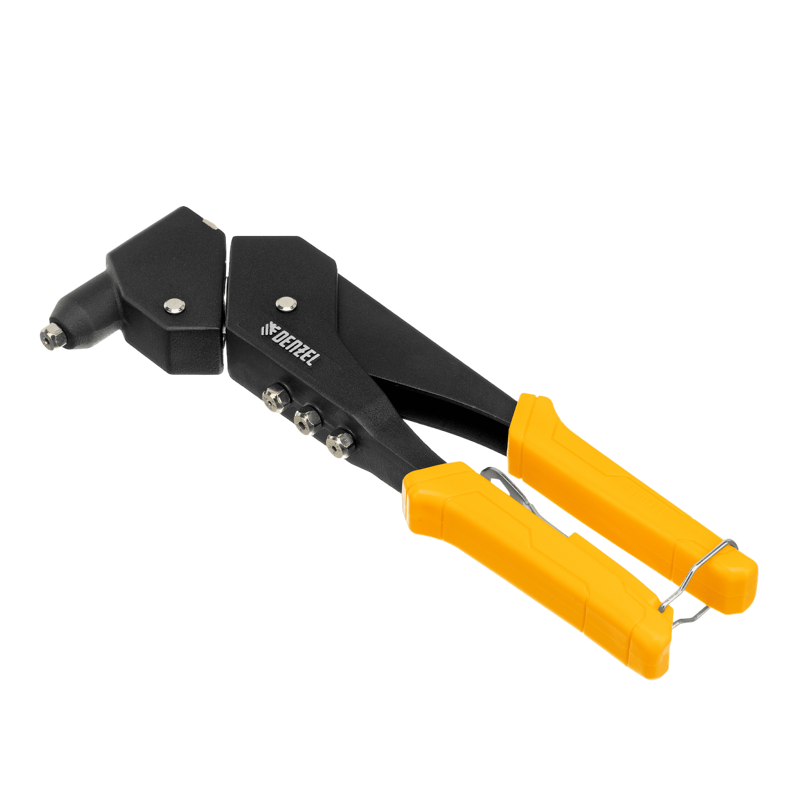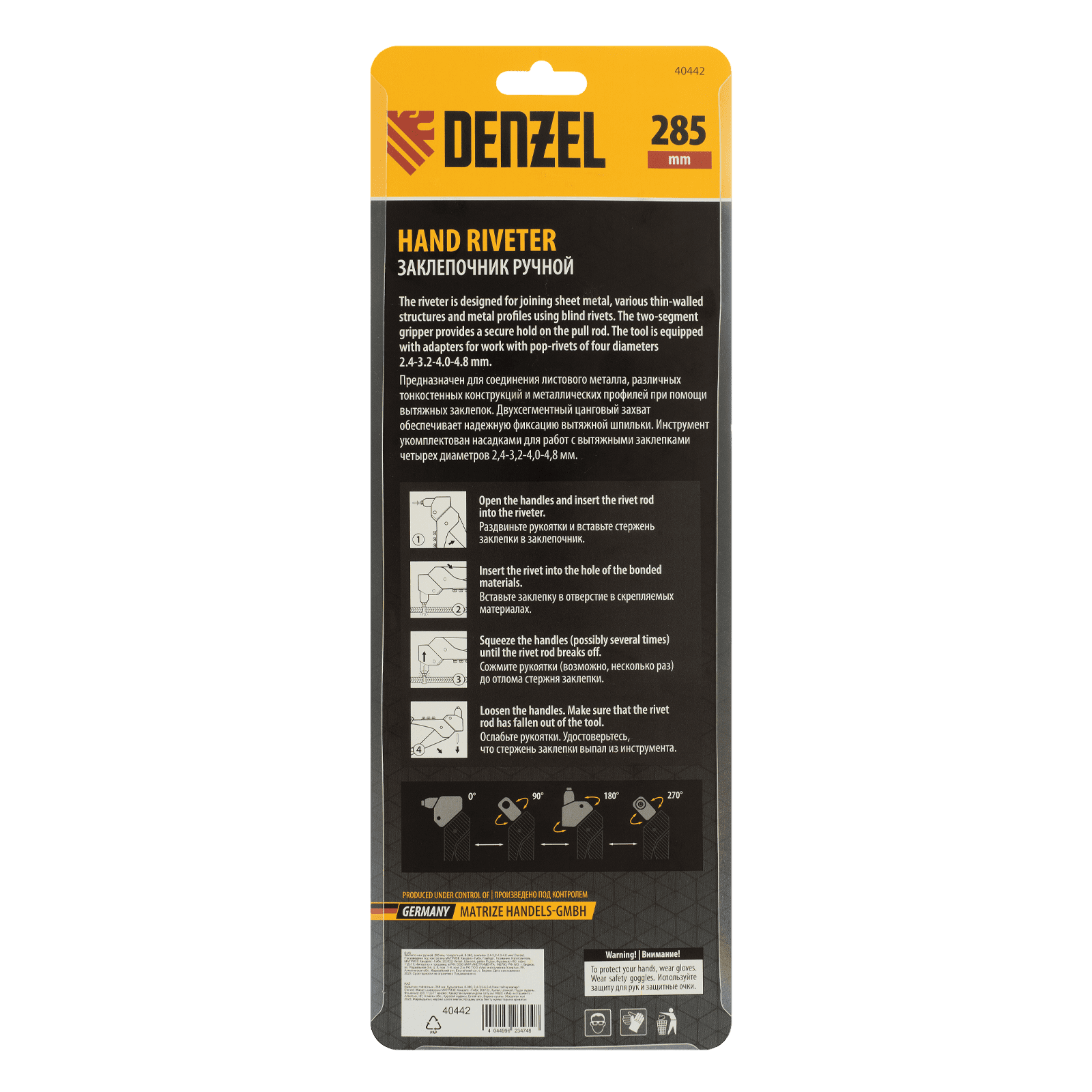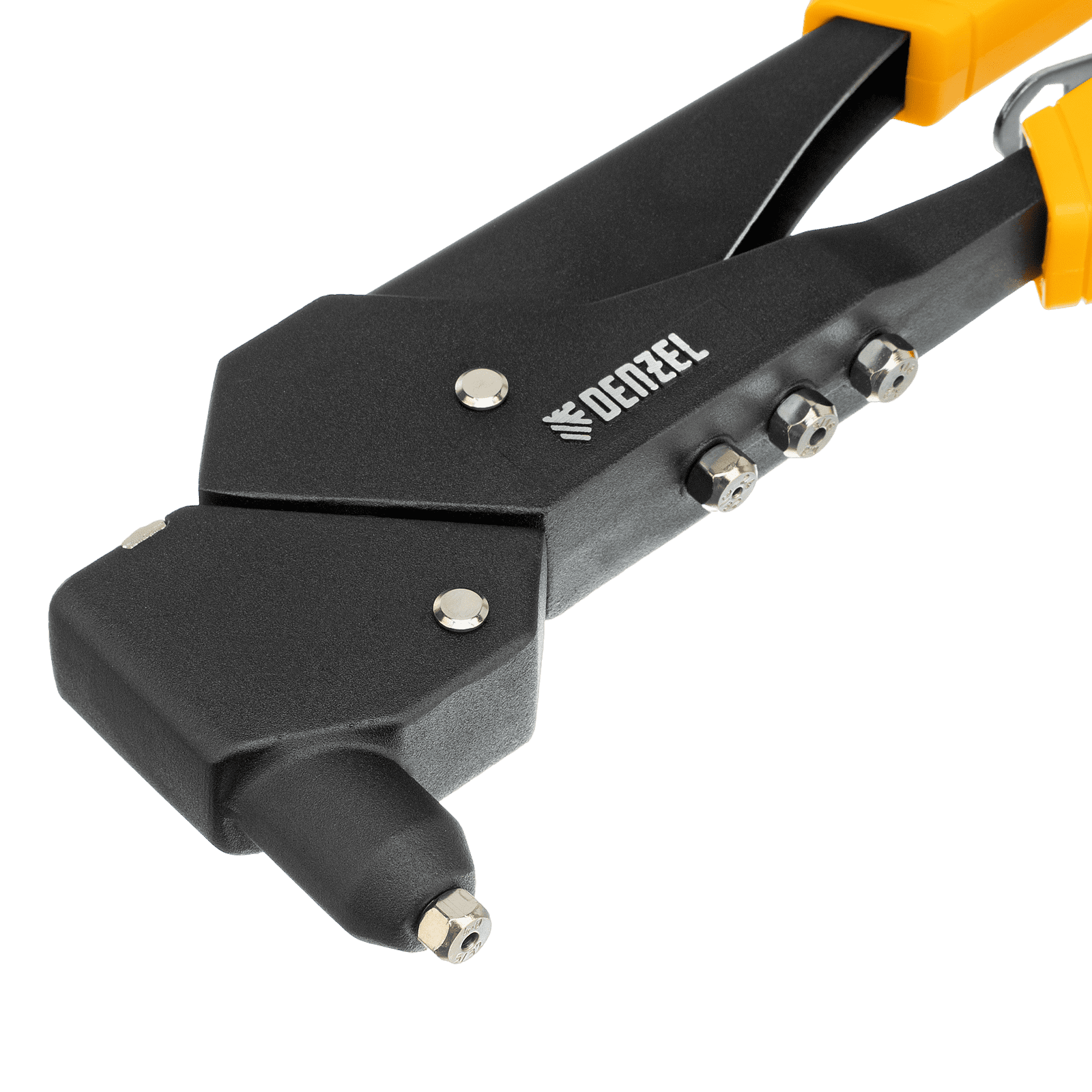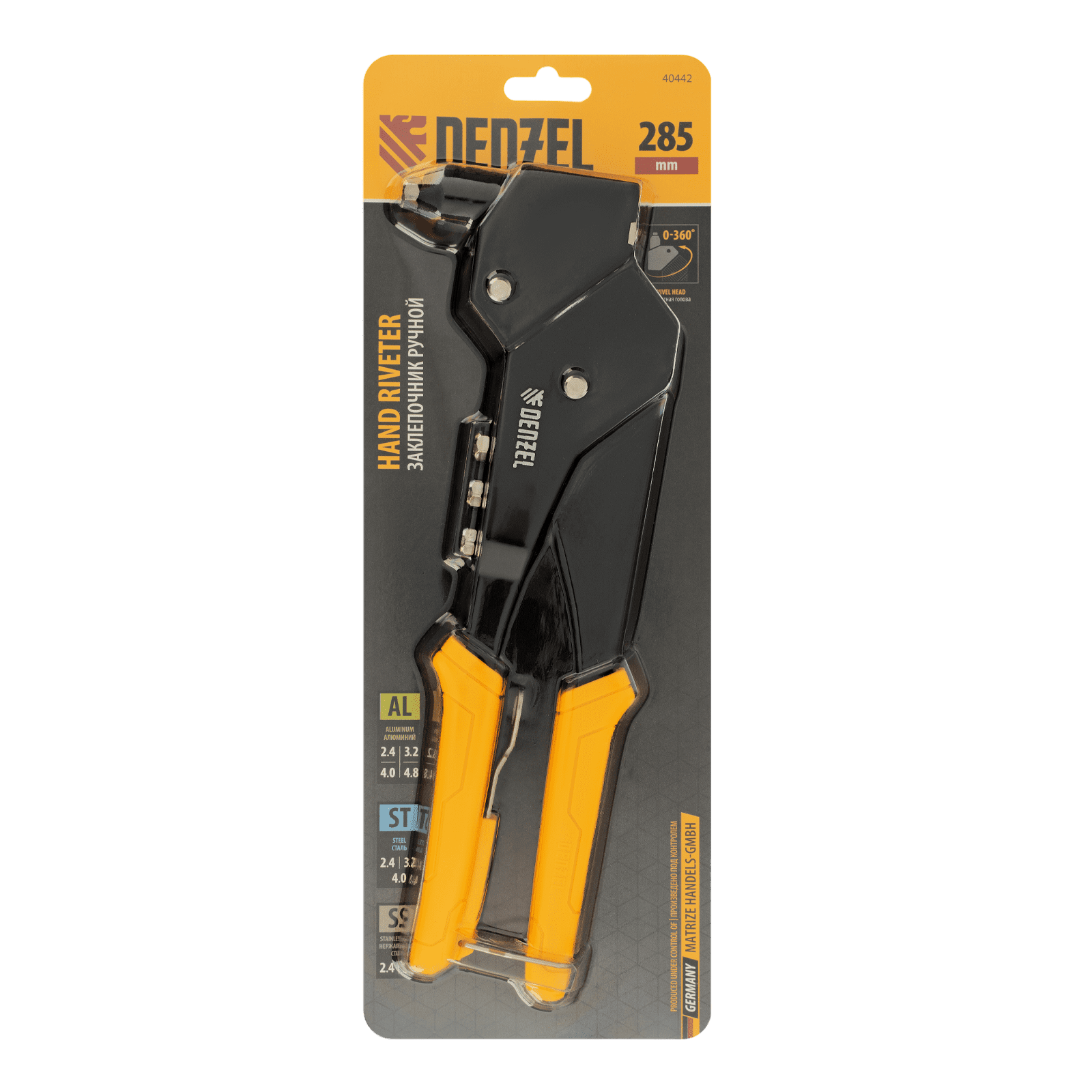 Заклепочник ручной литой Denzel 40442 длиной 285 мм, поворотный на 0-360°, используется для создания неразъемных соединений с помощью алюминиевых вытяжных заклепок диаметром 2,4-3,2-4,0-4,8 мм, стальных диаметром 2,4-3,2-4,0 мм и вытяжных заклепок из «нержавейки» диаметром 2,4-3,2 мм. Голова инструмента вращается на 360°, что упрощает работу в стесненных условиях. Заклепочник пригодится на производстве, в ремонтной мастерской, а также в быту.