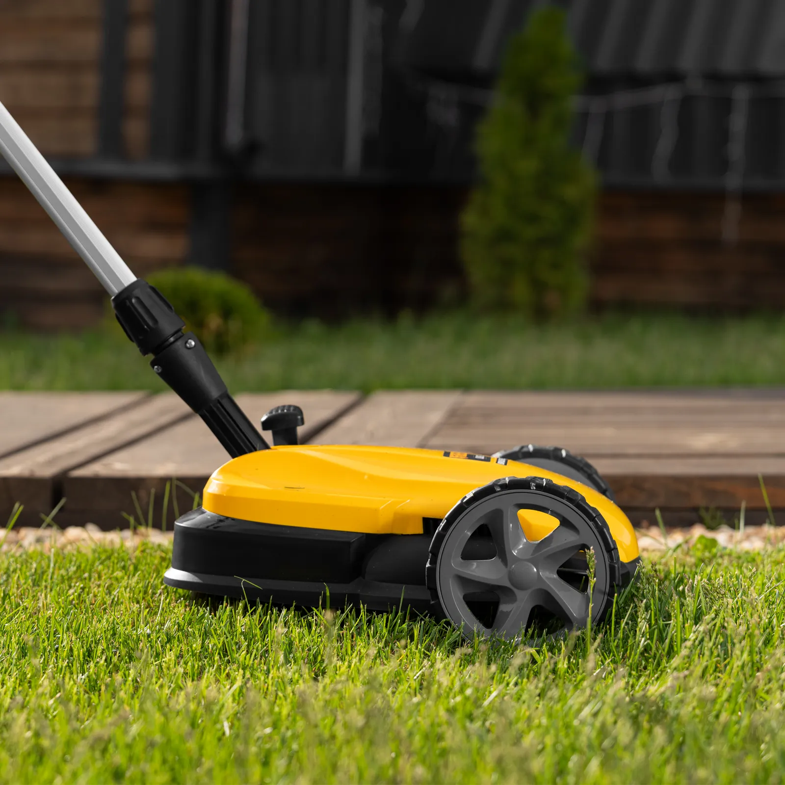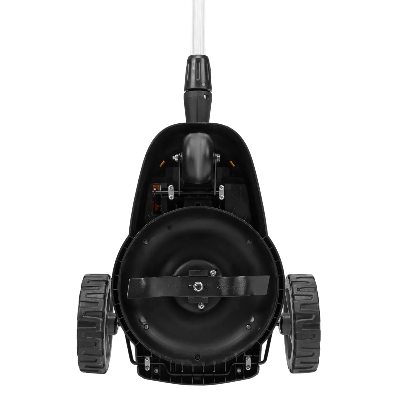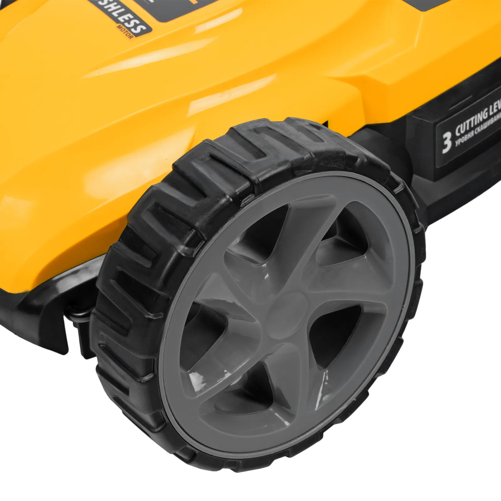 - Мобильность — благодаря небольшому весу 3,7 кг (без АКБ), двум большим и одному малому сферическому колесу технику легко перемещать, косить траву удобно даже в узких и труднодоступных местах.