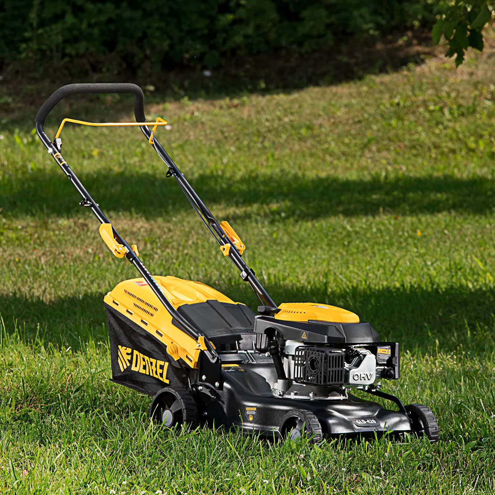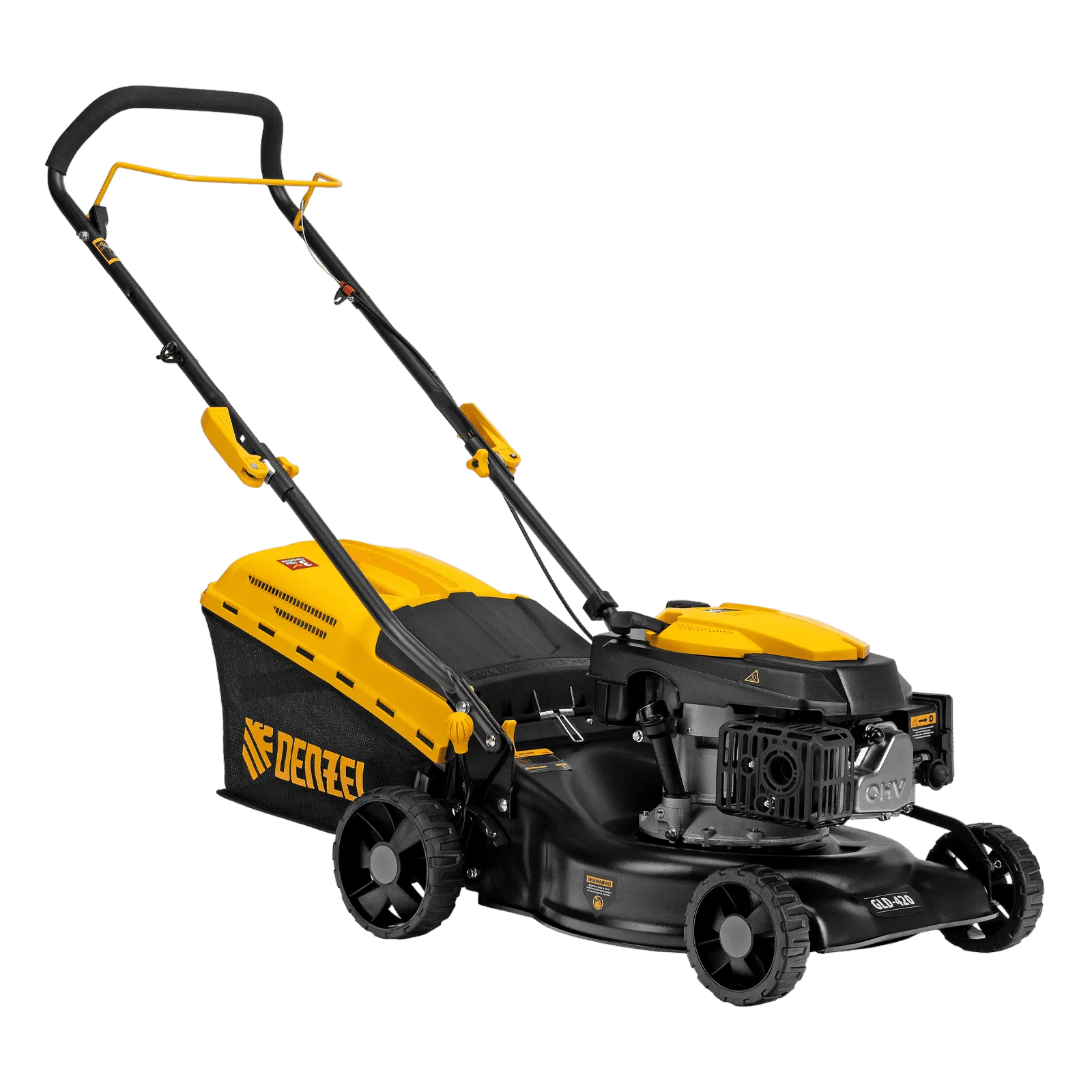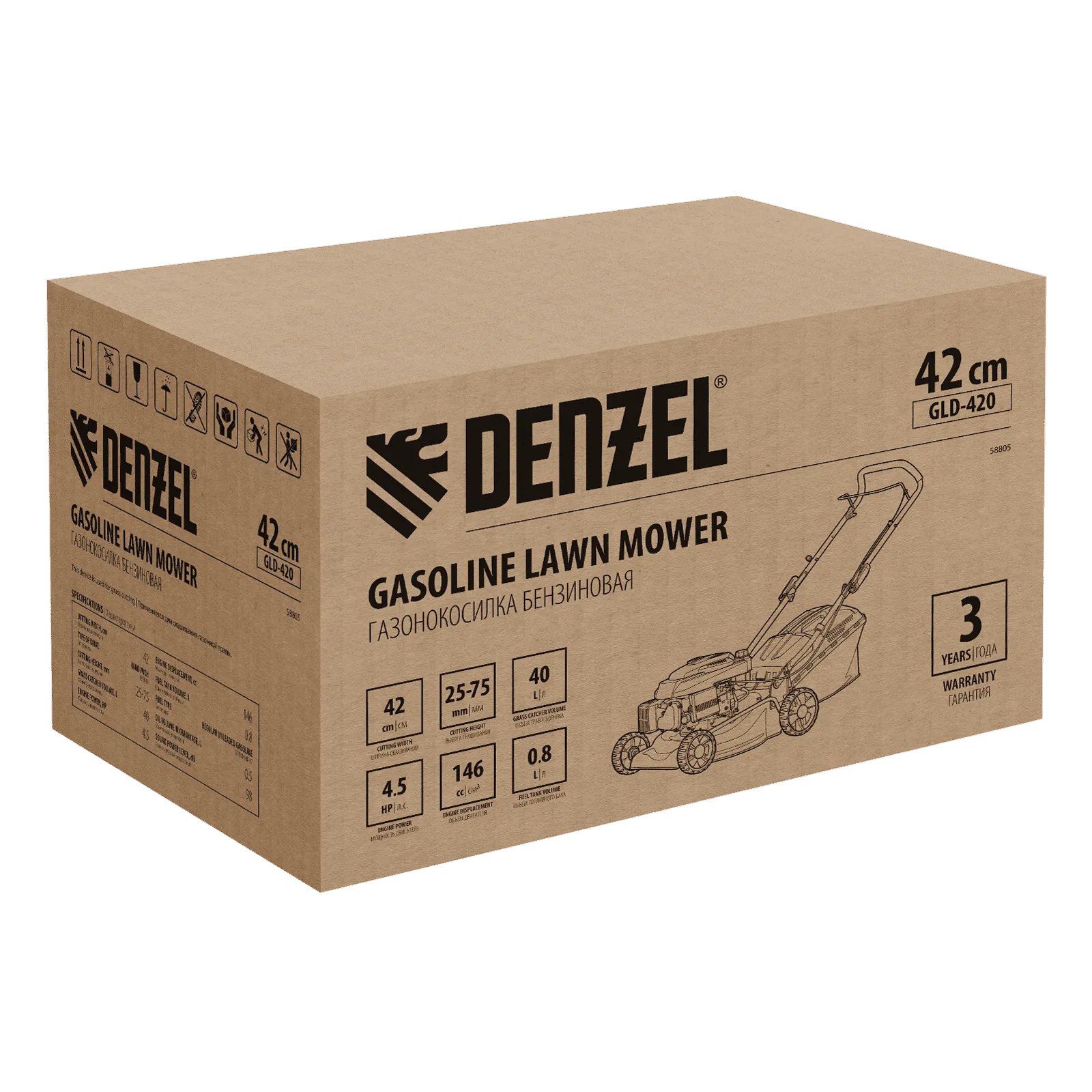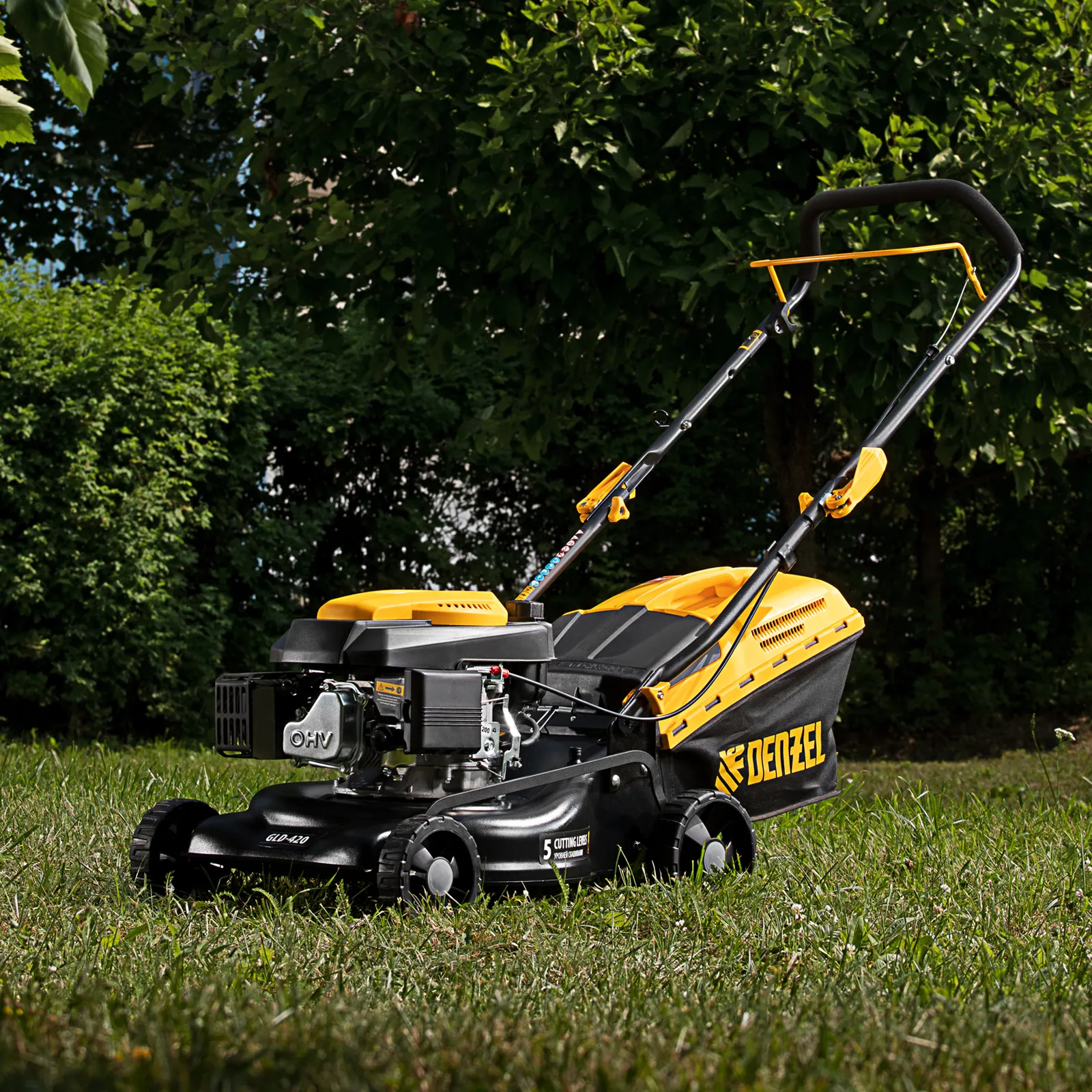 Бензиновая газонокосилка Denzel GLD-420 58805 с объемом двигателя 146 см куб., травосборником на 40 л, с шириной прохода 42 см, идеально подходит для благоустройства дачных территорий, огородов и ровных земельных участков. Ширина скашивания за один проход 42 см позволяет обрабатывать 1500 кв.м за 1 час. В зависимости от нагрузки, дозаправка топливного бака требуется через 40-60 минут. Мощность двигателя данной модели составляет 4,5 л.с.;Для создания идеальной дорожки, площадки для спортивных игр или другого типа покрова в газонокосилке предусмотрено 5 уровней скашивания. Поворачивая рычаг регулировки высоты покоса, Вы сможете самостоятельно выбрать желаемое значение в диапазоне 25-75 мм. Косилка способна срезать даже густую траву и стебли, потому что оснащена закаленным до твердости 45 HRC ножом.