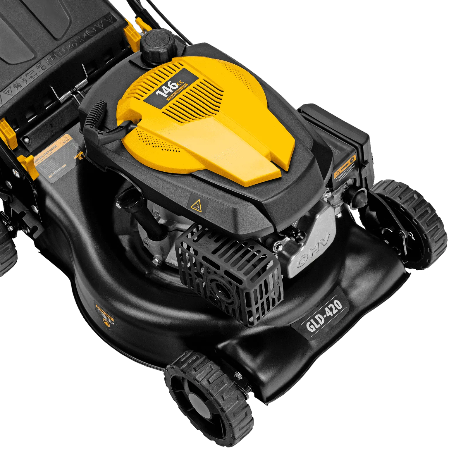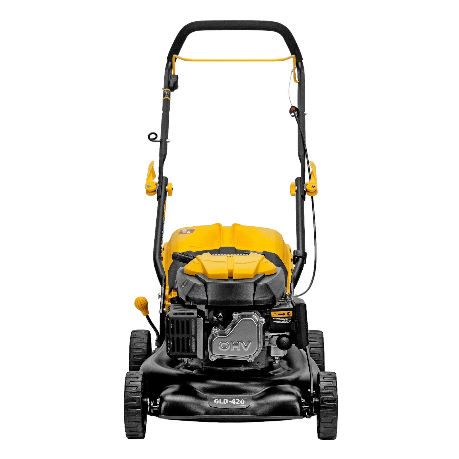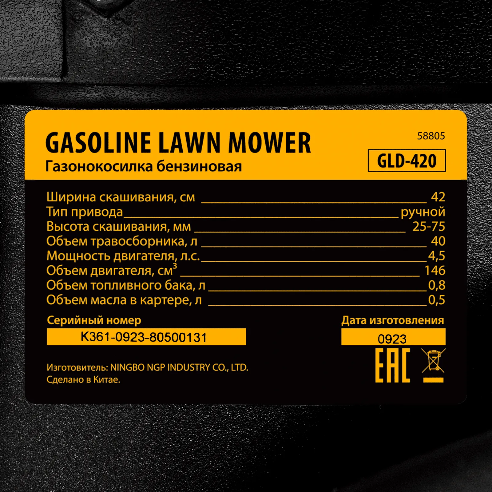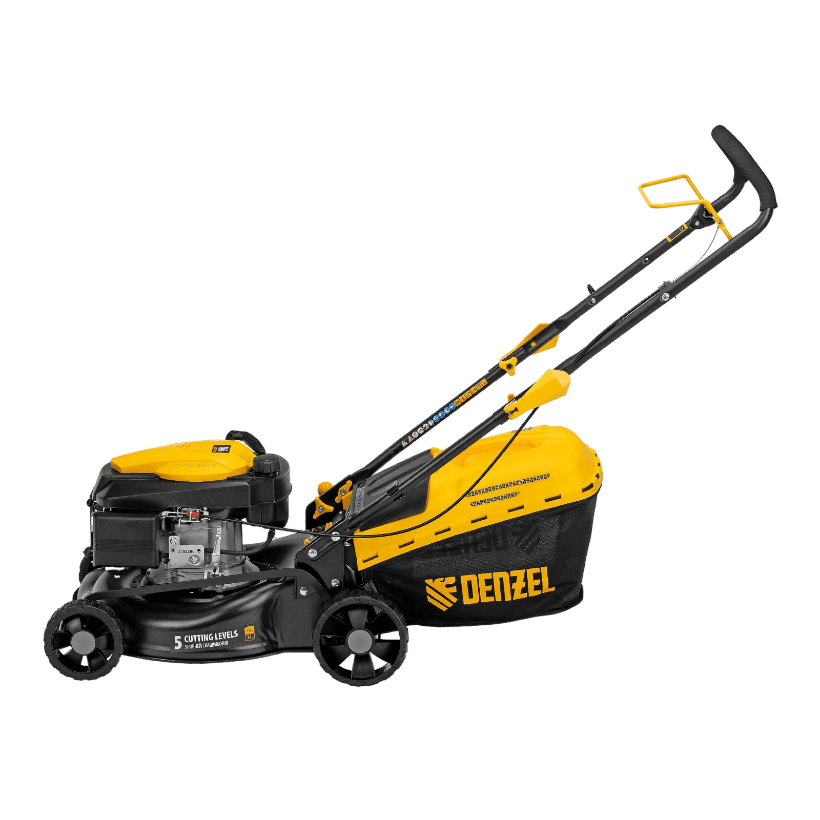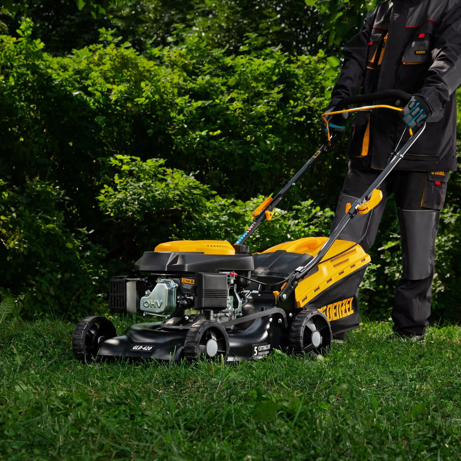 Бензиновая газонокосилка Denzel GLD-420 58805 с объемом двигателя 146 см куб., травосборником на 40 л, с шириной прохода 42 см, идеально подходит для благоустройства дачных территорий, огородов и ровных земельных участков. Ширина скашивания за один проход 42 см позволяет обрабатывать 1500 кв.м за 1 час. В зависимости от нагрузки, дозаправка топливного бака требуется через 40-60 минут. Мощность двигателя данной модели составляет 4,5 л.с.;Для создания идеальной дорожки, площадки для спортивных игр или другого типа покрова в газонокосилке предусмотрено 5 уровней скашивания. Поворачивая рычаг регулировки высоты покоса, Вы сможете самостоятельно выбрать желаемое значение в диапазоне 25-75 мм. Косилка способна срезать даже густую траву и стебли, потому что оснащена закаленным до твердости 45 HRC ножом.