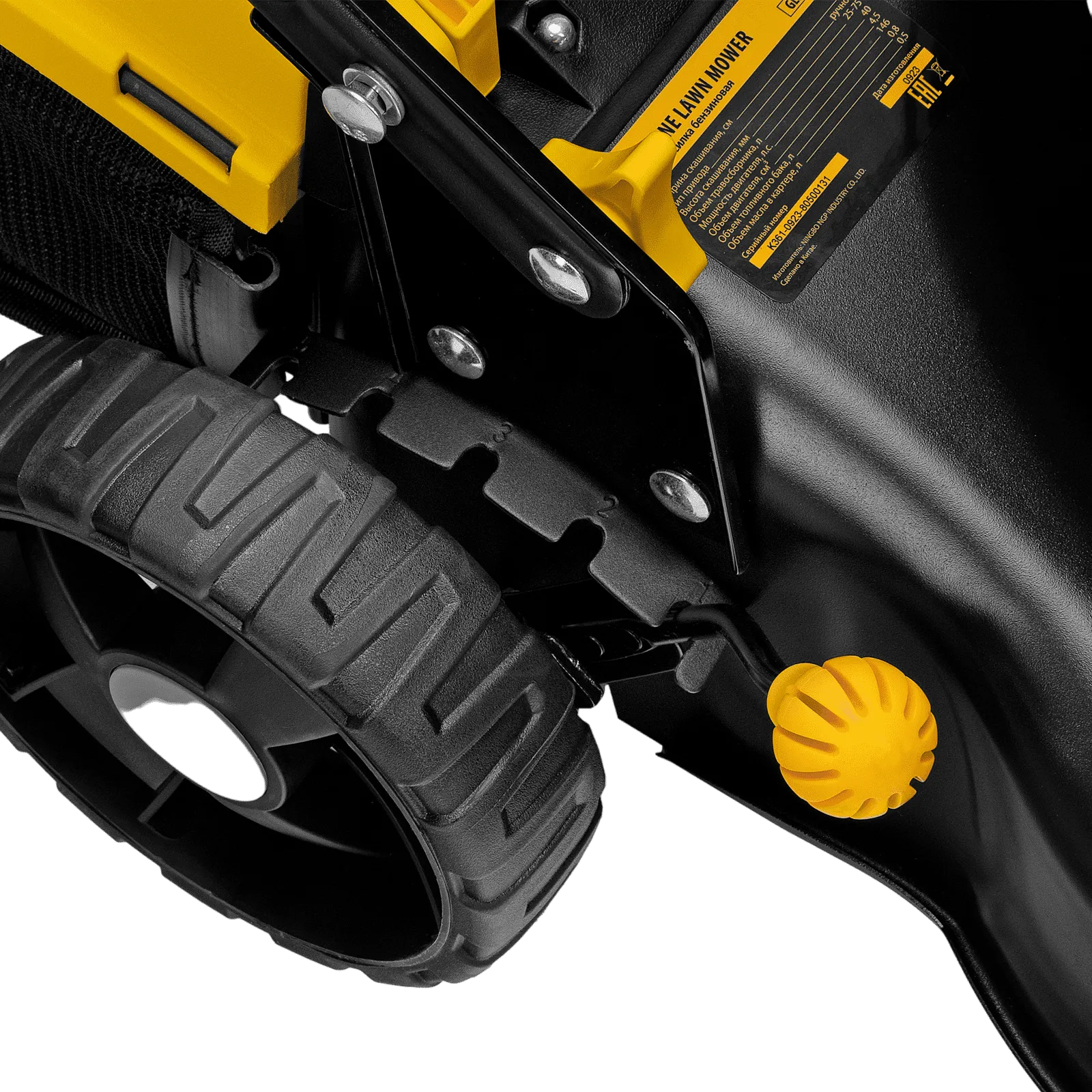 - Увеличенные задние колеса — косилка отличается хорошей проходимостью и при этом не повреждает газон.