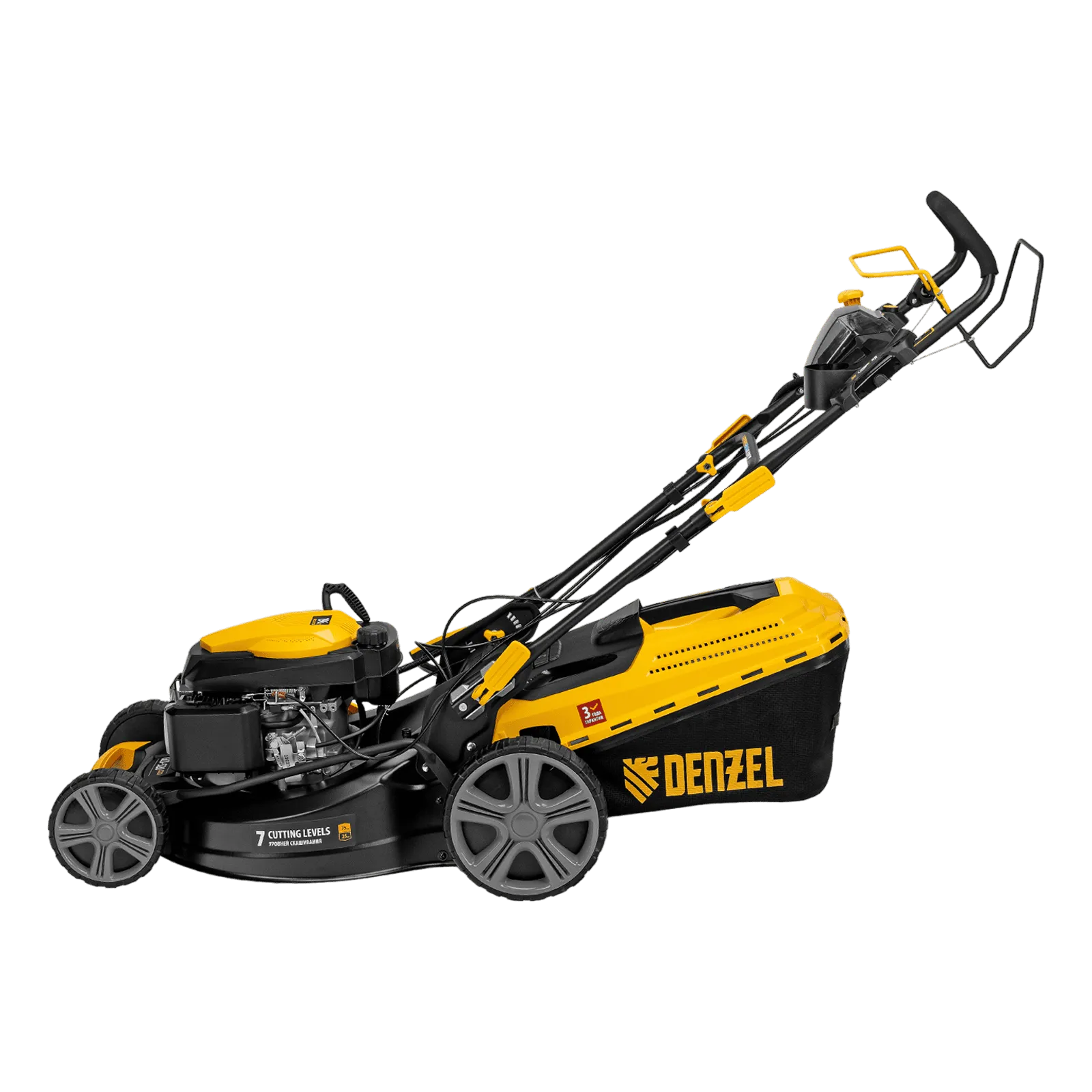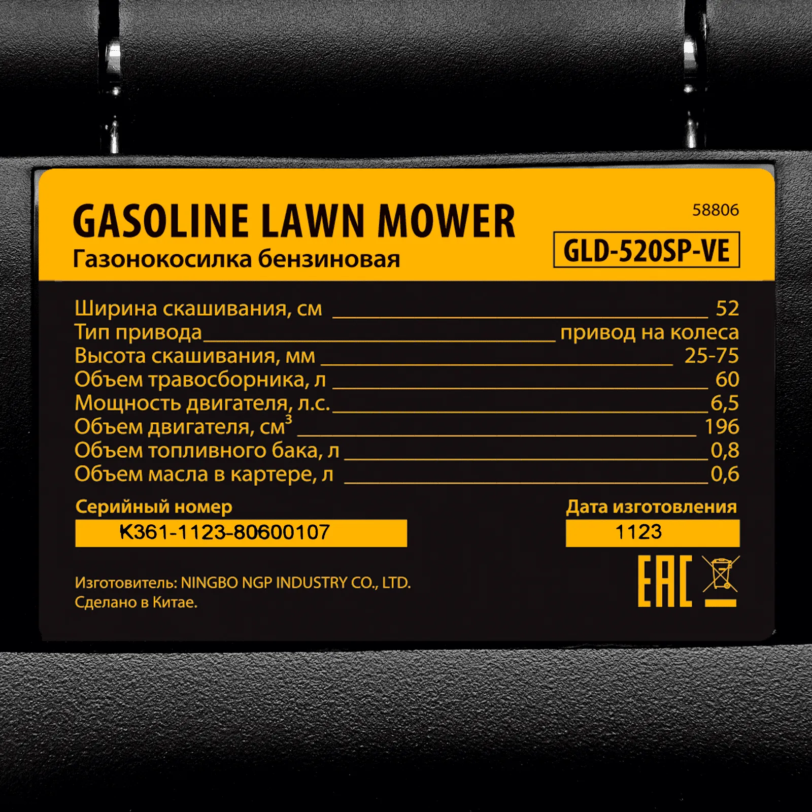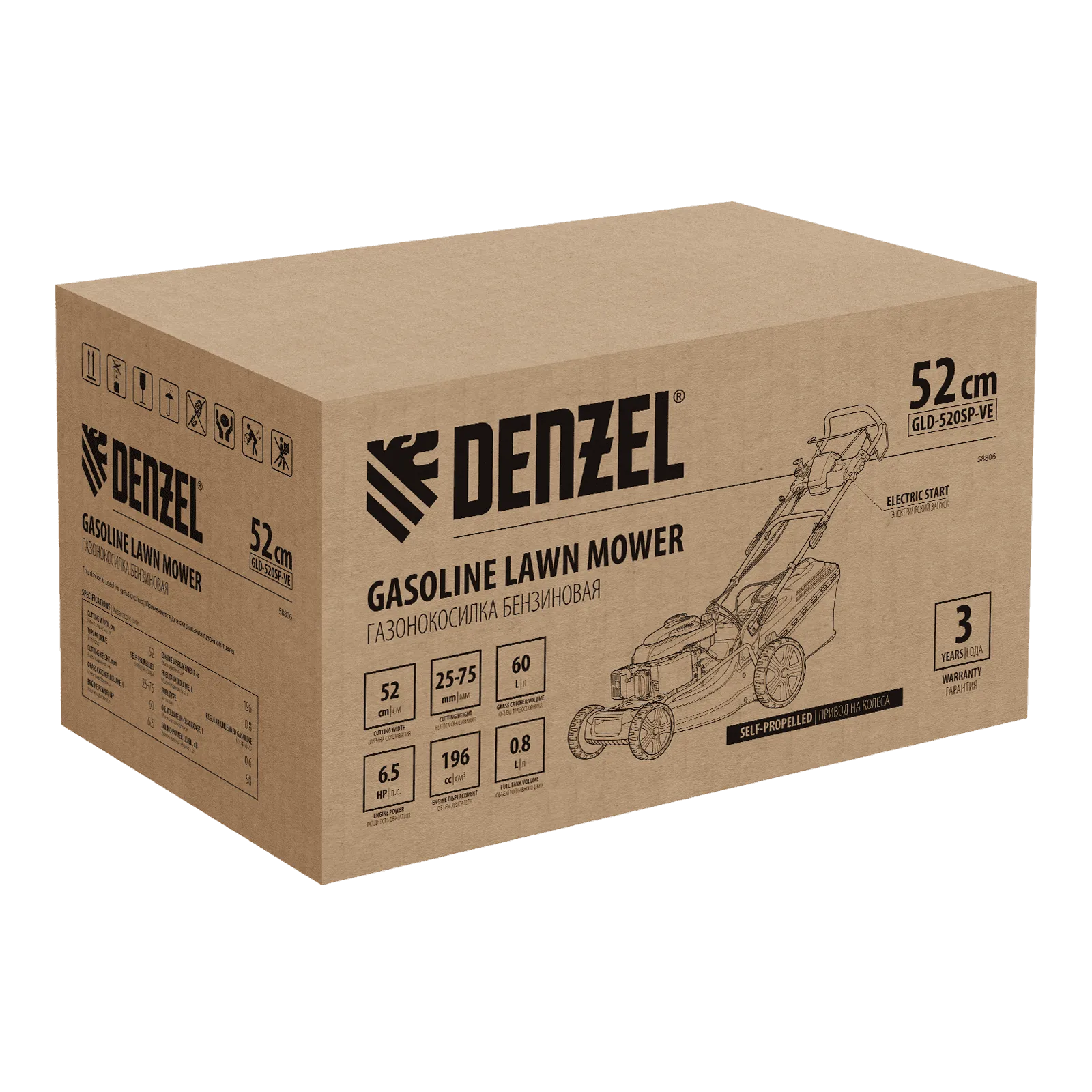 Бензиновая газонокосилка Denzel GLD-520SP-VE 58806 с приводом на колеса и вариатором оснащена двигателем объемом 196 см³ и электрическим стартом. Обеспечивает ширину скашивания 52 см за один проход и собирает траву в контейнер объемом 60 л. Идеально подходит для благоустройства дачной территории, обновления газонов и дорожек. Благодаря двигателю мощностью 6,5 л.с. справляется даже с густым бурьяном.;Ширина прохода составляет 52 см, за 1 час можно обработать участок площадью более 1800 м². Высота среза регулируется при помощи рычага в соответствии с типом газона (всего 7 уровней, от 25 до 75 мм). Можно получить идеально ровный и низко подстриженный парадный покров или площадку для спортивных игр, функциональную лужайку с травой 4-6 см или садово-парковый газон с максимально высокой растительностью.