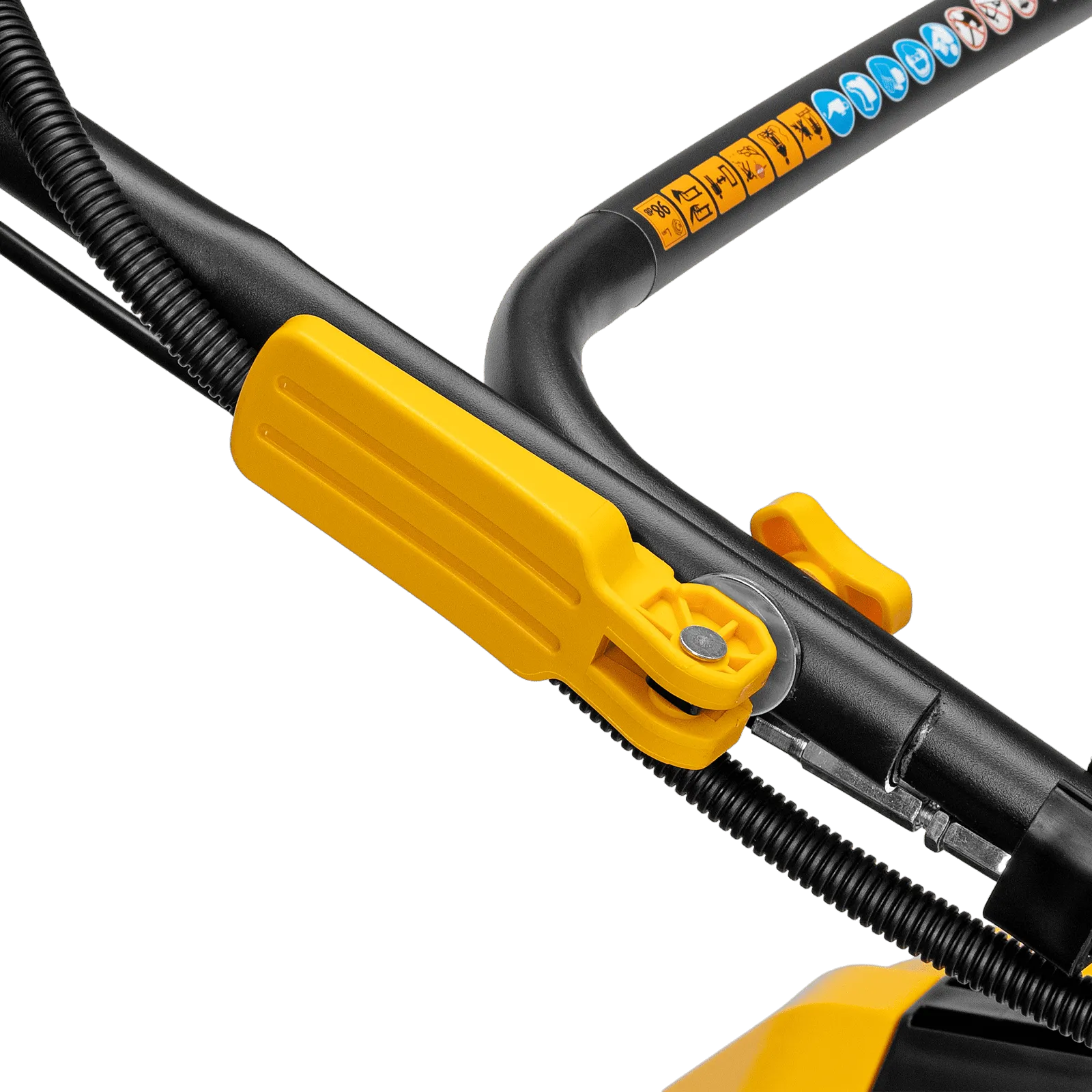 - Регулировка скорости движения — низкая частота вращения колес оптимальна для скашивания густой травы и работы на ограниченном участке, высокая — для подстригания редко растущей и молодой травы.