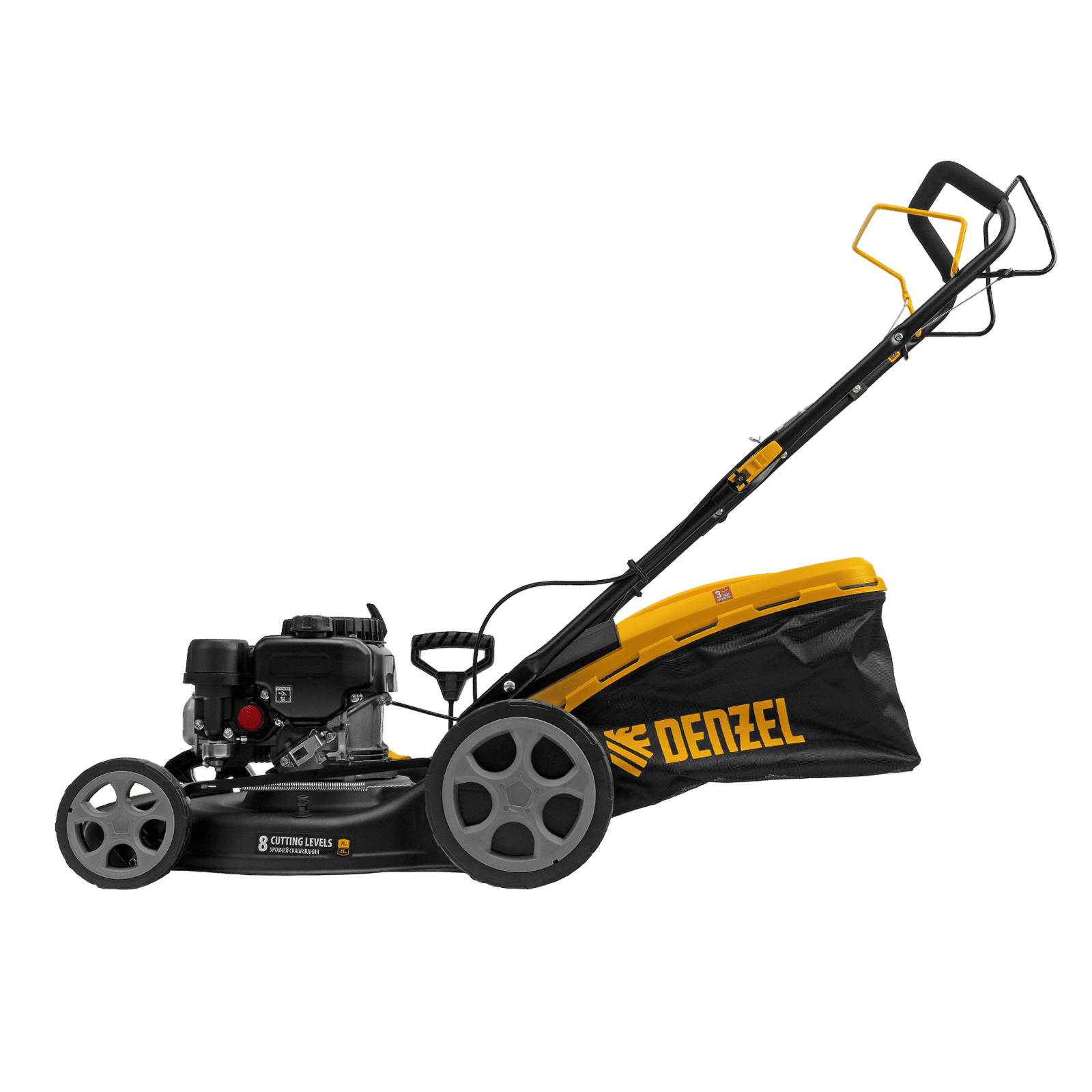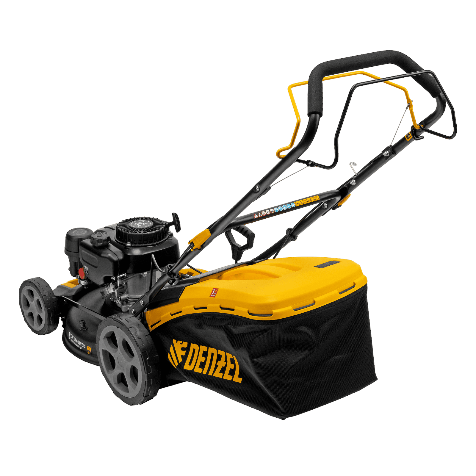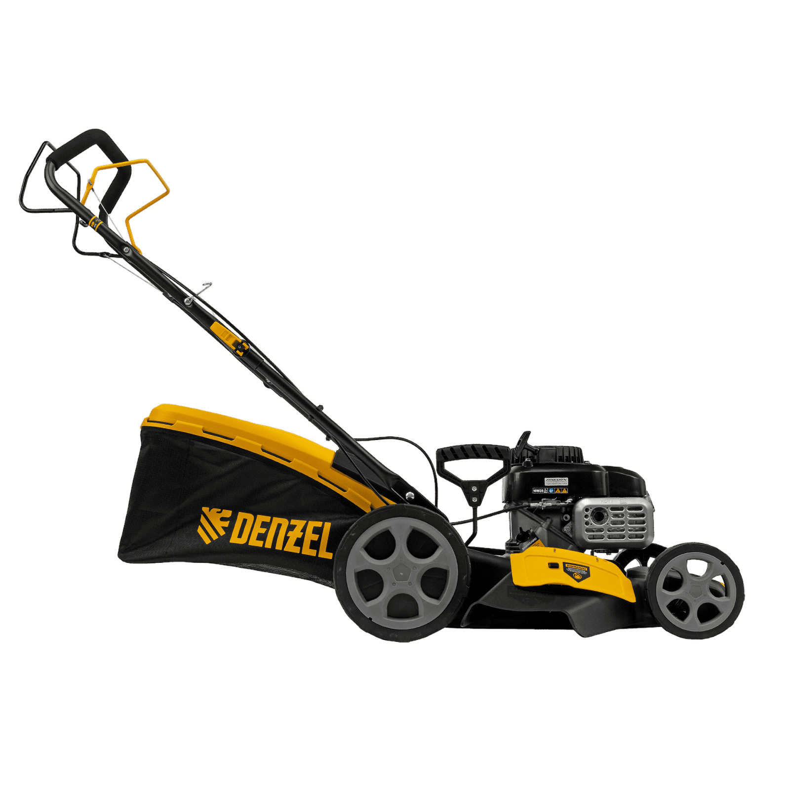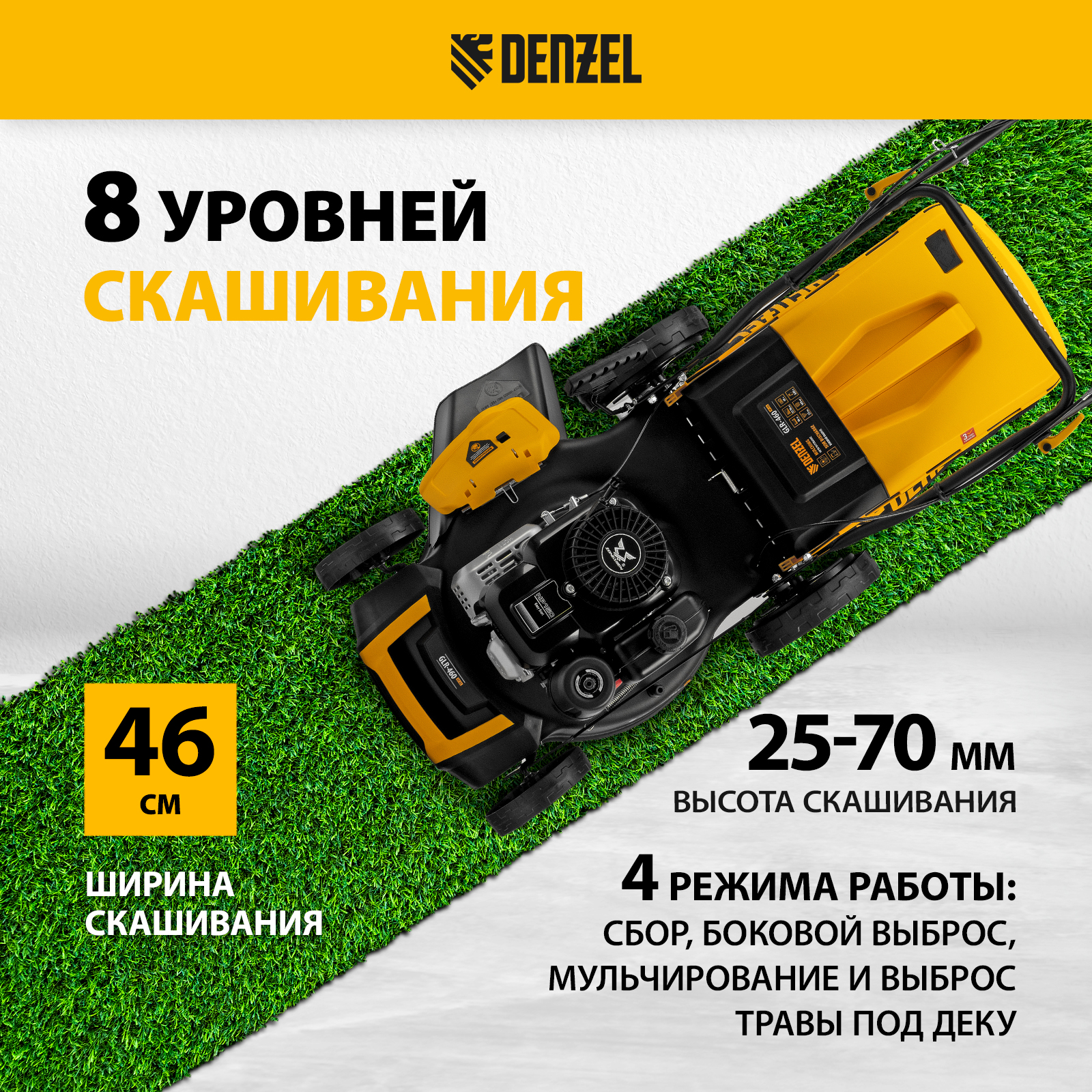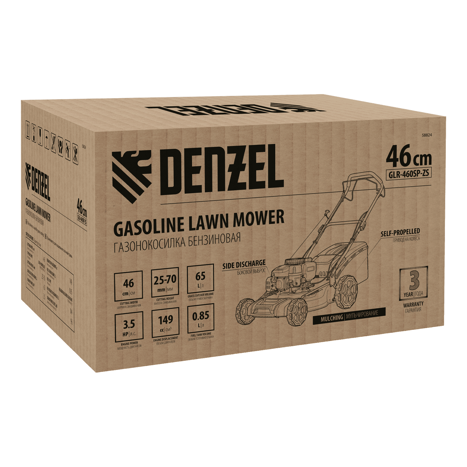 Бензиновая газонокосилка Denzel GLR-460SP-ZS 58824 с приводом на колеса и травосборником вместимостью 65 л, с надежным и экономичным 4-тактным двигателем объемом 149 см3, обеспечивает ширину прохода 46 см. Предназначена для стрижки газонов и скашивания травы в саду, будет полезна для ухода за дачным участком или придомовой территорией. Высота скашивания легко регулируется одним рычагом в диапазоне 25-70 мм (предусмотрено 8 уровней).