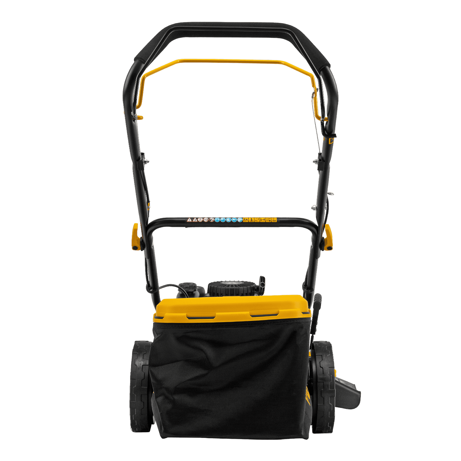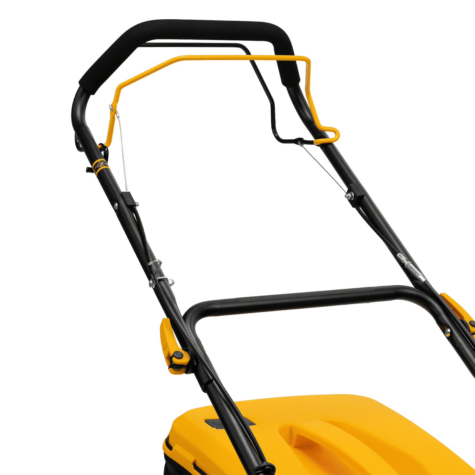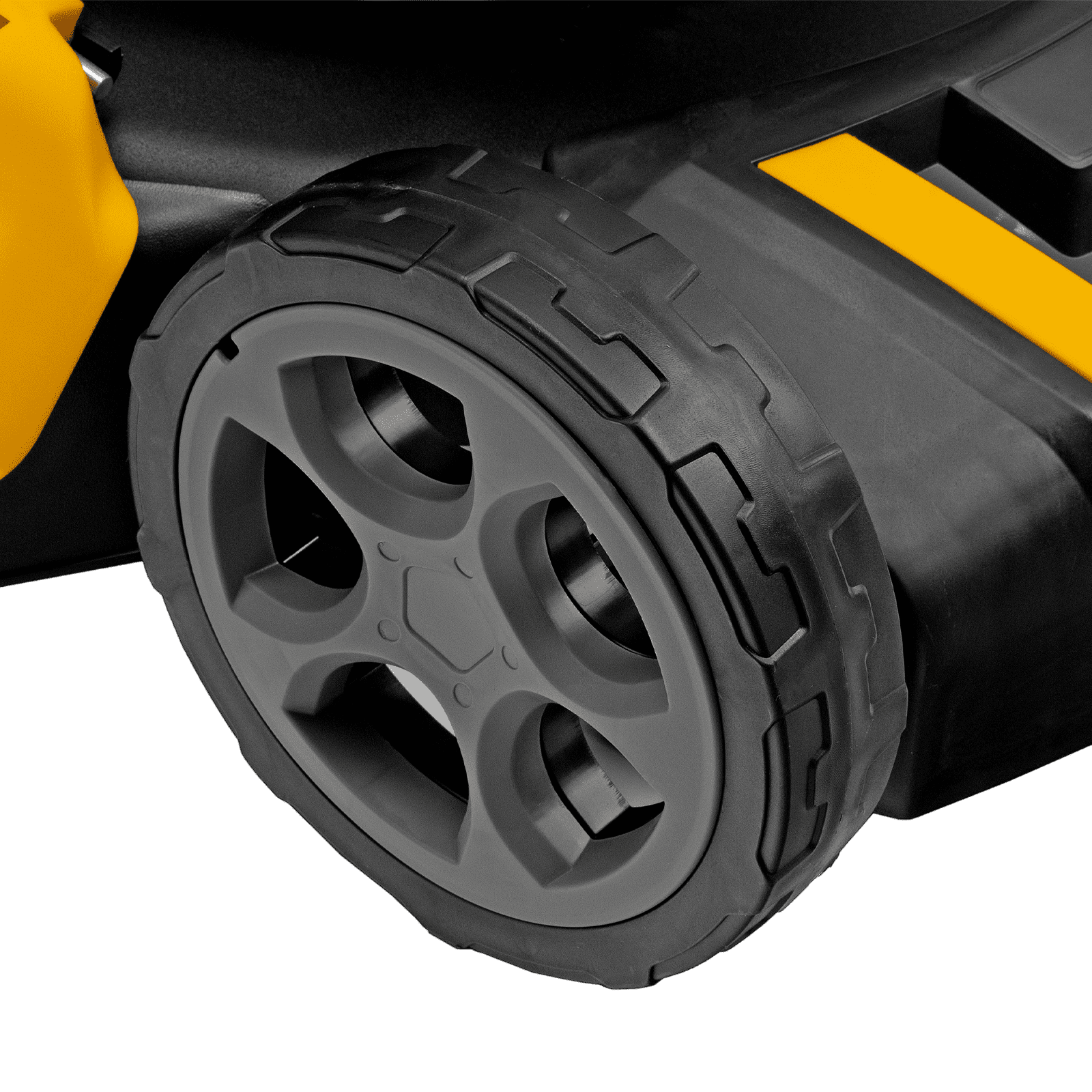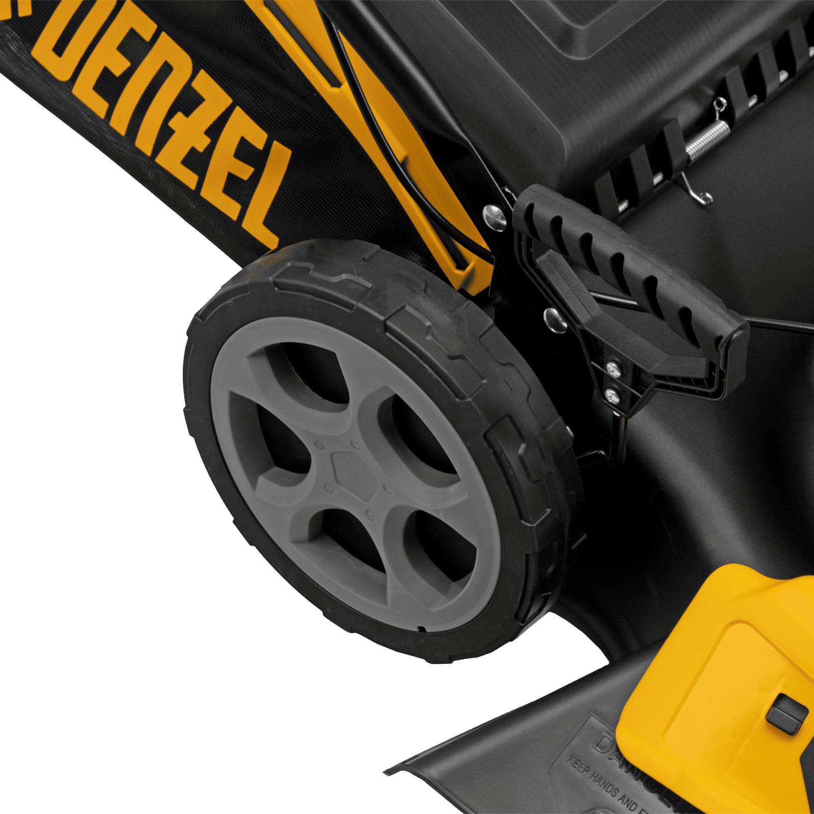 - Широкие колеса Eco-friendly — газонокосилка легко проходит по газону, не повреждая его.