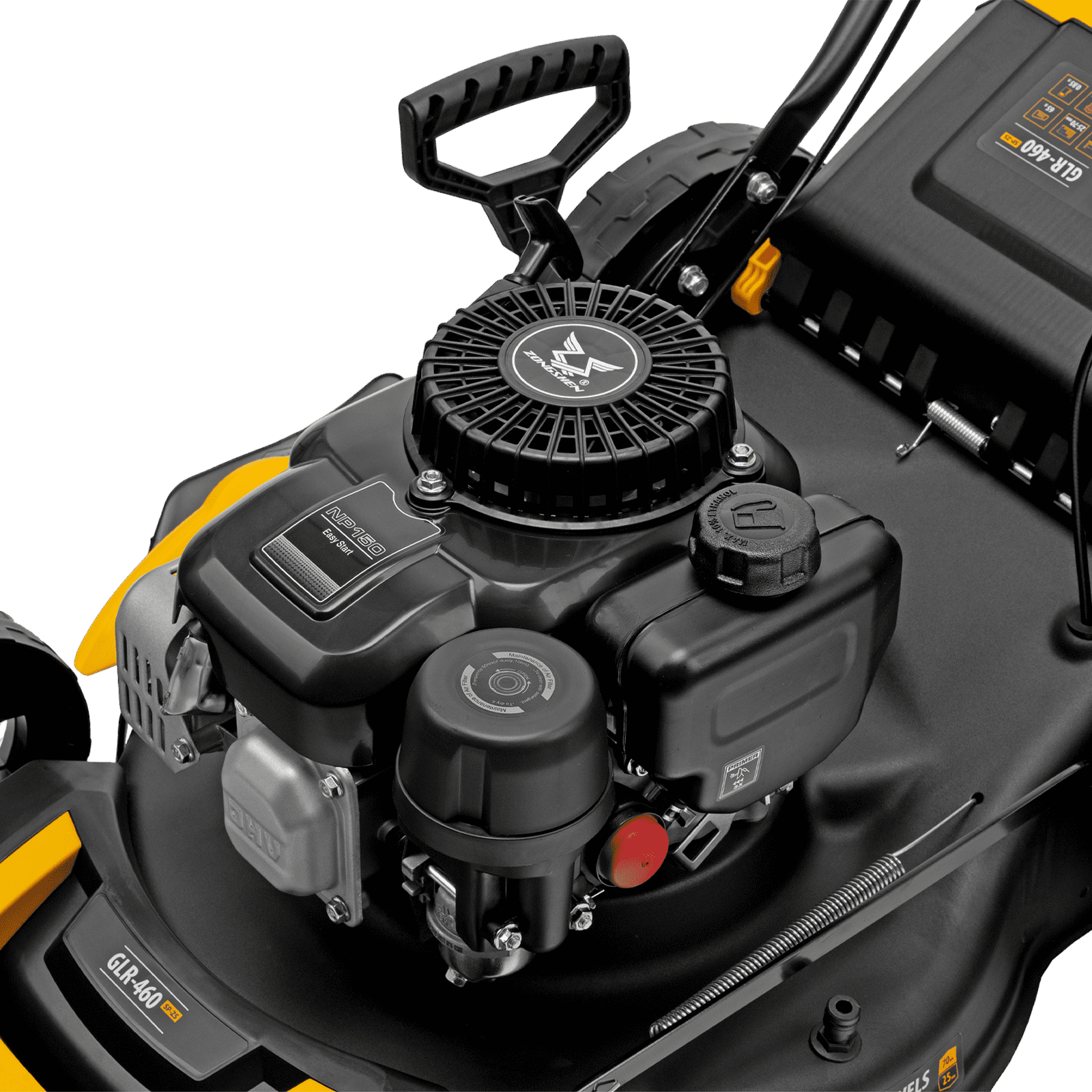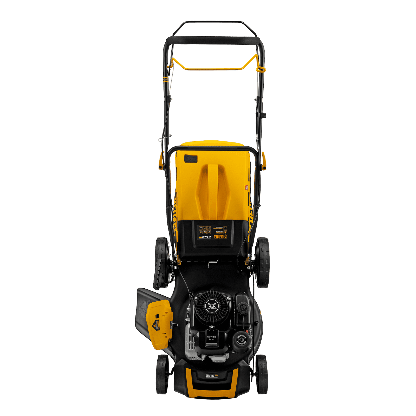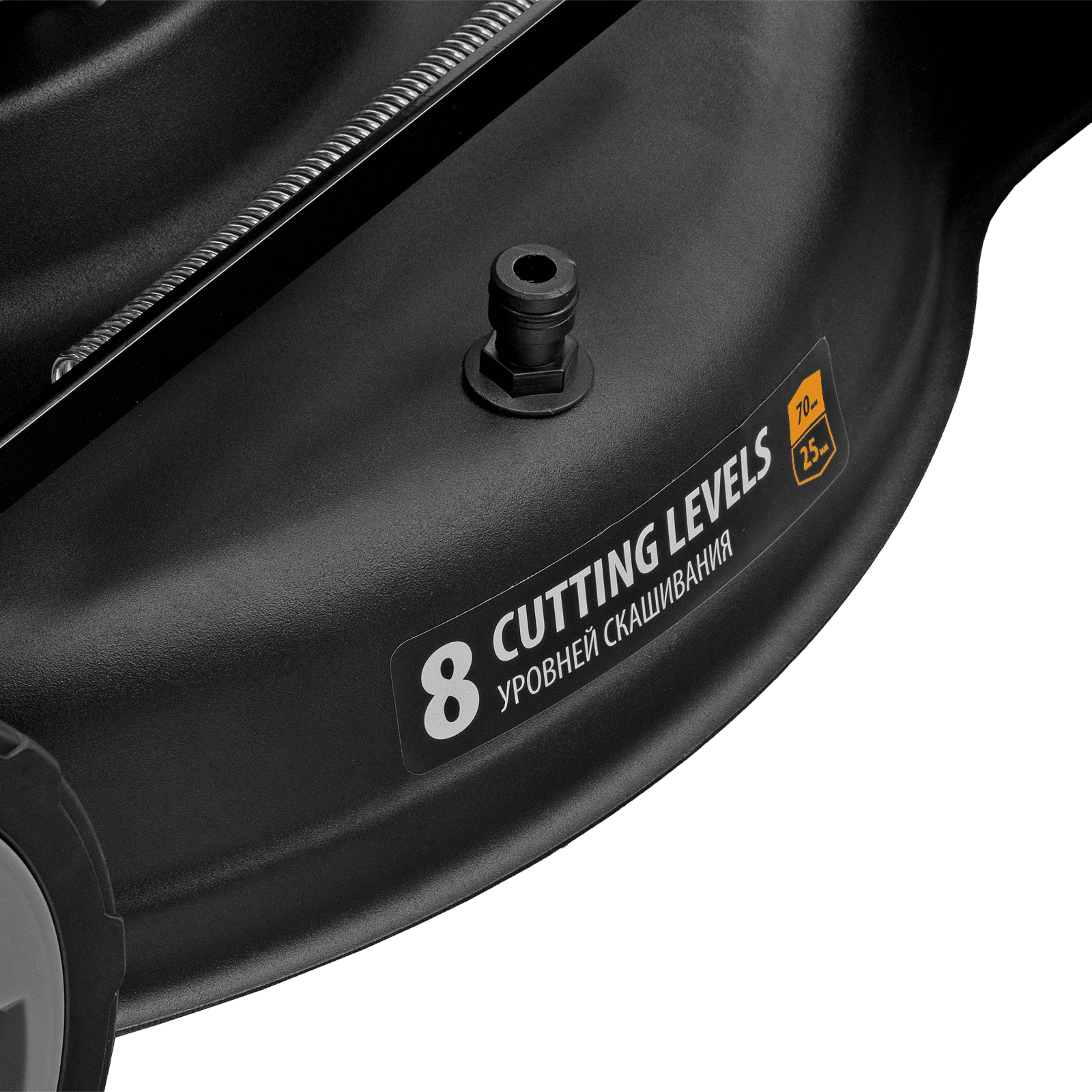 - Широкий функционал «4 в 1» — газонокосилка работает в режимах сбора травы в объемный контейнер, мульчирования, бокового выброса, а также выброса травы под деку.