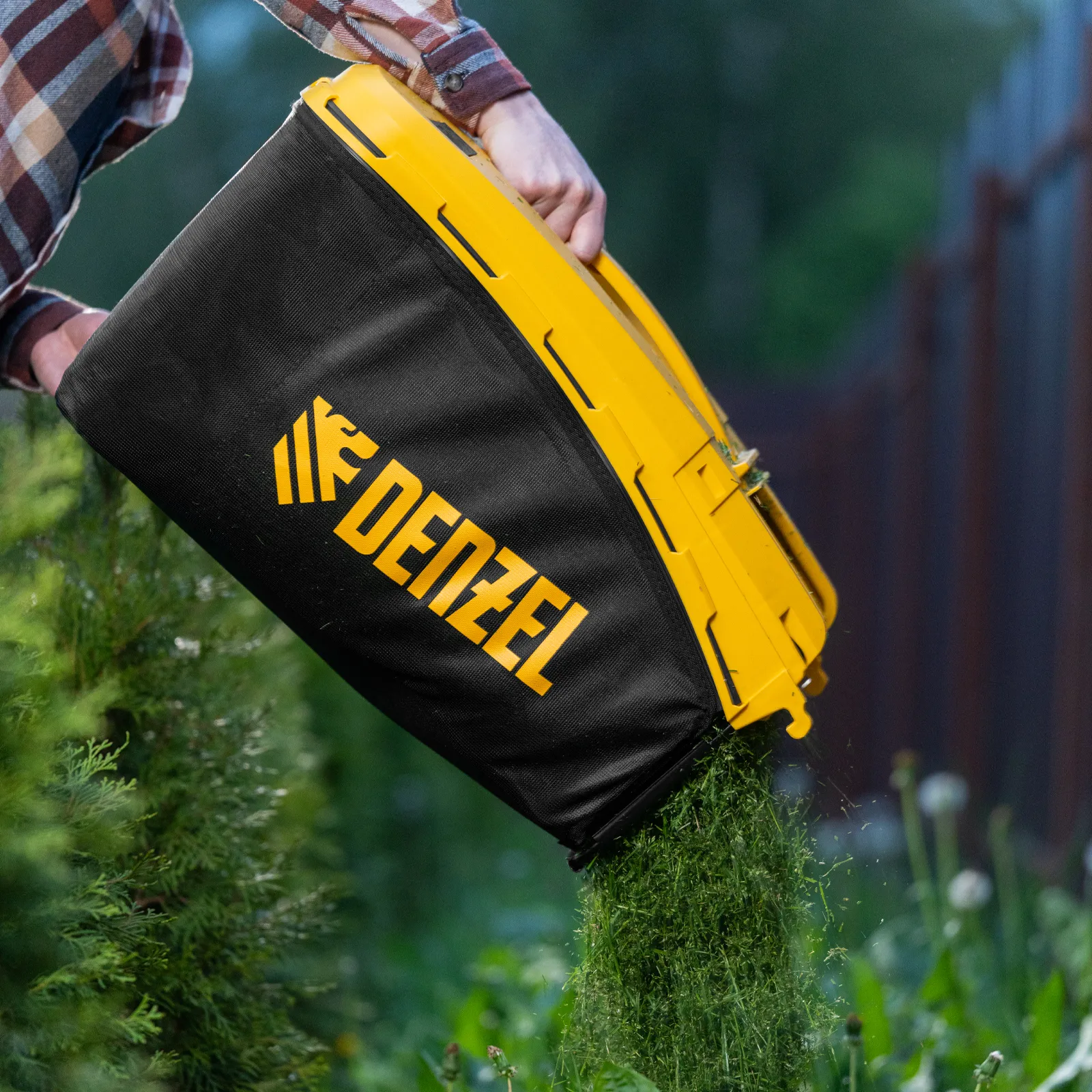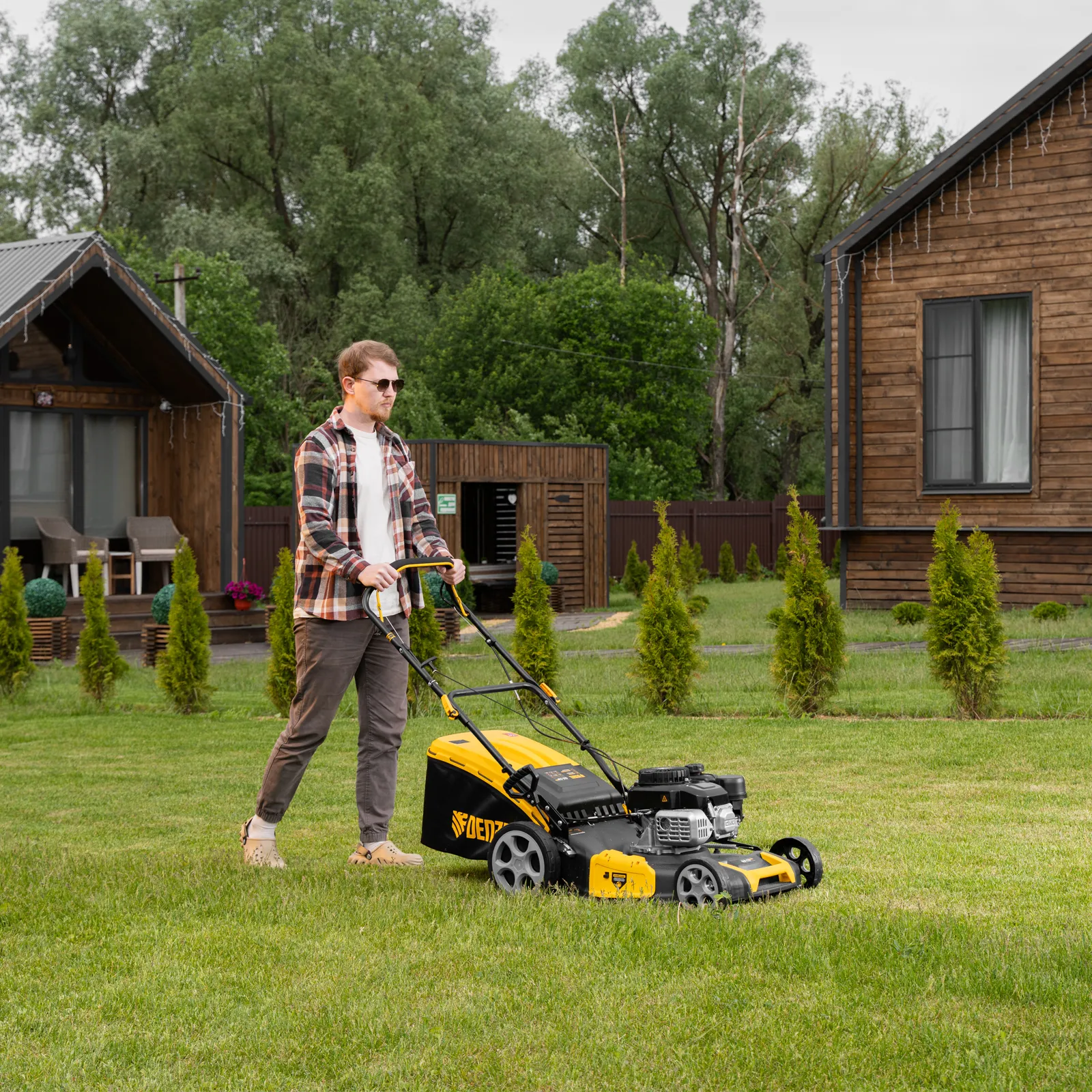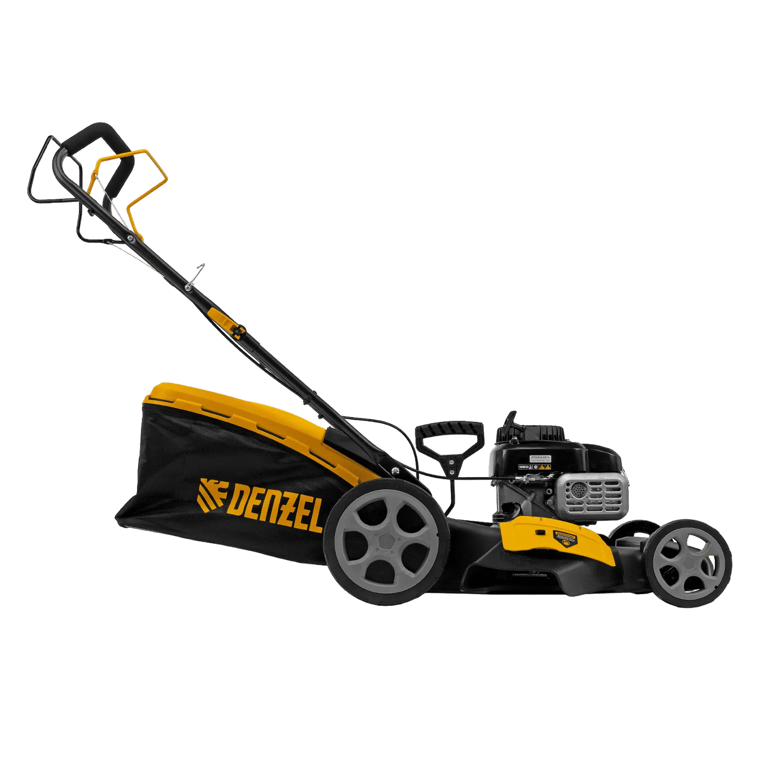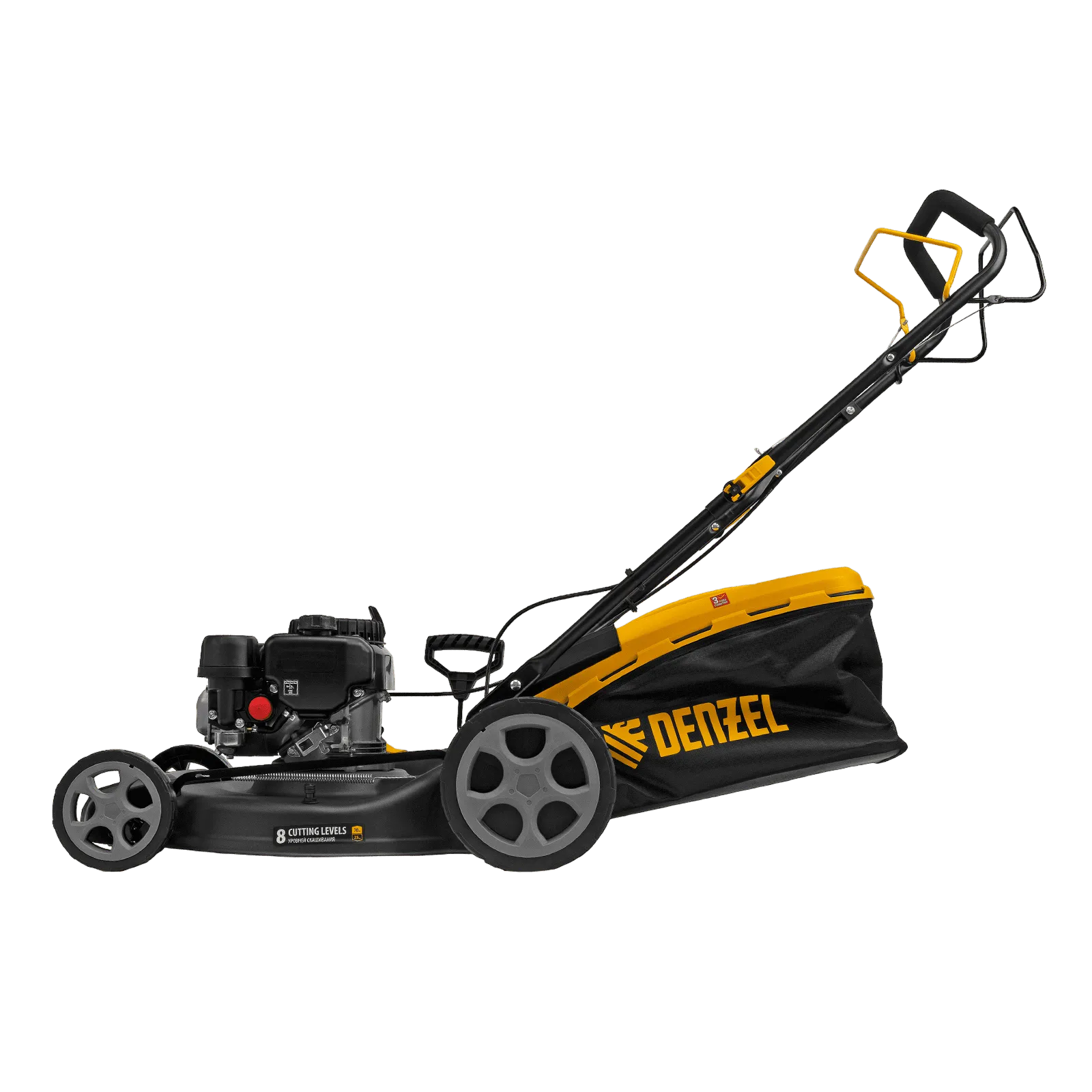 Бензиновая газонокосилка Denzel GLR-510SP-ZS 58825 с приводом на колеса и травосборником вместимостью 65 л, с надежным и экономичным 4-тактным двигателем объемом 171 см3, обеспечивает ширину прохода 51 см. Предназначена для стрижки газонов и скашивания травы в саду, будет полезна для ухода за дачным участком или придомовой территорией большой площади. Высота скашивания легко регулируется одним рычагом в диапазоне 25-70 мм (предусмотрено 8 уровней).