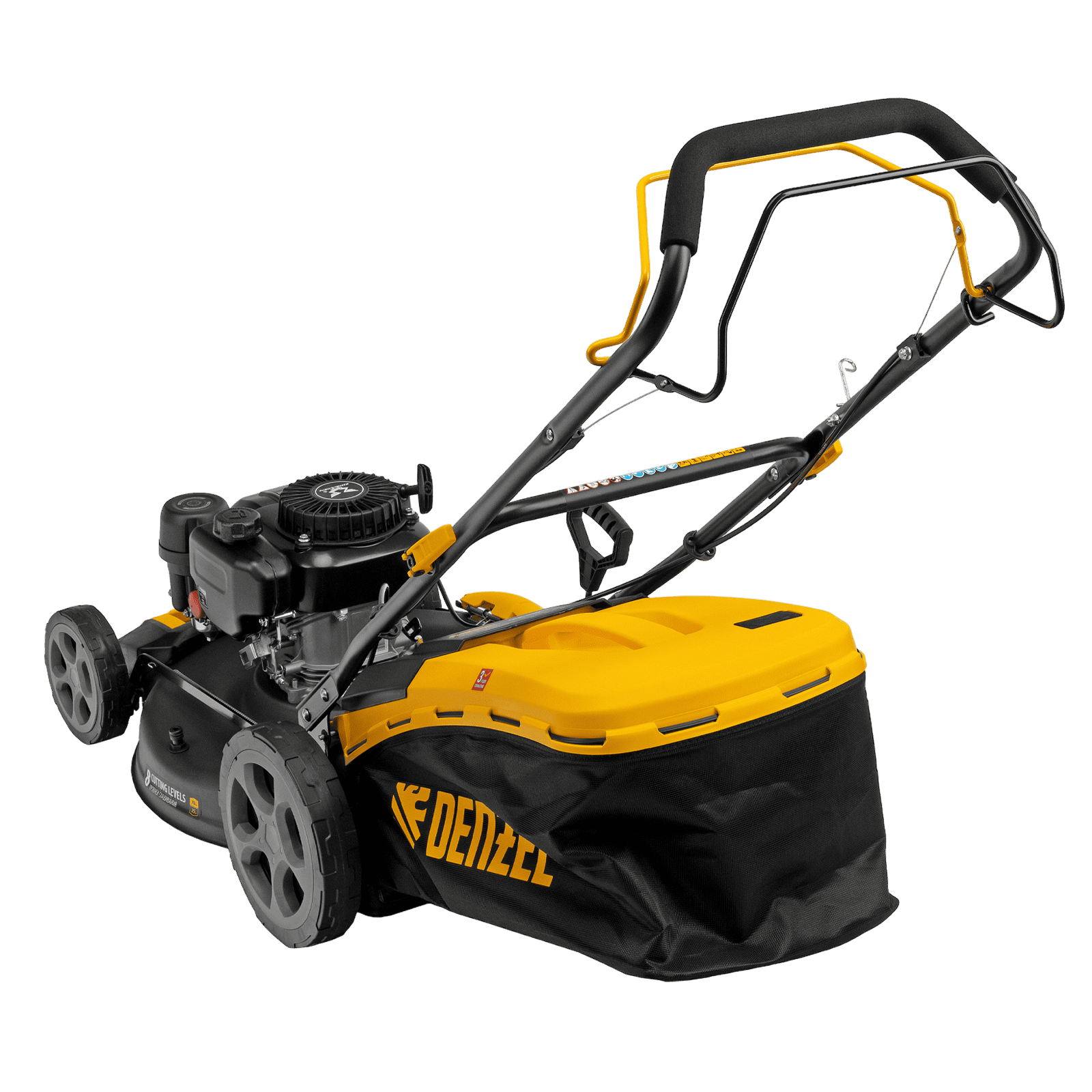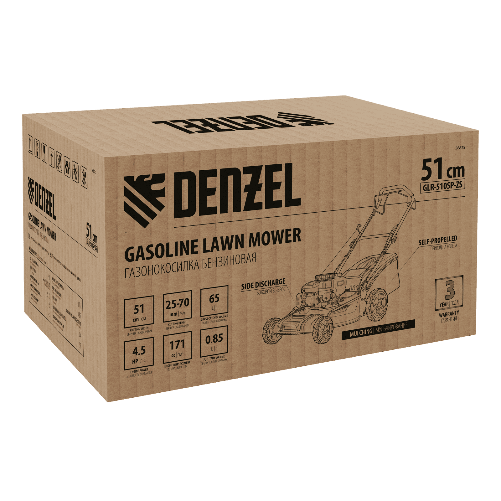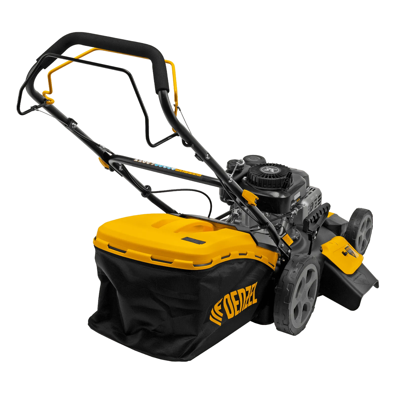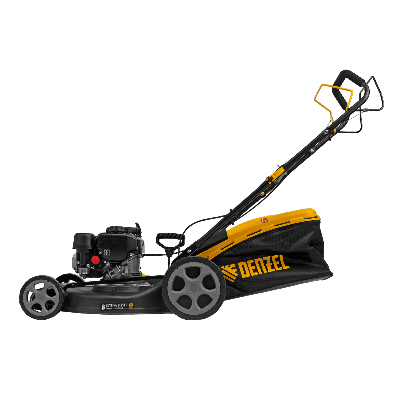 Бензиновая газонокосилка Denzel GLR-510SP-ZS 58825 с приводом на колеса и травосборником вместимостью 65 л, с надежным и экономичным 4-тактным двигателем объемом 171 см3, обеспечивает ширину прохода 51 см. Предназначена для стрижки газонов и скашивания травы в саду, будет полезна для ухода за дачным участком или придомовой территорией большой площади. Высота скашивания легко регулируется одним рычагом в диапазоне 25-70 мм (предусмотрено 8 уровней).
