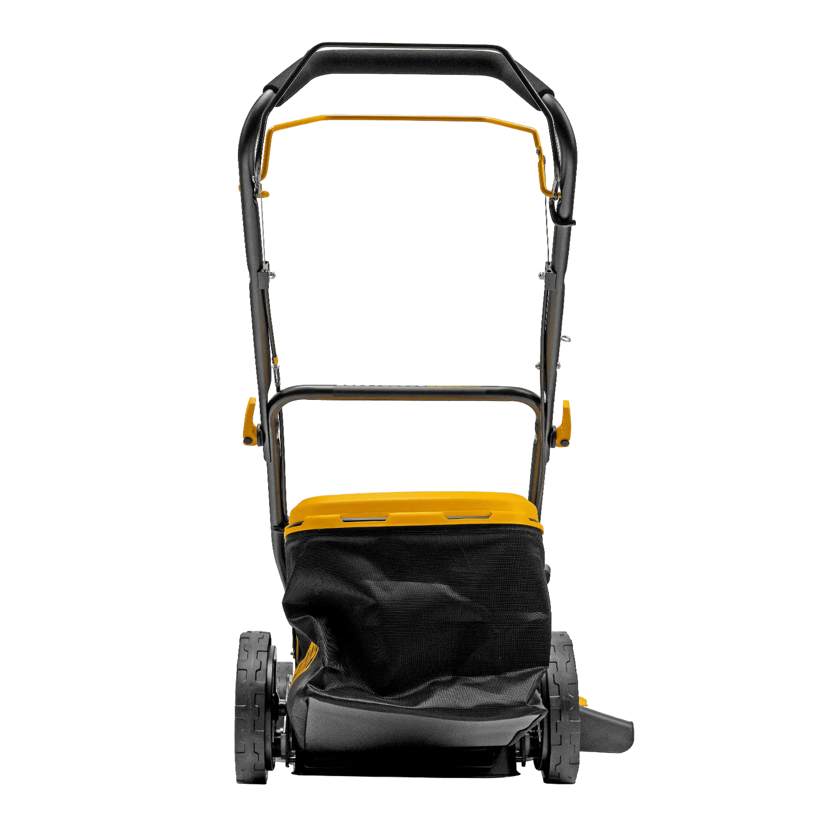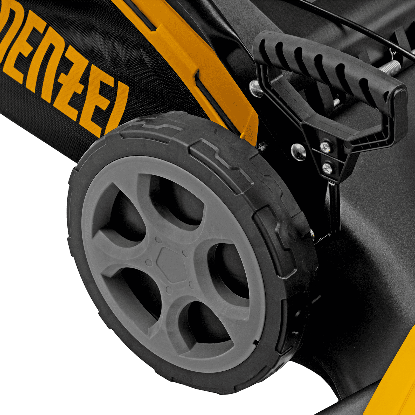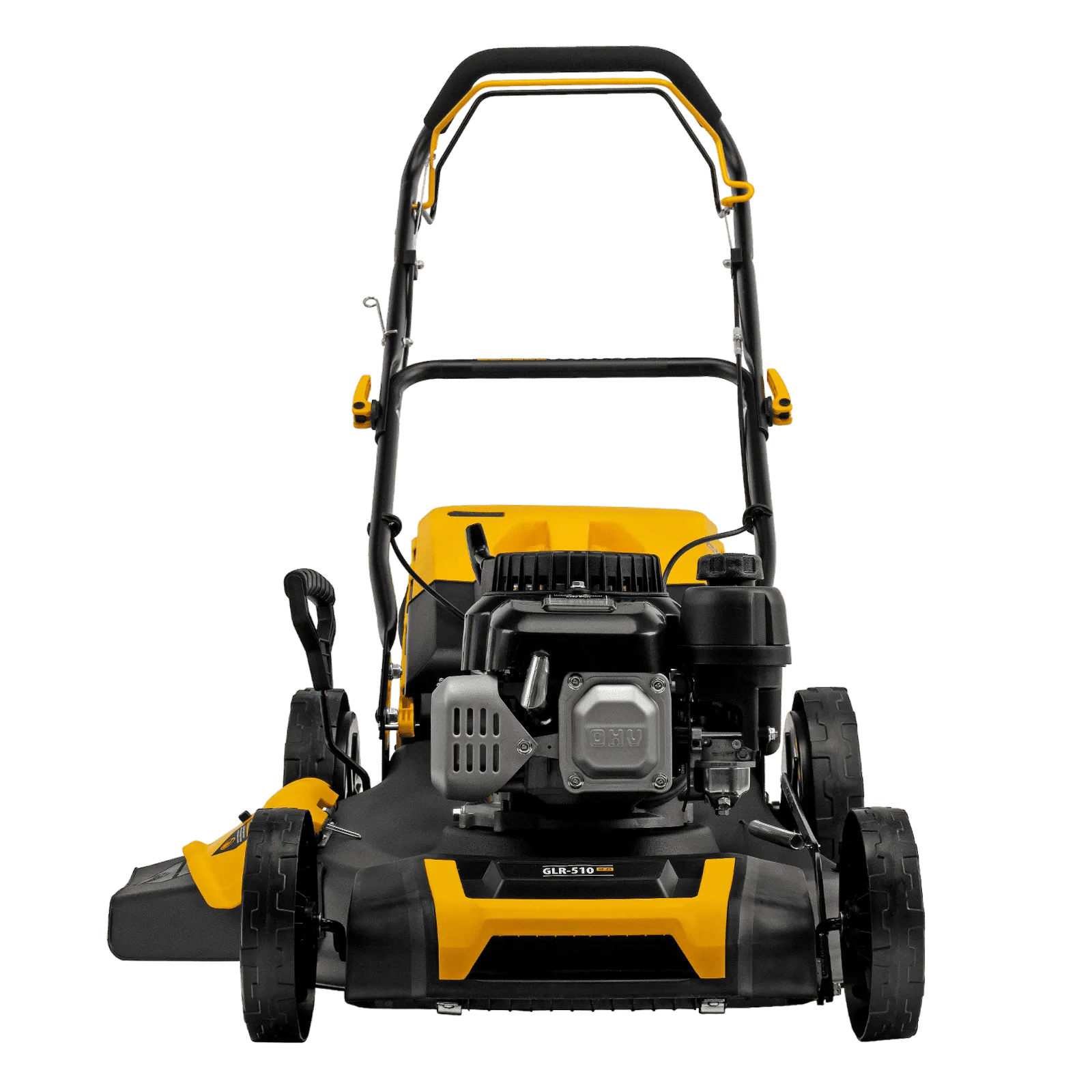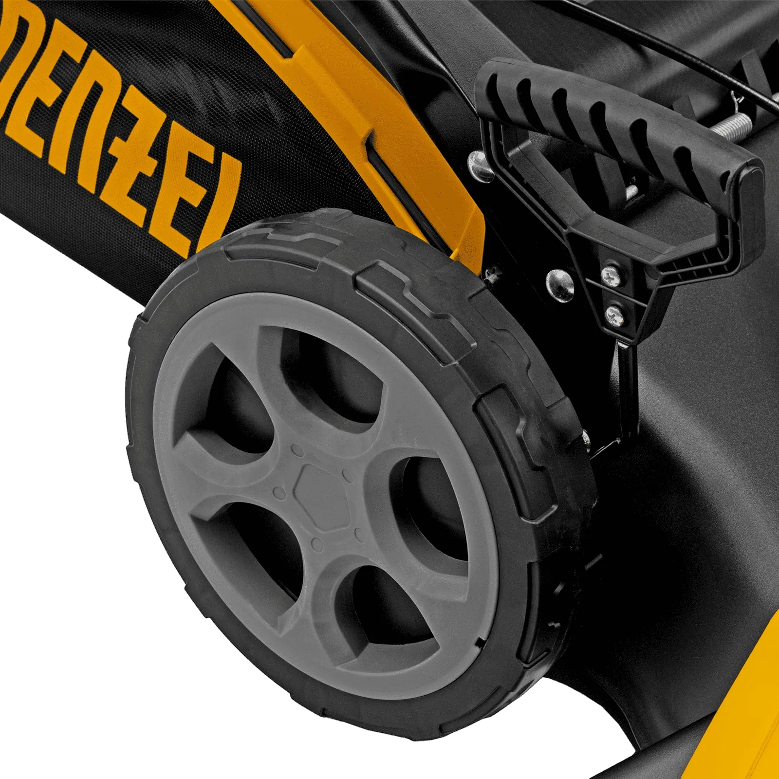 - Широкие колеса Eco-friendly — газонокосилка легко проходит по газону, не повреждая его.